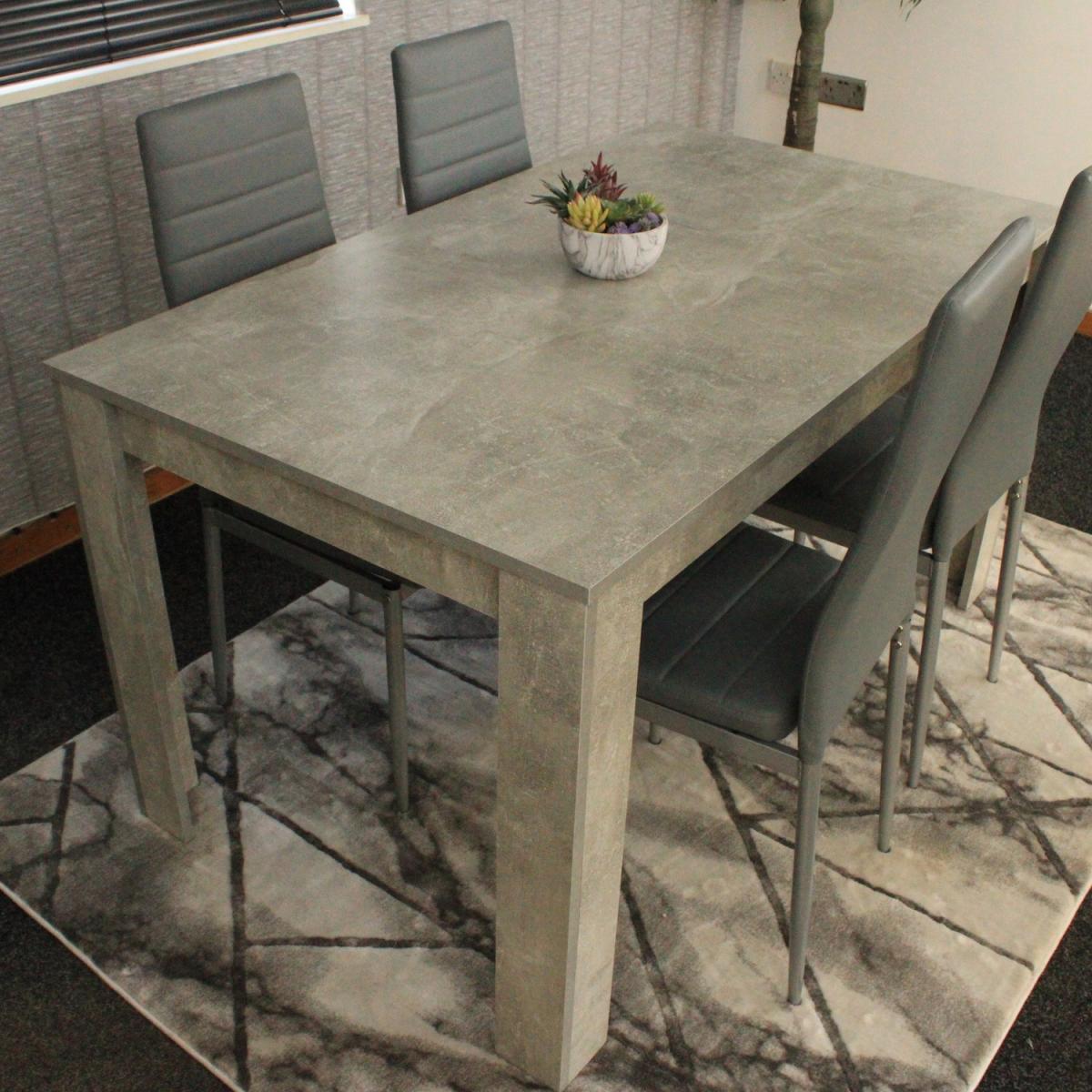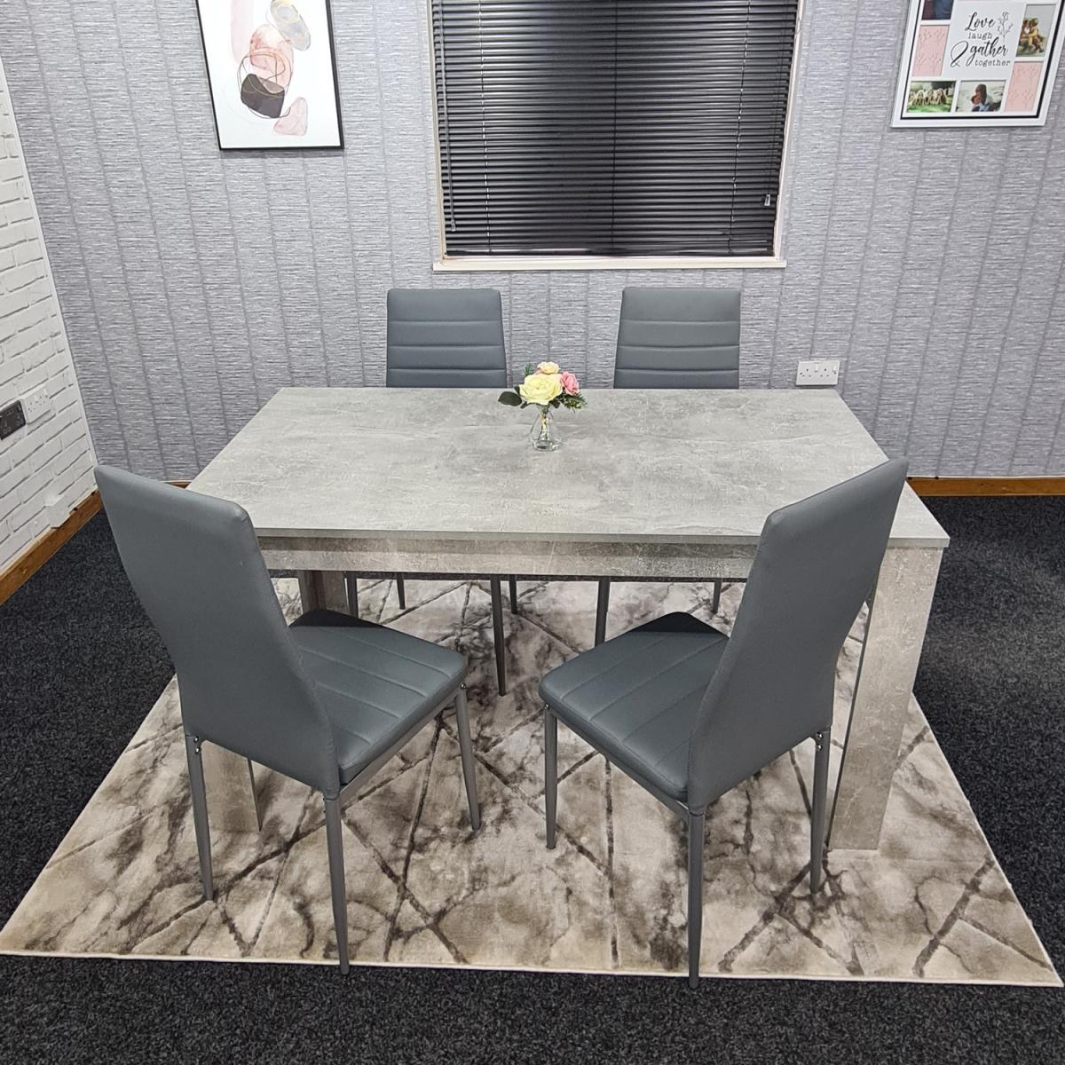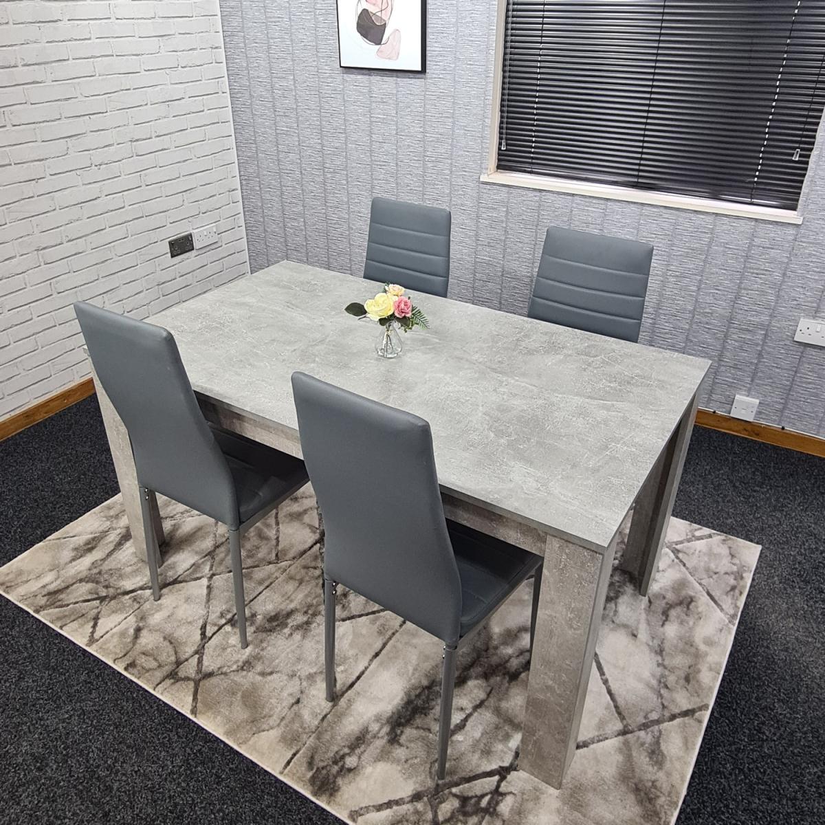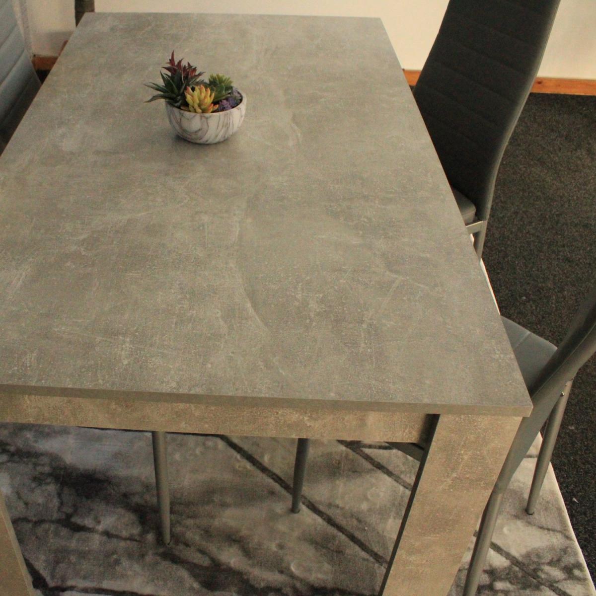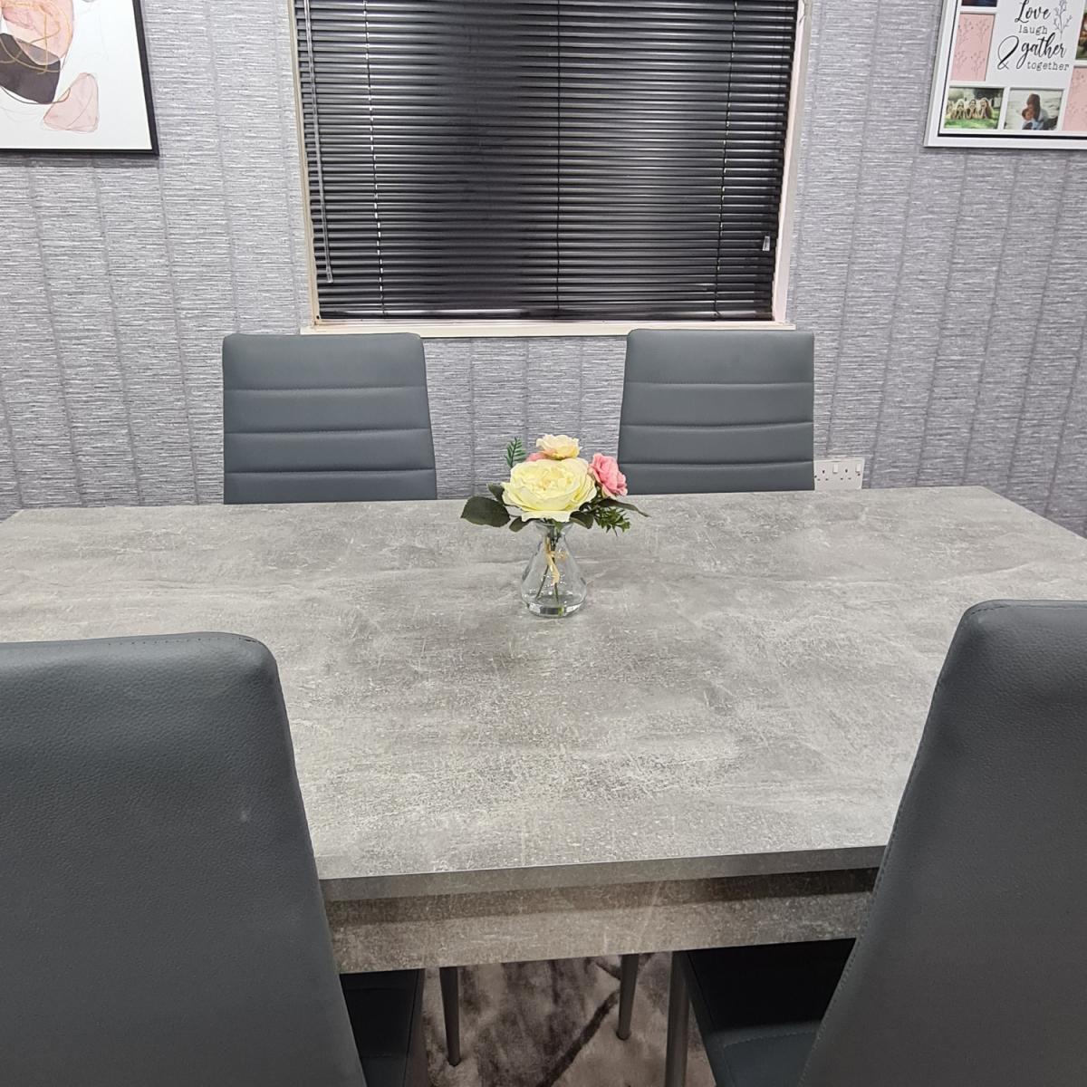 A Stunning wooden Dining Table set comes with 4 gorgeous grey metal chairs. The table is made from MDF wood and has a melamine laminated light stone grey effect. Transforming your dining room and looks so spectacular and unique. The item comes flat packed and requires some home assembly.