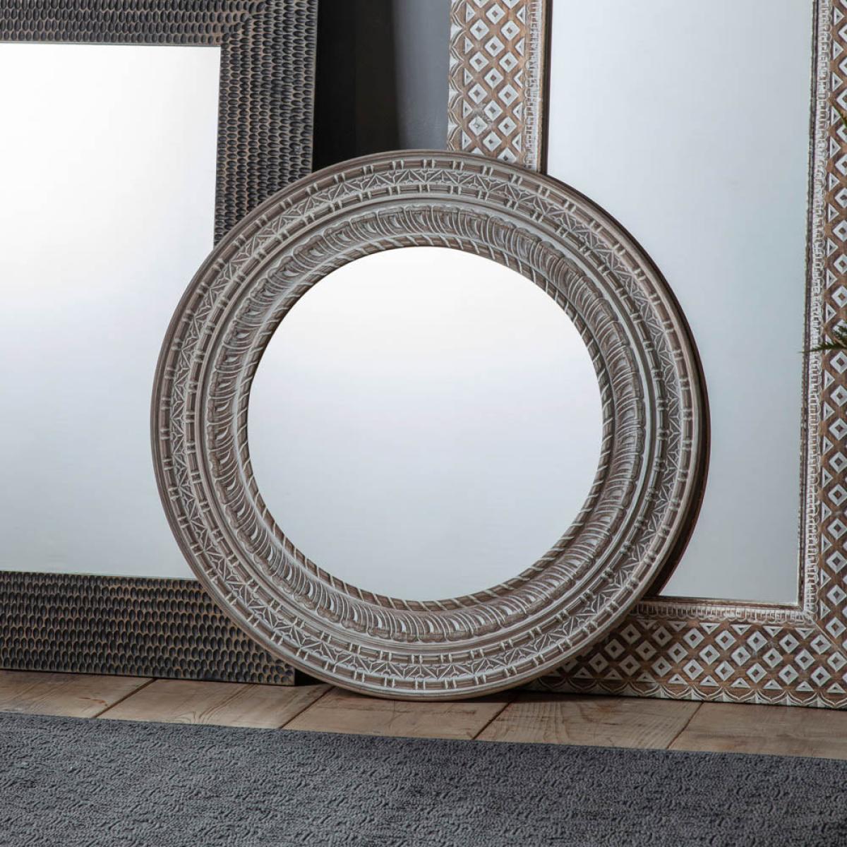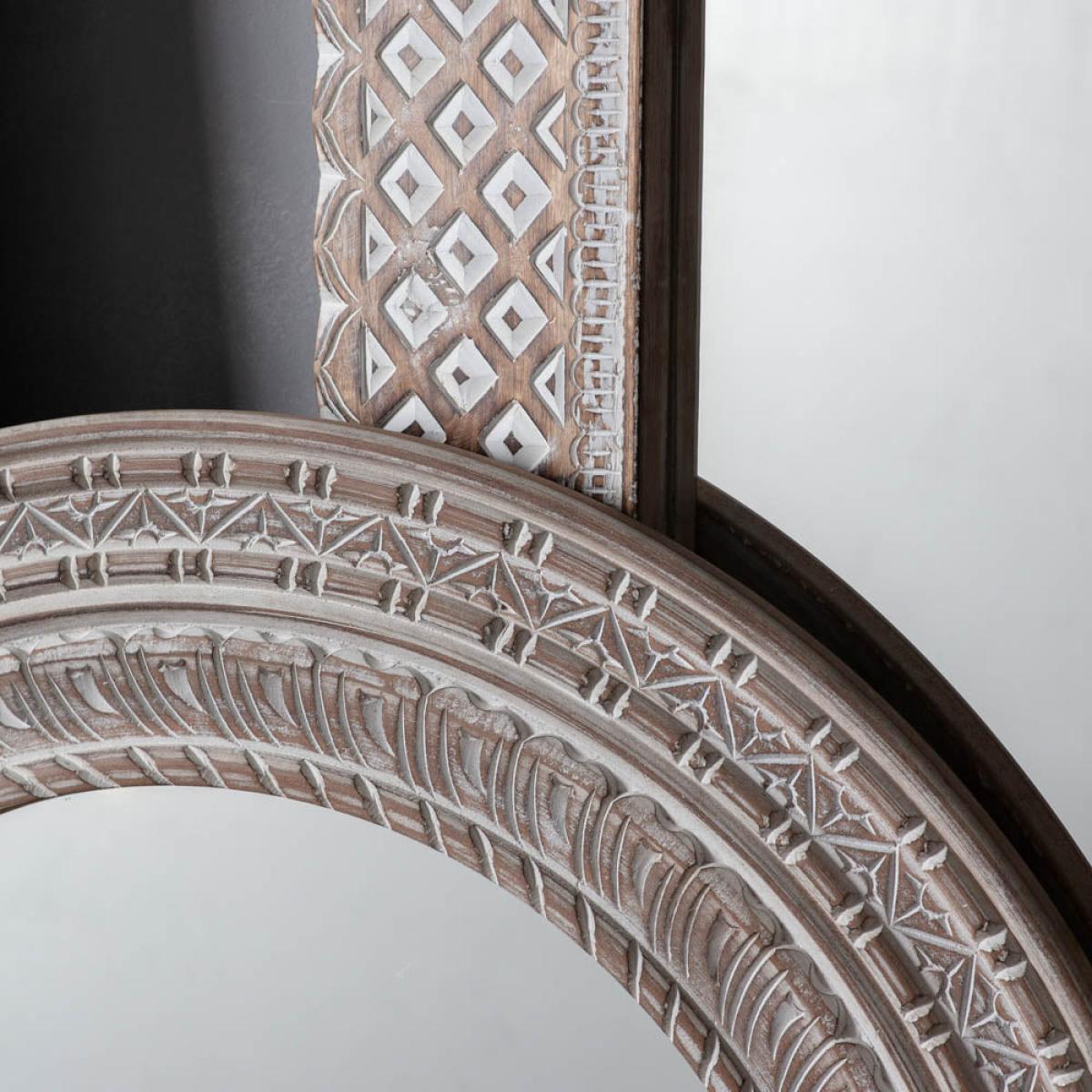 Featuring a deep mango wood frame with intricate carving detail adding texture and interest. The washed-type finish highlights the detail of the design.