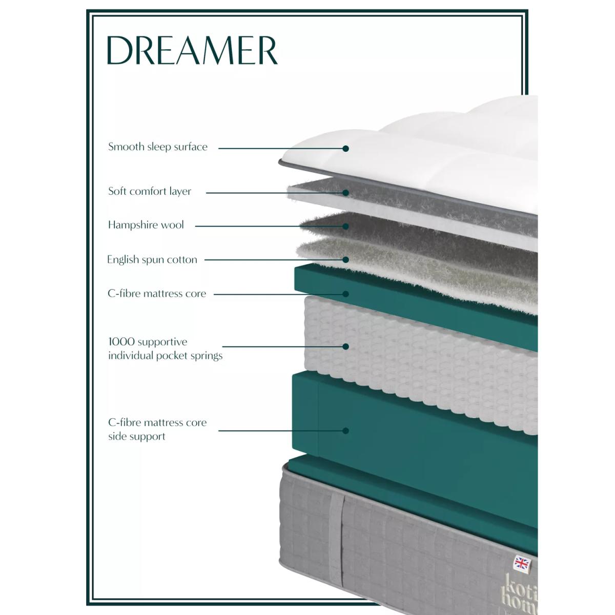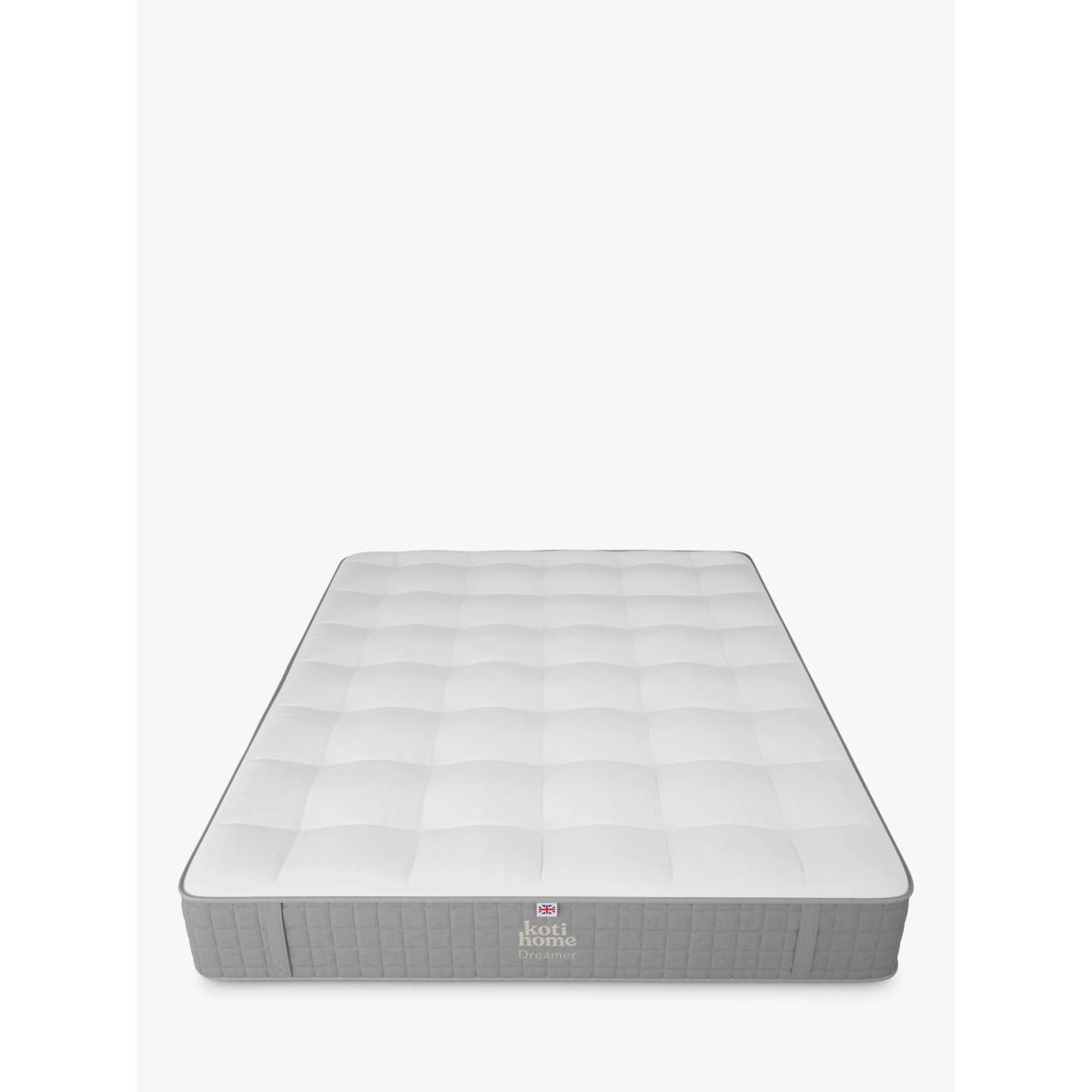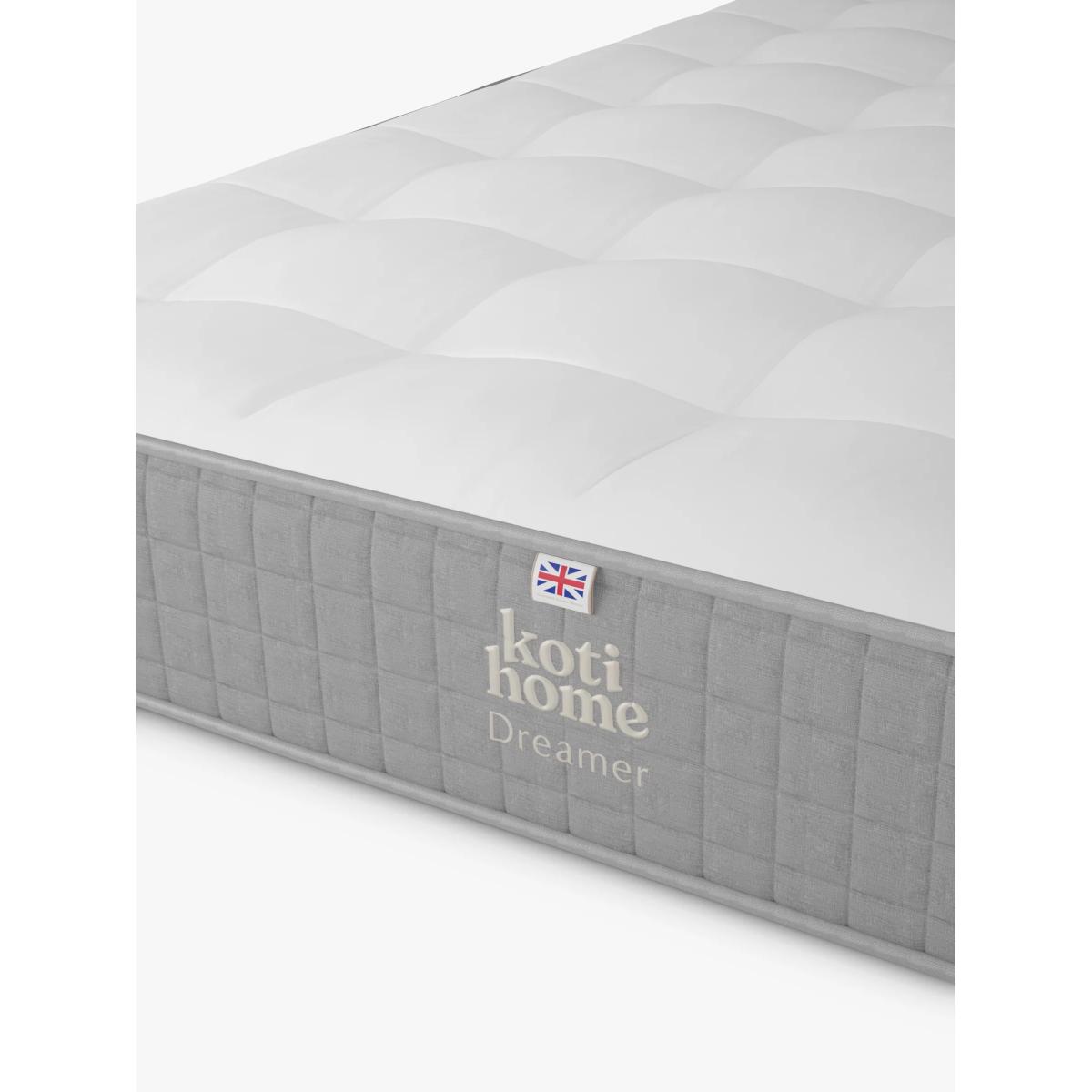 Moisture Wicking Relieves Pressure Made in the UK Dreamer: this is a mattress dreams are made of. Designed with a pocket spring system and layers of natural fillings, this mattress earns extra comfort points thanks to its soft-to-touch viscose cotton cover. The tufts are also inside the mattress, offering all the support of traditional tufting, but the benefit of a smooth, flat-top surface. A combination of temperature regulating English spun cotton and insulating Hampshire wool makes up the natural fillings. These are layered on top of a C-Fibre core which houses 1000 pocket springs in a king size. The supportive and individually layered pocket springs move independently, ensuring body contouring, comfort and support. And its edge-to-edge design means you have the full width of the mattress to sleep on. Prolong the lifetime of your new mattress by rotating it regularly. There are eight handles around the mattress to help you. Beautifully British: mattresses from Koti Home are made using 100% British materials. Made in the New Forest, their mattresses do not contain any staples which can be problematic in the recycling process. They're designed to ensure that every element can be profesionally broken down and reused or recycled, in order to reduce the number of mattresses that end up in UK landfill. Combining traditional expertise with cutting-edge technology, Koti Home's mattresses deliver cloud-like comfort and precision support, encased in a state-of-the-art cover. Try before you buy This is an important purchase and it’s worthwhile to try your choice of mattress in one of our shops to make sure it's right for you. Our store Partners will be able to tell you more about its benefits, and recommend options based on your needs.