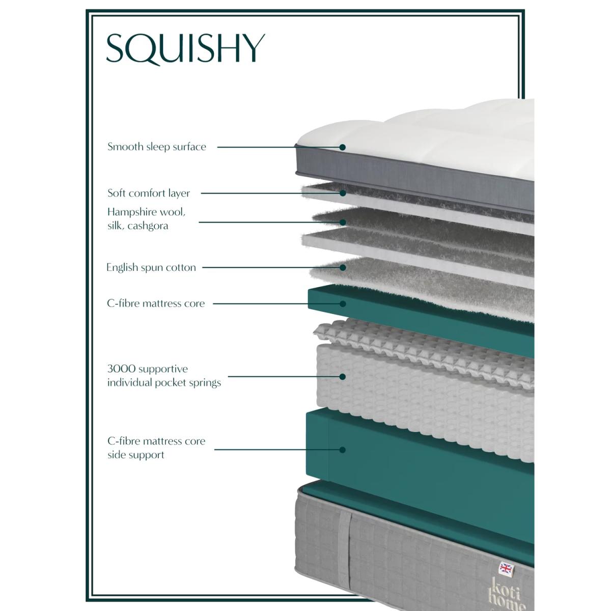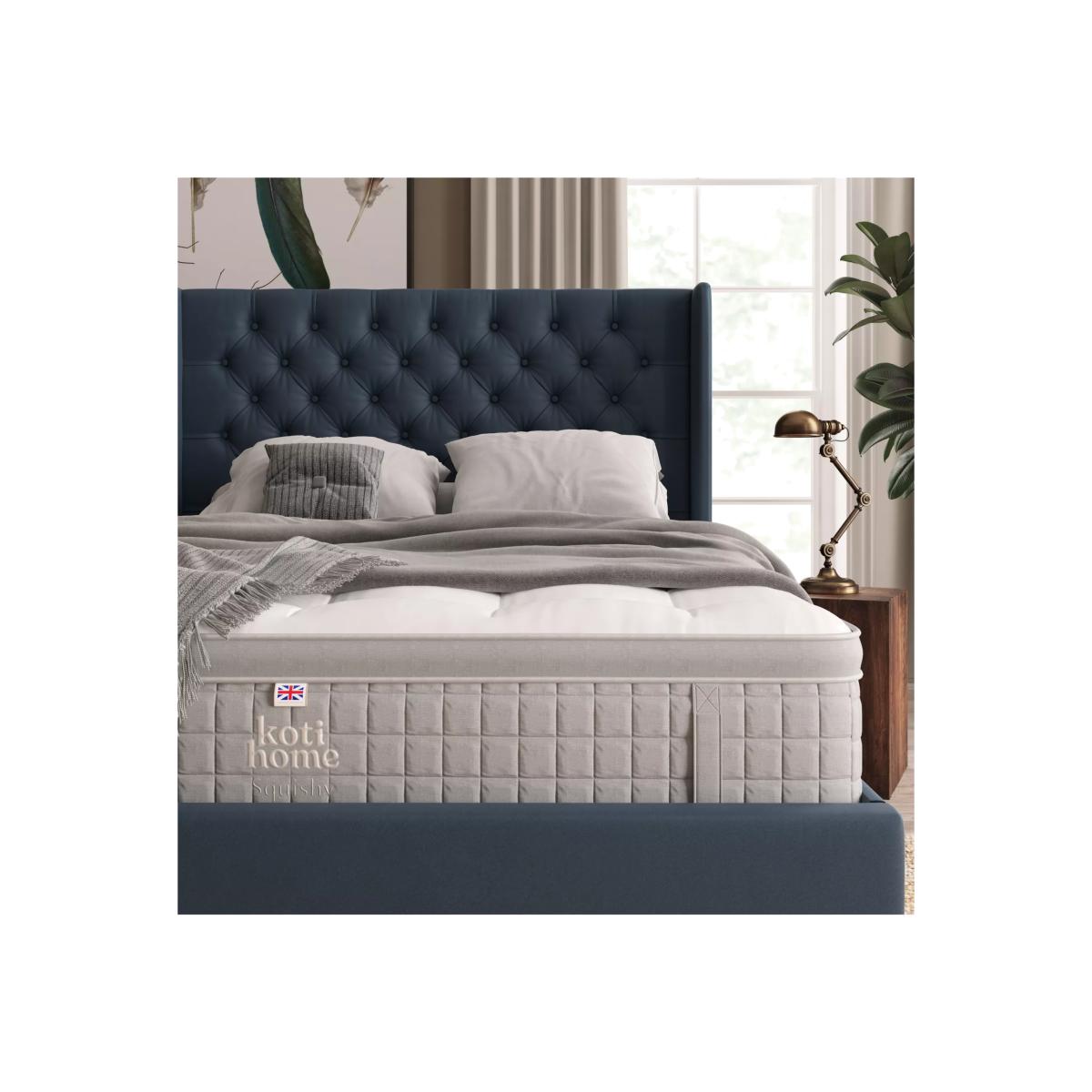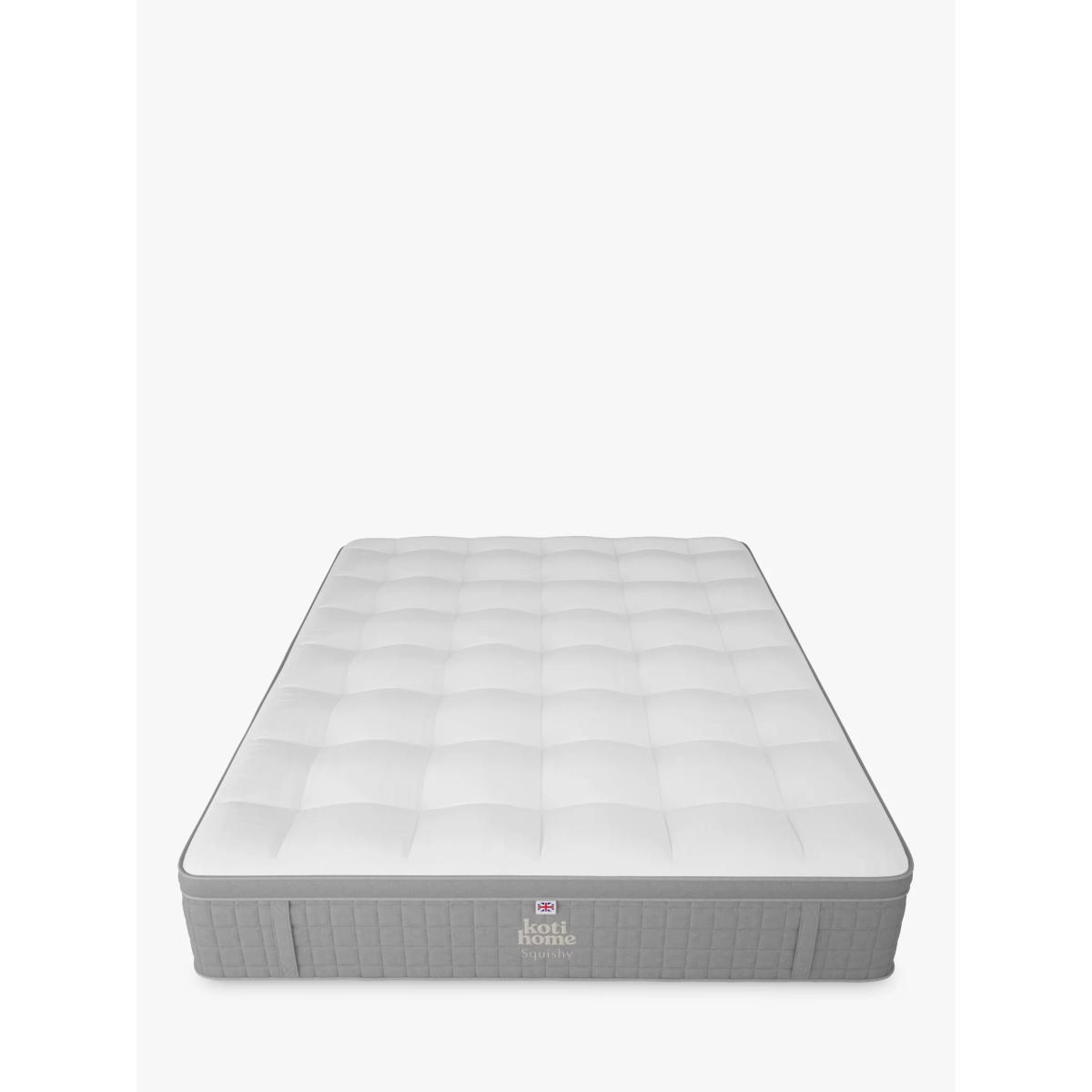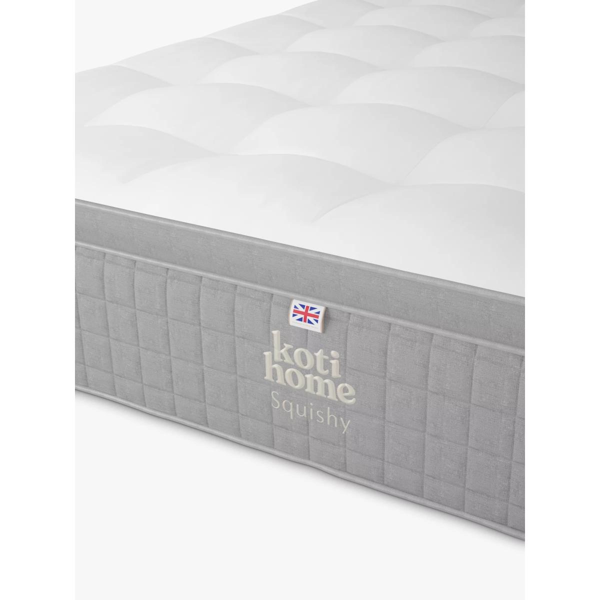 Moisture Wicking Relieves Pressure Made in the UK Squishy and soft for a sleep so comfortable you won't want to get out of bed. This pocket spring mattress is designed with a plump, box pillowtop and it's covered in a smooth, soft-to-touch viscose cotton. It earns extra comfort points thanks to inner tufting, meaning you won't feel a thing all night long. As the tufts are inside, they provide all the support of traditional tufting, but this mattress also offers all the comfort of a flat-top mattress. A combination of temperature regulating English spun cotton and Hampshire wool, silk and cashgora make up the natural fillings. These are layered on top of a C-Fibre core which houses 3000 pocket springs in a king size. The supportive and individually layered pocket springs move independently, ensuring body contouring, comfort and support. And edge-to-edge support means you have the full width of the mattress to sleep on. Prolong the lifetime of your new mattress by rotating it regularly. There are eight handles around the mattress to help you. Beautifully British: mattresses from Koti Home are made using 100% British materials. Made in the New Forest, their mattresses do not contain any staples which can be problematic in the recycling process. They're designed to ensure that every element can be profesionally broken down and reused or recycled, in order to reduce the number of mattresses that end up in UK landfill. Combining traditional expertise with cutting-edge technology, Koti Home's mattresses deliver cloud-like comfort and precision support, encased in a state-of-the-art cover. Try before you buy This is an important purchase and it’s worthwhile to try your choice of mattress in one of our shops to make sure it's right for you. Our store Partners will be able to tell you more about its benefits, and recommend options based on your needs.