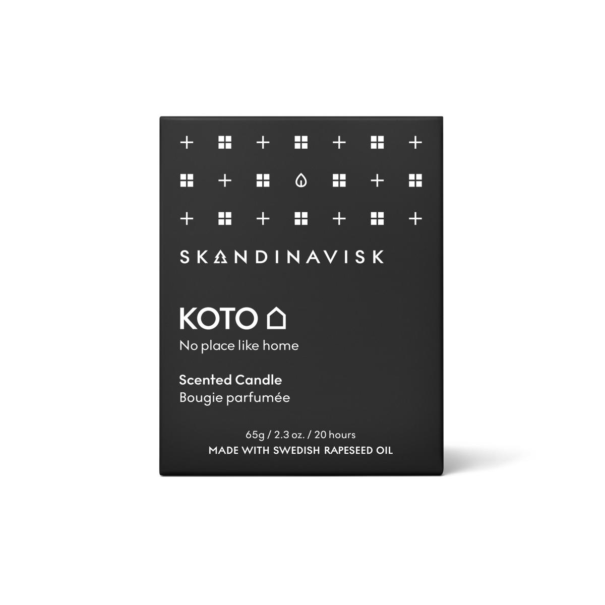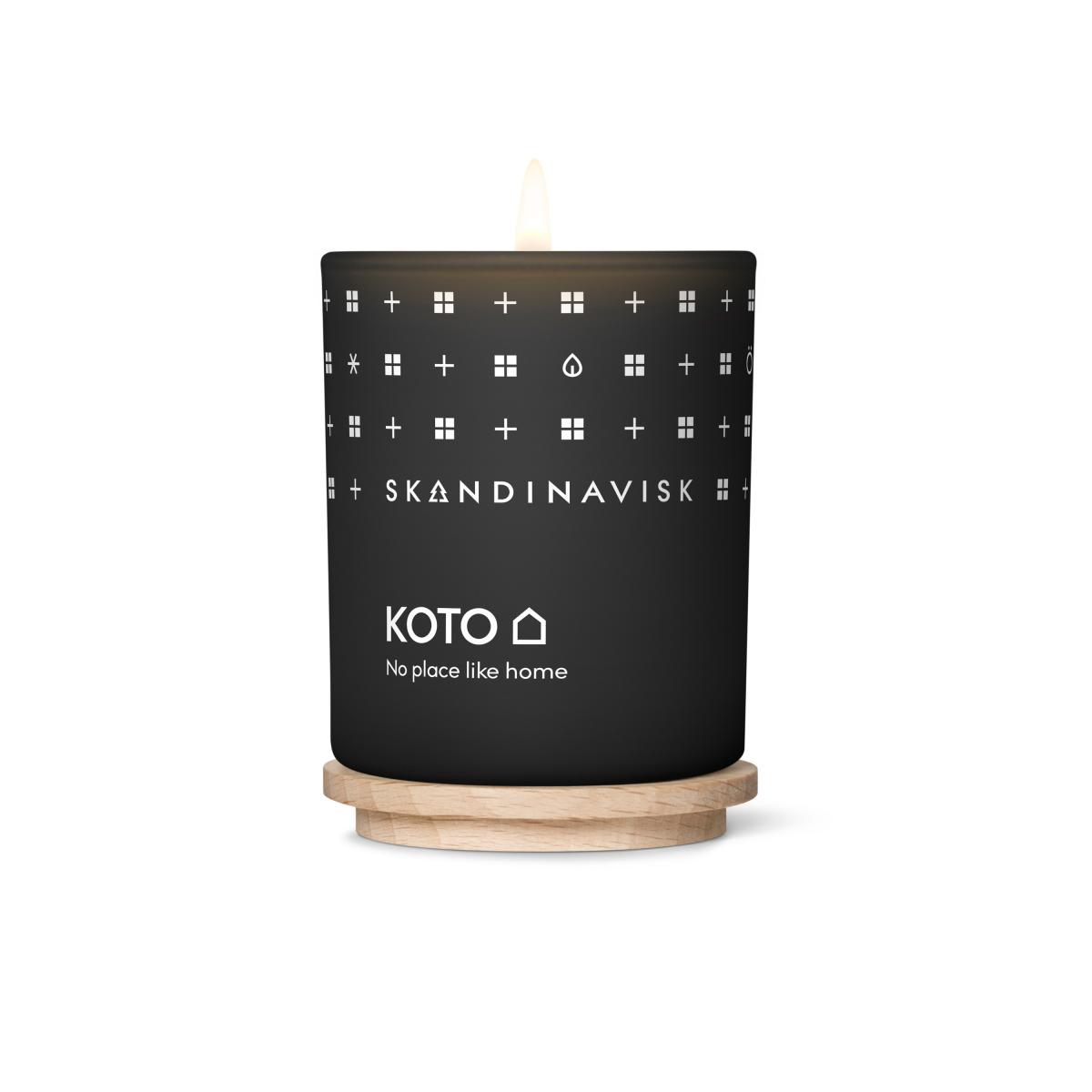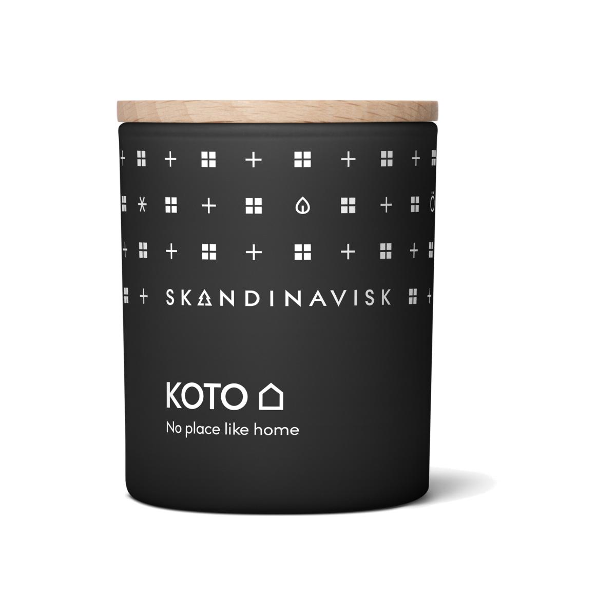 Koto scented candle with lid from fragrance specialists Skandinavisk provides a rich aroma of vanilla sticks, dried orange peel, amber and vintage leather. After the candle has burned, the stylish glass jar with its graphic print and engraved wooden lid becomes a decorative storage vessel. Simply wash the glass jar with warm water or in the dishwasher.