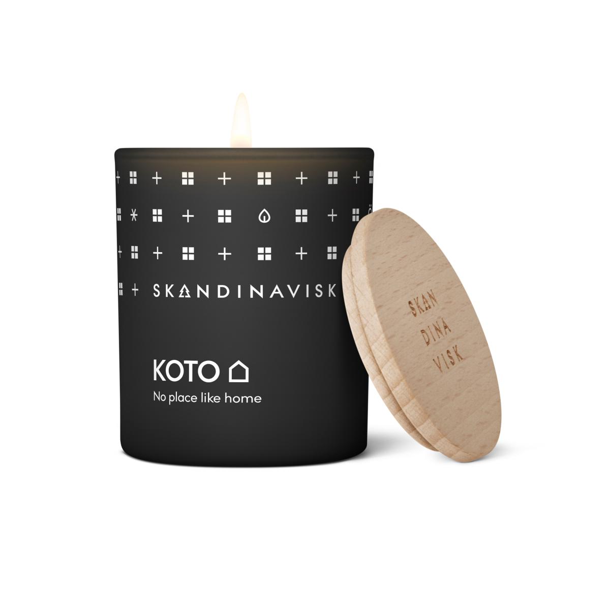 Koto scented candle with lid from fragrance specialists Skandinavisk provides a rich aroma of vanilla sticks, dried orange peel, amber and vintage leather. After the candle has burned, the stylish glass jar with its graphic print and engraved wooden lid becomes a decorative storage vessel. Simply wash the glass jar with warm water or in the dishwasher.