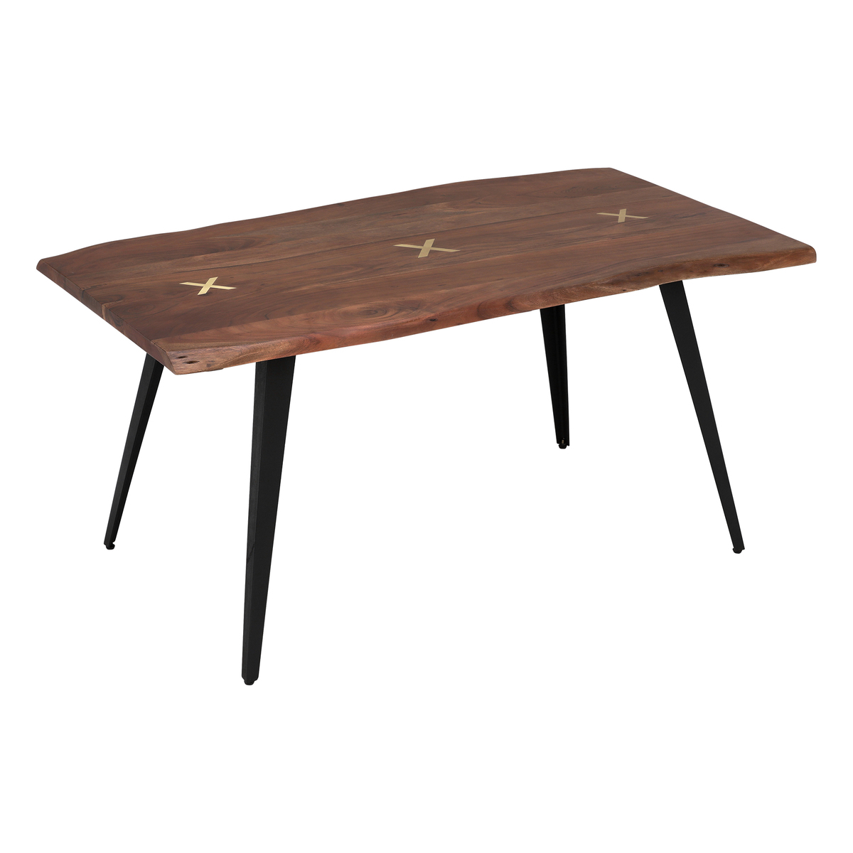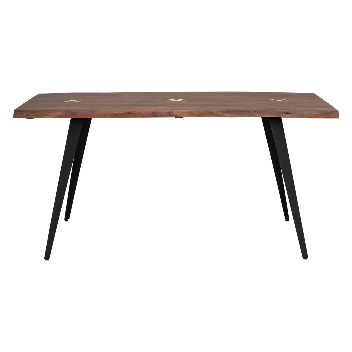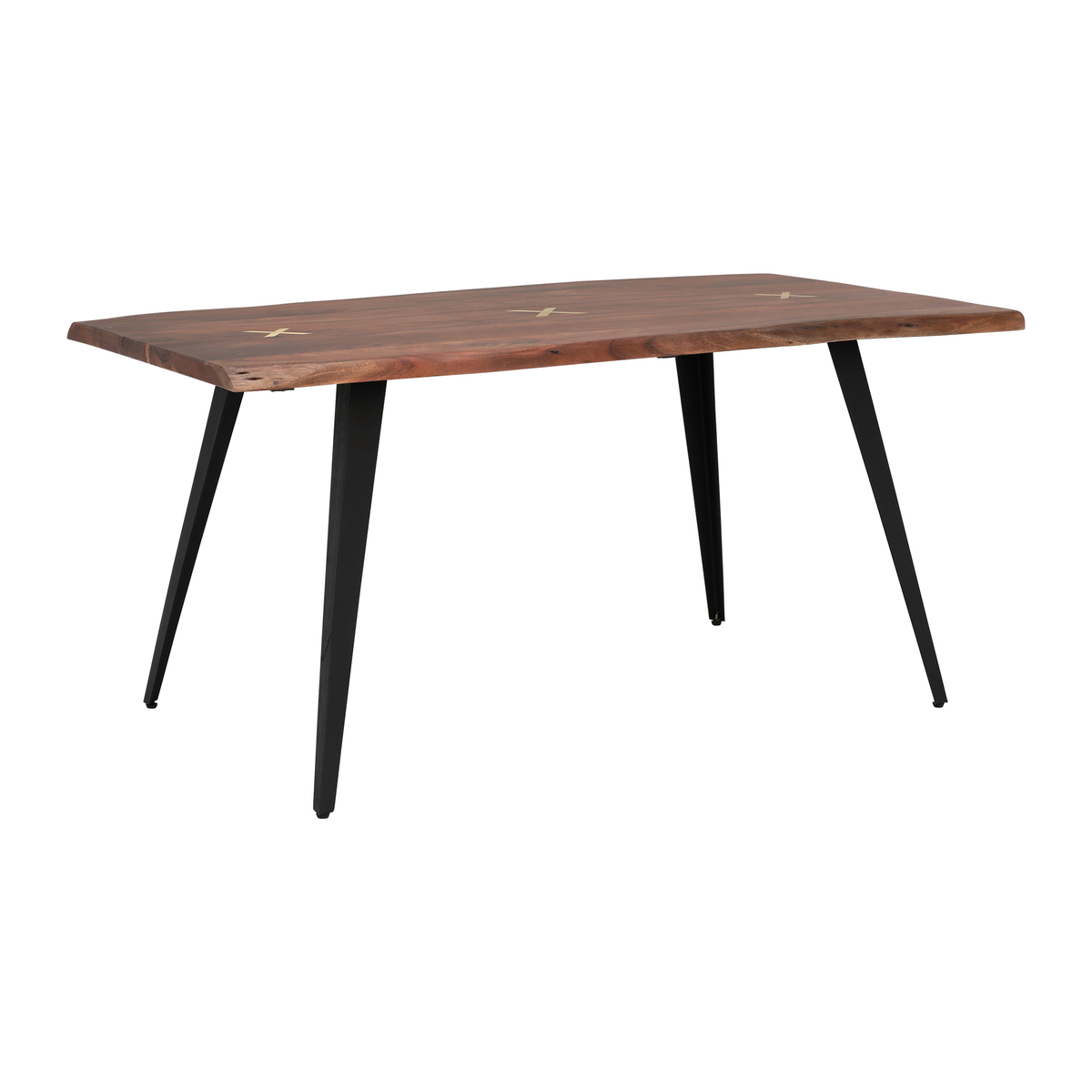 Beautifully blending the natural finish of its wood with black metal legs, the Kriss dining table is a stunning piece defined by industrial edge. Displaying rich tones, irregular shapes and individual markings, the durable solid Acacia top lends a unique look to dining areas of any colour or style. Stylish brass inlays in a cross formation embellish the tables centre, providing an elegant touch of detail. With sharp splayed legs and a taste of mid-century, the Kriss will ensure you love mealtimes more than ever. The live edge of the Kriss dining table follows the natural curves of its tree source. Hand finished, the table top's silhouette and surface are beautifully smooth. Preserving the natural flowing shape of the tree, this live edge dining table has a unique and contemporary look that is further enhanced by cracks and knots that are individual to each piece.