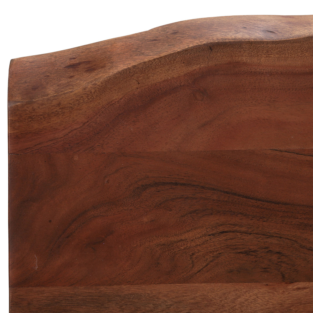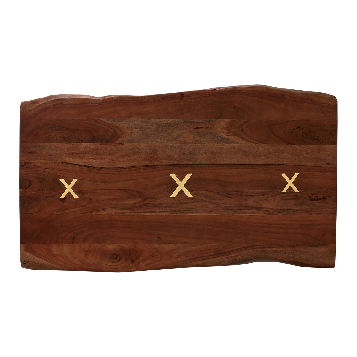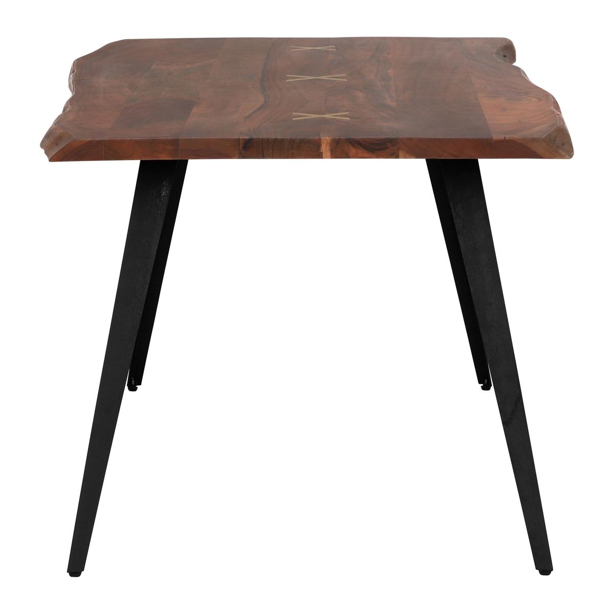 Beautifully blending the natural finish of its wood with black metal legs, the Kriss dining table is a stunning piece defined by industrial edge. Displaying rich tones, irregular shapes and individual markings, the durable solid Acacia top lends a unique look to dining areas of any colour or style. Stylish brass inlays in a cross formation embellish the tables centre, providing an elegant touch of detail. With sharp splayed legs and a taste of mid-century, the Kriss will ensure you love mealtimes more than ever. The live edge of the Kriss dining table follows the natural curves of its tree source. Hand finished, the table top's silhouette and surface are beautifully smooth. Preserving the natural flowing shape of the tree, this live edge dining table has a unique and contemporary look that is further enhanced by cracks and knots that are individual to each piece.