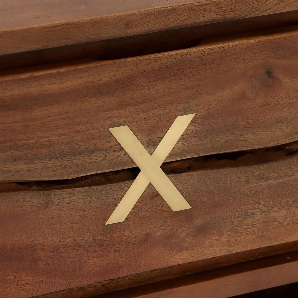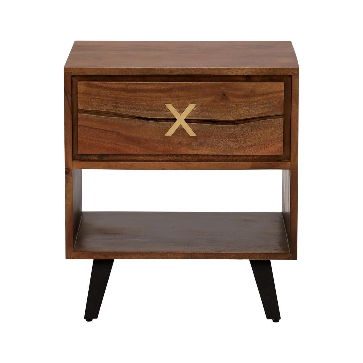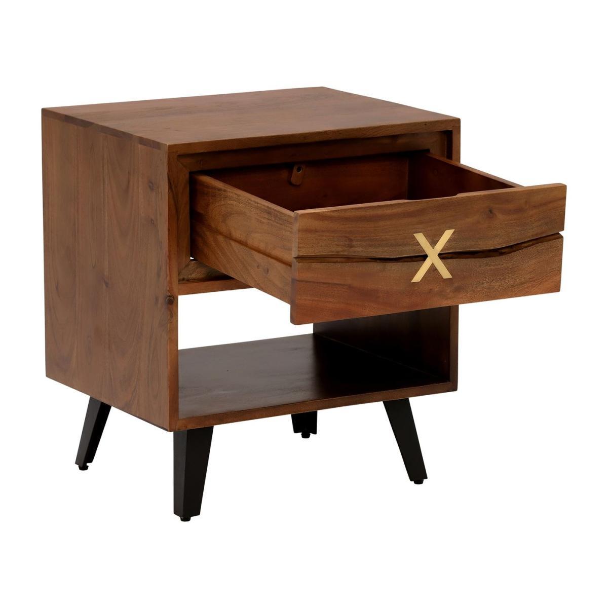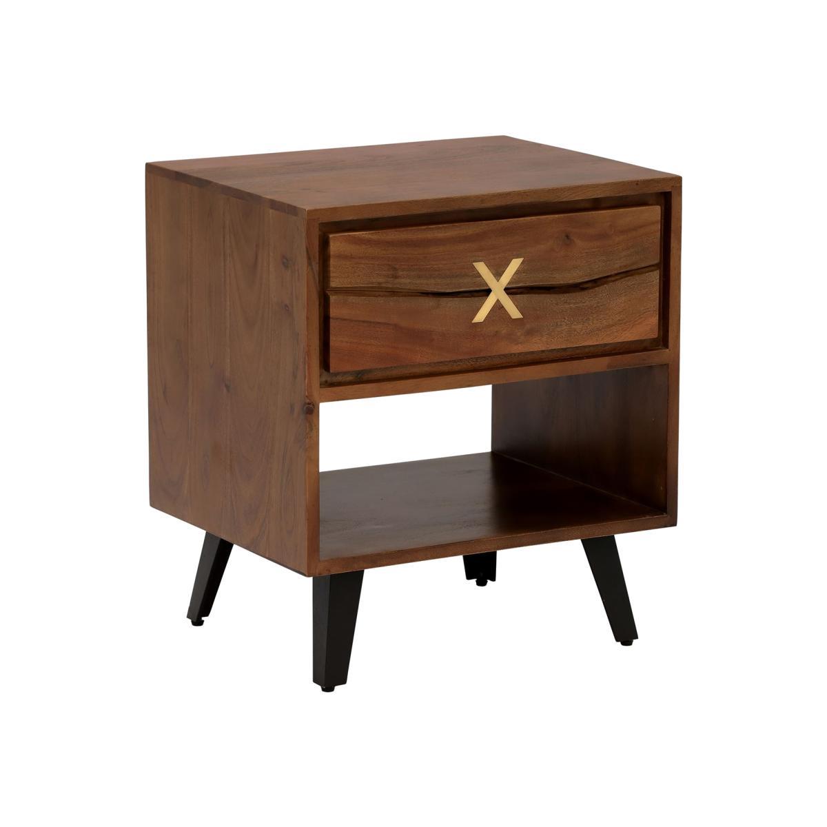 Design. With a sharp silhouette, rich colour palette, and mixture of metal and wood, the Kriss side table is a mid-century modern marvel. Boxy in its shape, it has a very compact and refined feel, yet the inclusion of a drawer and an open shelf allow for plenty of storage, as well as a sense of space. The drawer front features a natural split, cleanly joined by a stylish brass cross that brings the whole look together and centres the eye. These angular lines are echoed in the table’s splayed legs, with a black finish that allows industrial edge to step in. Built from solid Acacia wood that is both stunningly versatile and incredibly durable, the Kriss side table is the only place your cup of tea will want to rest. Pairs beautifully with the coordinating Kriss coffee table.