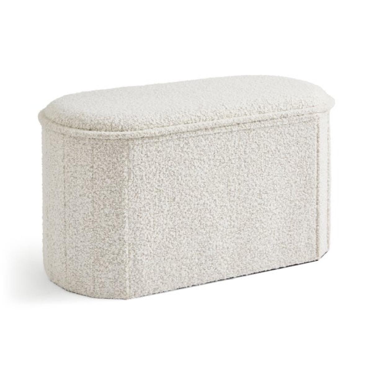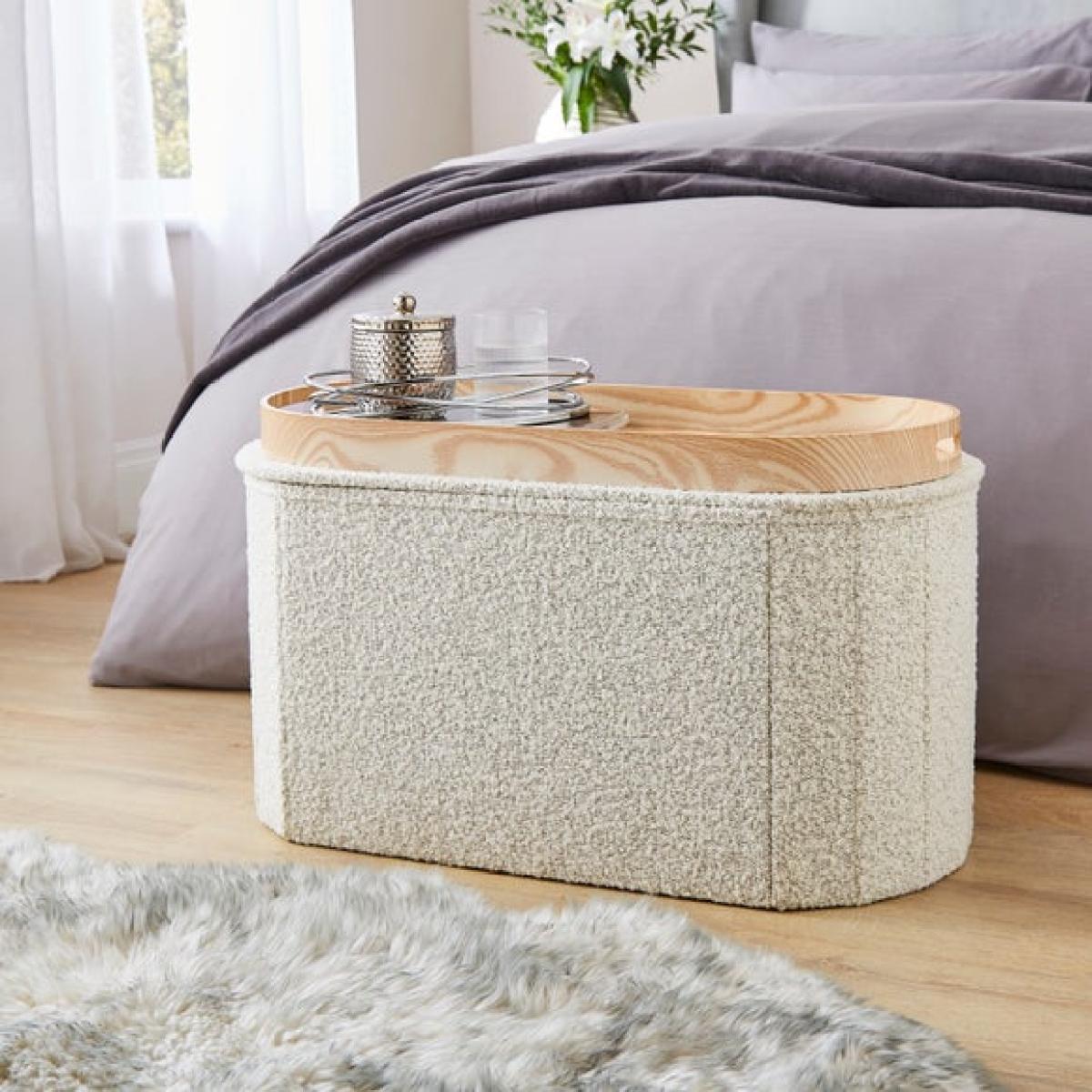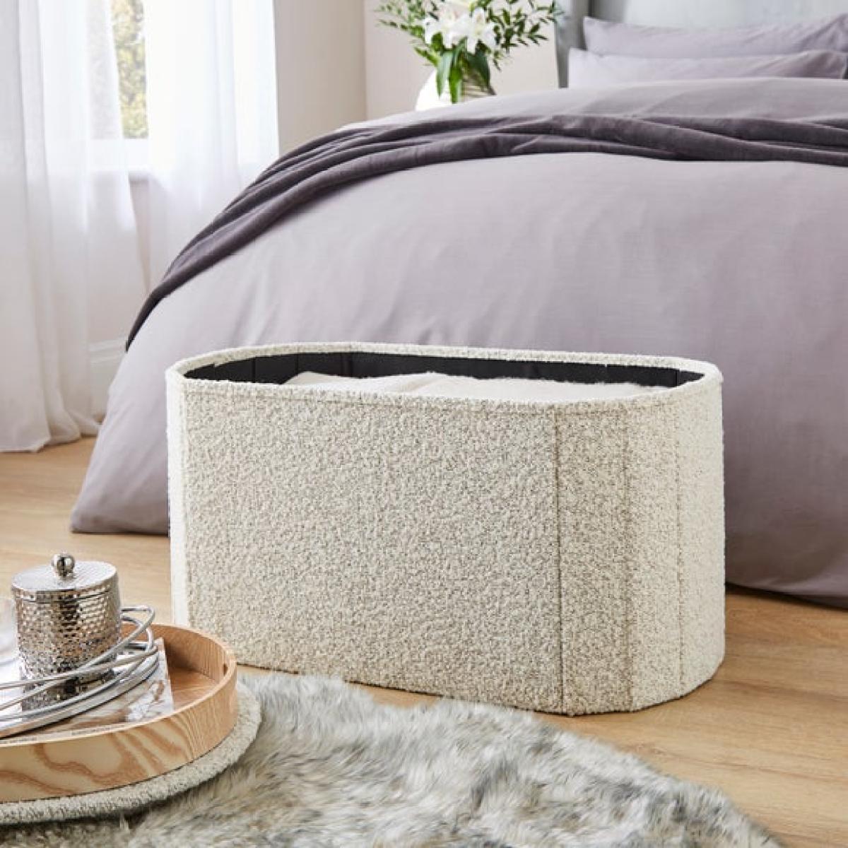 * Large capacity storage * Multi-use ottoman - use as a storage box, footrest or seat * Tray top included for placing ornaments, or any other bits and bobs * Gorgeous Boucle material * No tools needed to assemble Style meets practicality with the Kristen Lozenge Ottoman with Tray. Upholstered in soft boucle fabric, this elegant piece offers generous hidden storage while doubling as a cosy footrest or extra seat. The removable tray top is ideal for showcasing decorative accents or keeping everyday essentials within easy reach. With a simple, tool-free assembly, it’s a versatile addition that brings both sophistication and smart functionality to your home.