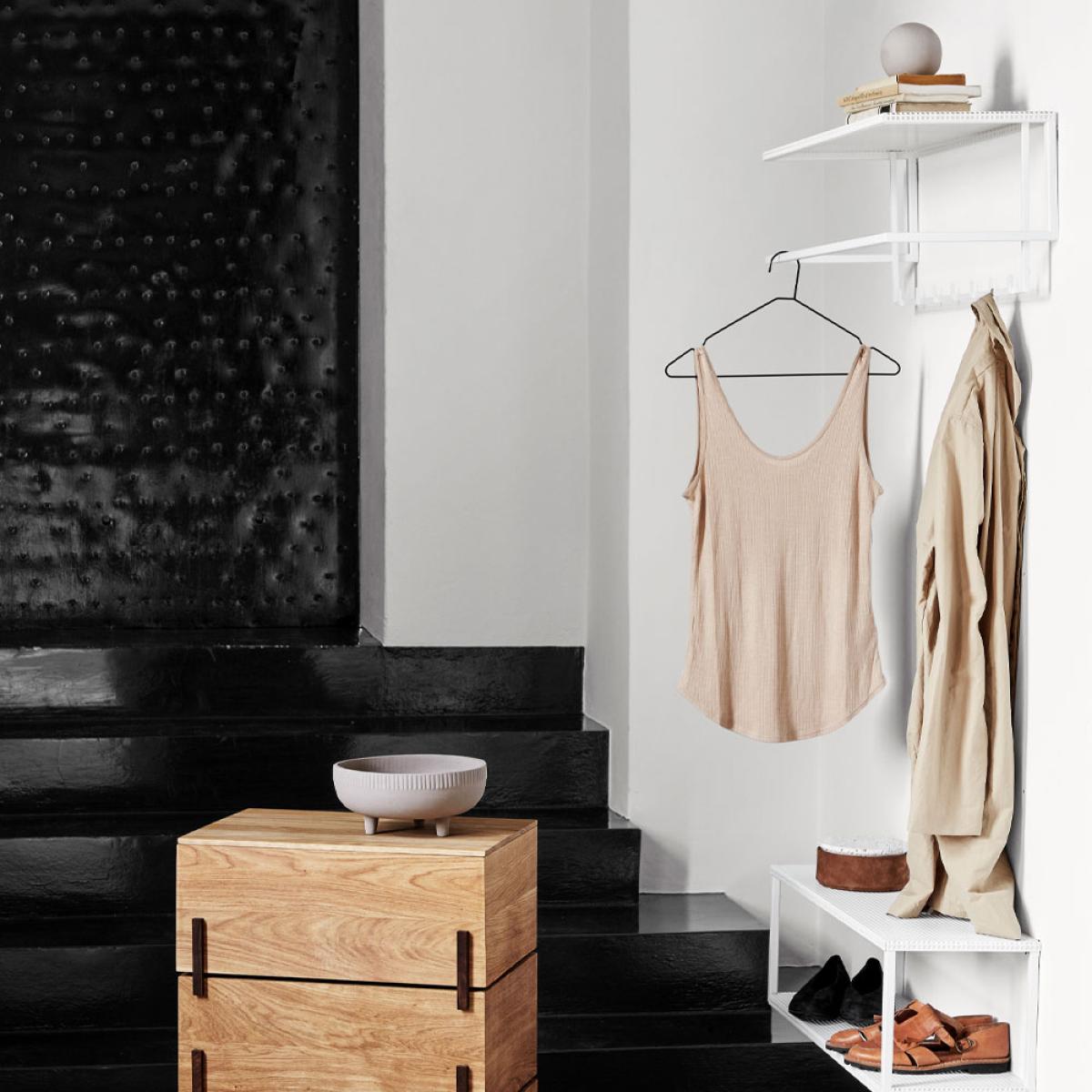I love this hat shelf for its sleek and minimalistic design, which makes it versatile across various interior styles, from modern Scandinavian to industrial. Its black grid adds a touch of edge while providing practical storage for coats, hats, or accessories, helping to keep entryways organised without visual clutter. Stylistically, it works well in both pared-back, monochrome spaces and more layered, textured interiors. For practical styling tips, position it near the front door for easy access, and consider adding a few decorative hooks or baskets beneath for extra storage. Pairing it with natural wood or metal elements can create a balanced, cohesive look that’s both functional and visually appealing.