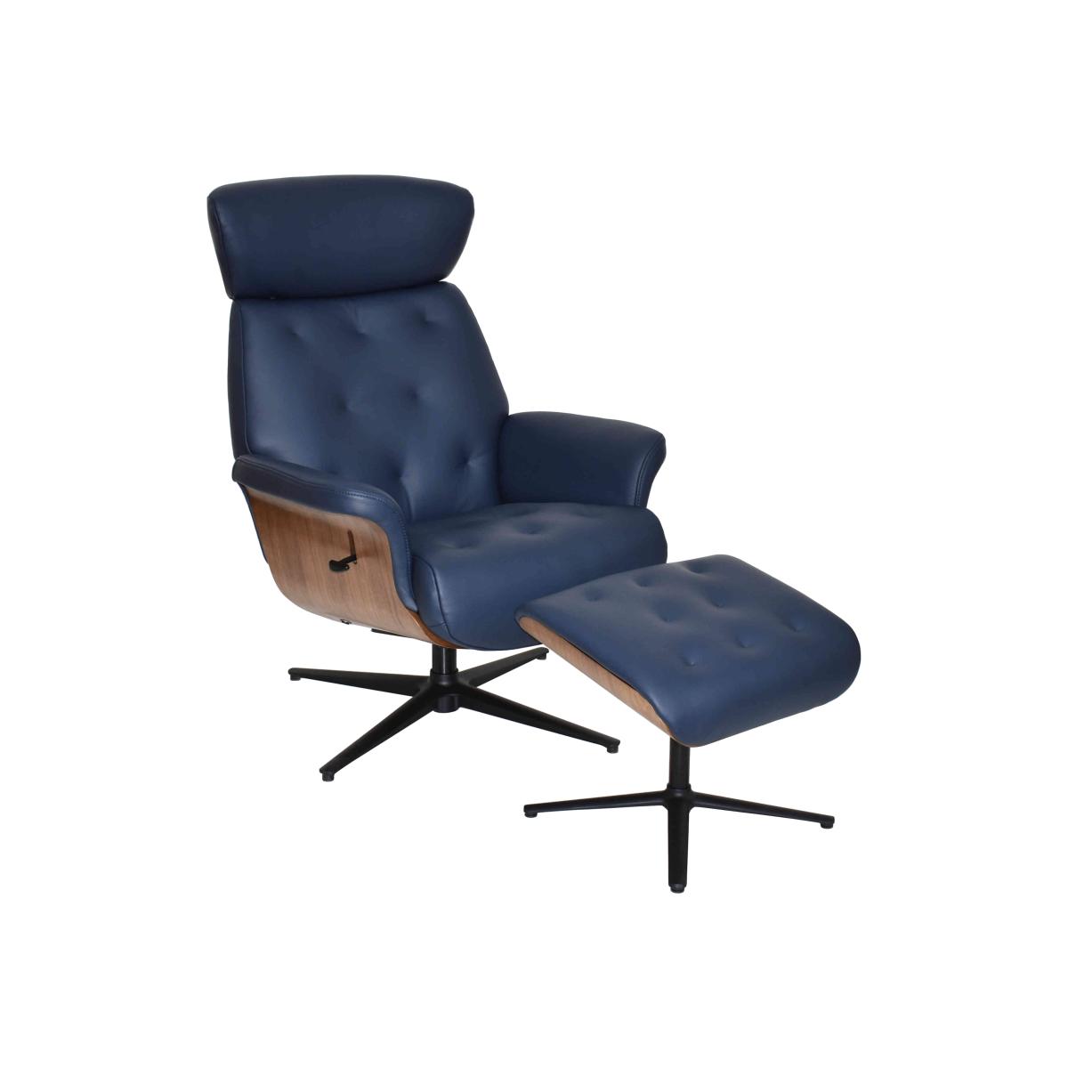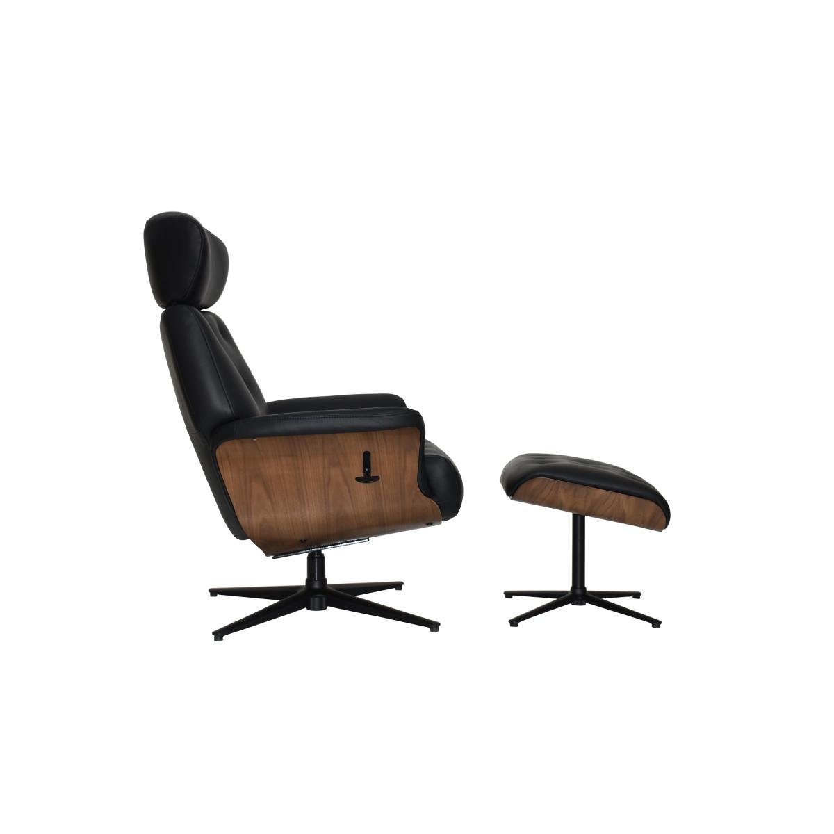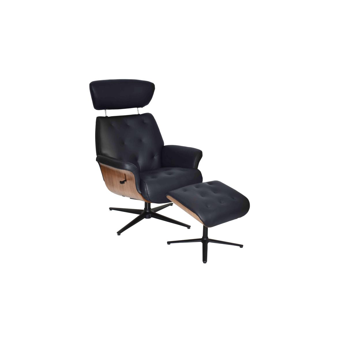 Kick back in cool style with the Kristof swivel recliner chair and footstool. With its polished walnut frame and sumptuously soft upholstery, it's the very definition of statement seating. Why you'll love it. Distinctive swivel recliner chair and footstool inspired by iconic 1950s design. Understated retro style. Generously proportioned for the ultimate in luxurious comfort. Chair and footstool have a curved walnut frame. Chair has lever-operated manual recliner and adjustable telescopic headrest. Upholstered in leather and faux leather for a premium feel at a great price. In a selection of sophisticated colours. Designed and crafted with care. This swivel recliner chair and footstool is part of the recliner collection at Furniture Village. What you need to know. Medium comfort level. Moulded foam cushioning. Metal frame. 100% leather on seat, inside back, inside arms and footstool. Faux leather on outer back and sides. Black or chrome base colour is dependent on upholstery colour. Maximum user weight 115kg. Please allow time for the recliner mechanism to ease. Minor gaps are necessary to ensure ease of motion and may be exaggerated depending on floor type. Leather has unique marks and characteristics with variance in colour and texture. Leather softens with use. Smoothing the tops of leather cushions prevents signs of visual comfort. Please read our upholstery care guide for more advice. Assembly required.