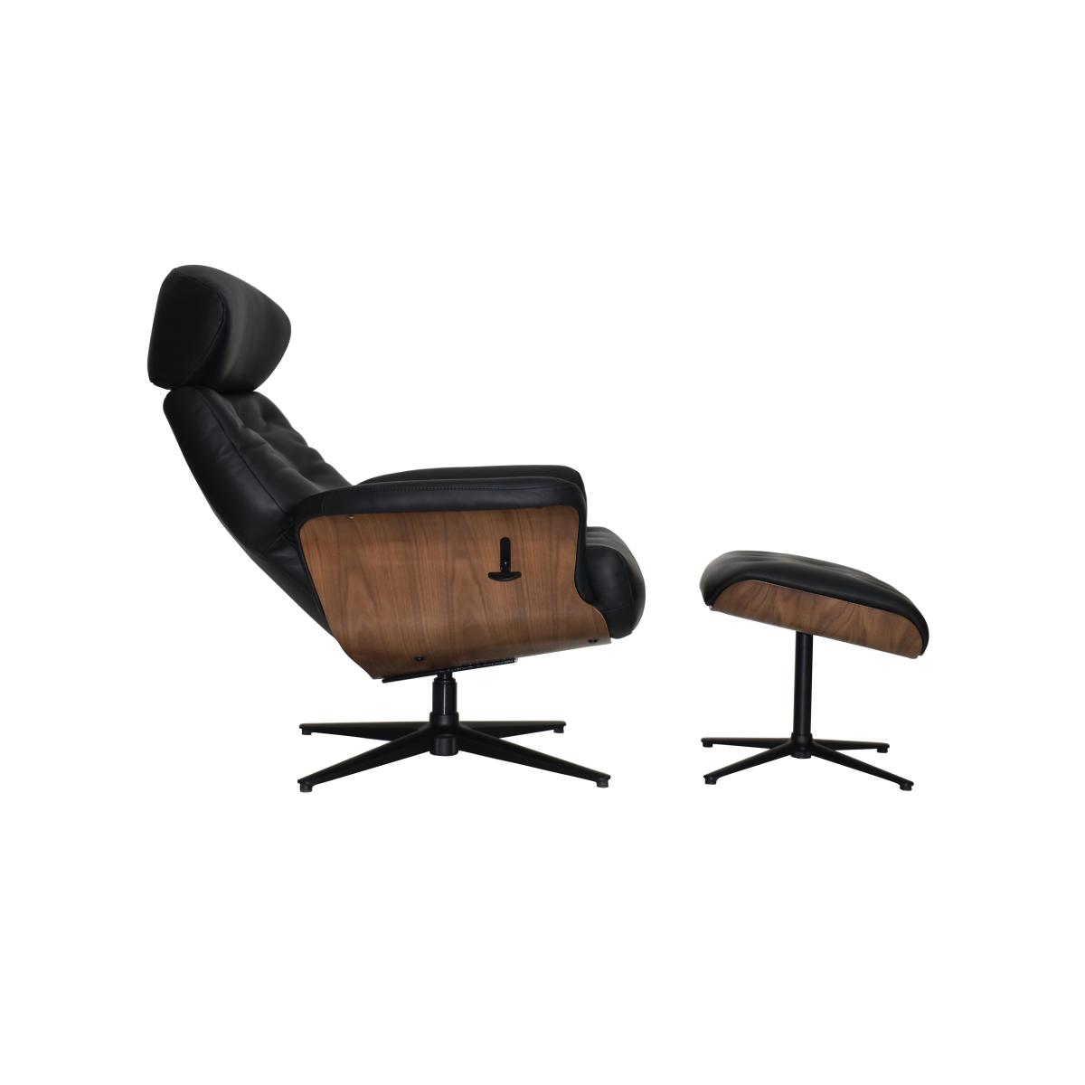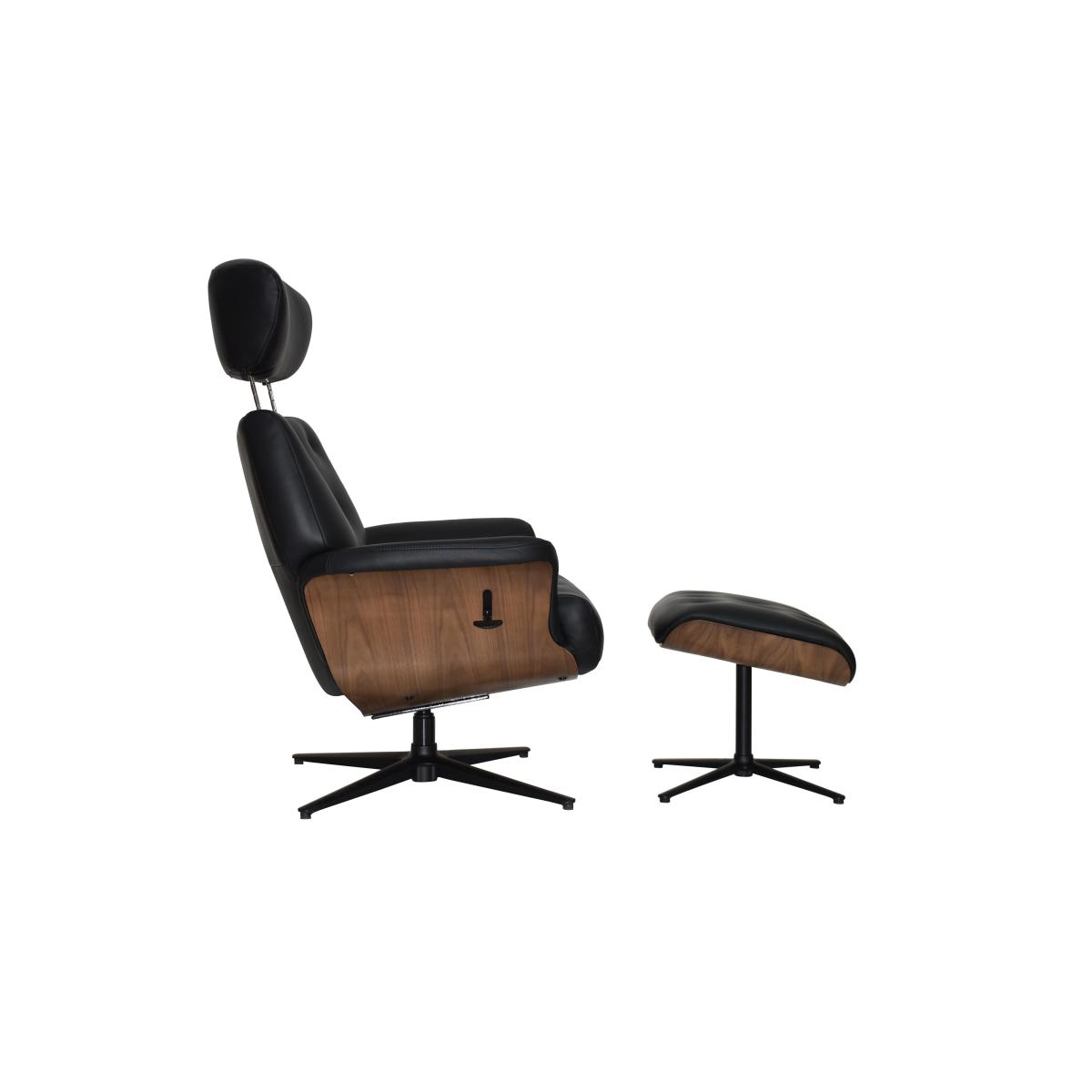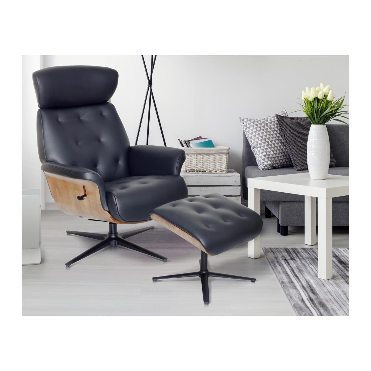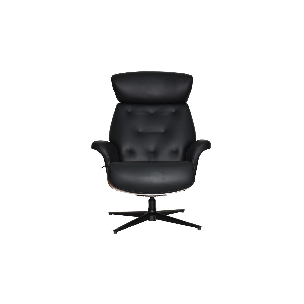 Kick back in cool style with the Kristof swivel recliner chair and footstool. With its polished walnut frame and sumptuously soft upholstery, it's the very definition of statement seating. Why you'll love it. Distinctive swivel recliner chair and footstool inspired by iconic 1950s design. Understated retro style. Generously proportioned for the ultimate in luxurious comfort. Chair and footstool have a curved walnut frame. Chair has lever-operated manual recliner and adjustable telescopic headrest. Upholstered in leather and faux leather for a premium feel at a great price. In a selection of sophisticated colours. Designed and crafted with care. This swivel recliner chair and footstool is part of the recliner collection at Furniture Village. What you need to know. Medium comfort level. Moulded foam cushioning. Metal frame. 100% leather on seat, inside back, inside arms and footstool. Faux leather on outer back and sides. Black or chrome base colour is dependent on upholstery colour. Maximum user weight 115kg. Please allow time for the recliner mechanism to ease. Minor gaps are necessary to ensure ease of motion and may be exaggerated depending on floor type. Leather has unique marks and characteristics with variance in colour and texture. Leather softens with use. Smoothing the tops of leather cushions prevents signs of visual comfort. Please read our upholstery care guide for more advice. Assembly required.