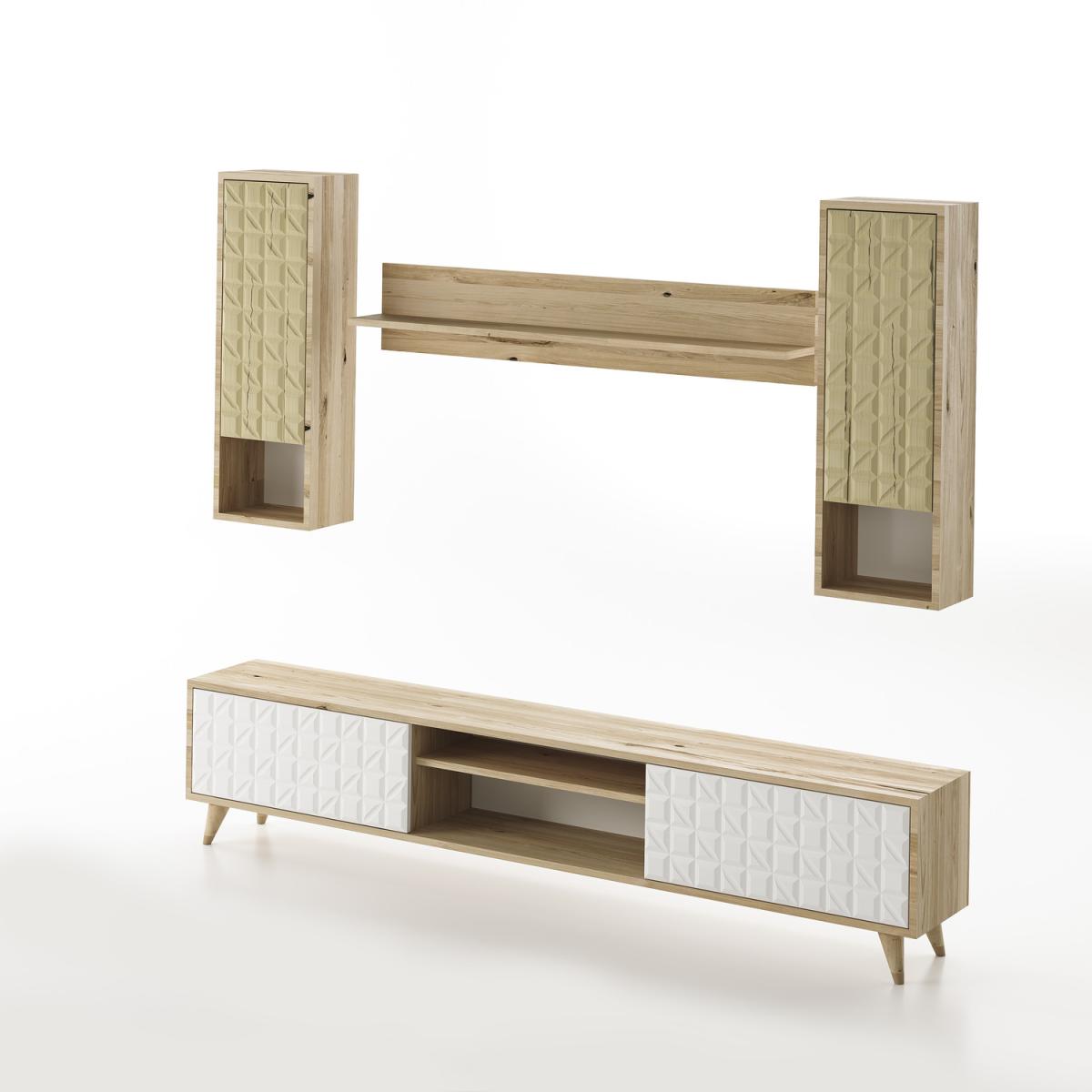 4-piece media/entertainment set. A large 2-door TV cabinet with ample storage for your media and everyday items, featuring large open media player shelves and finished with engraved doors. The unit comes with 2x 1 door wall-hung cabinet and a matching large shelf. Delivered flat packed, assembly required.