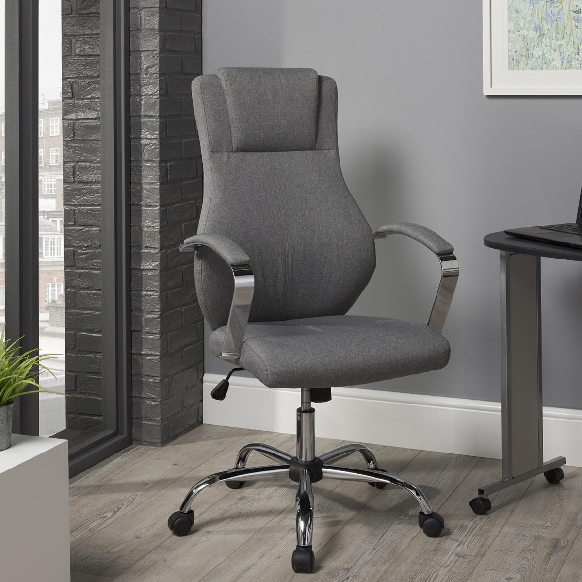 The Kroft Grey linen Office Chair is thoughtfully designed with comfort and style in mind, making a great addition to any home or work office area. Featuring chrome lefts and a gas lift mechanism for height adjustment, this swivel desk chair offers lumbar support and a cushioned headrest for extra comfort when sitting for long periods of time. Upholstered in grey linen fabric and finished with curved armrests, this high-backed chair will fit the aesthetic of any modern working environment.