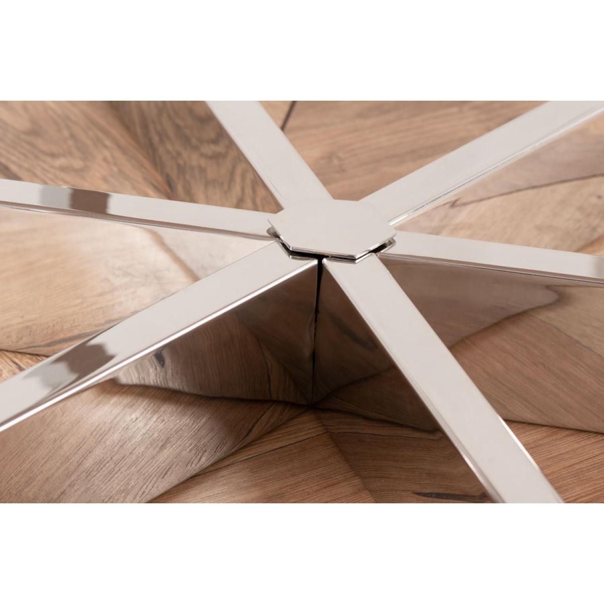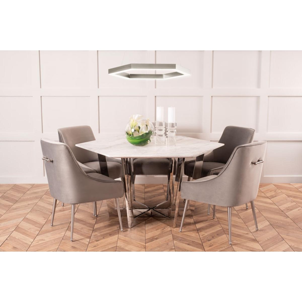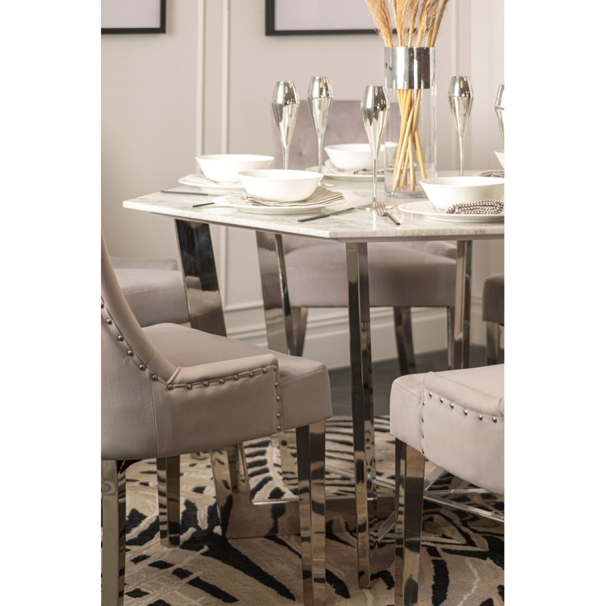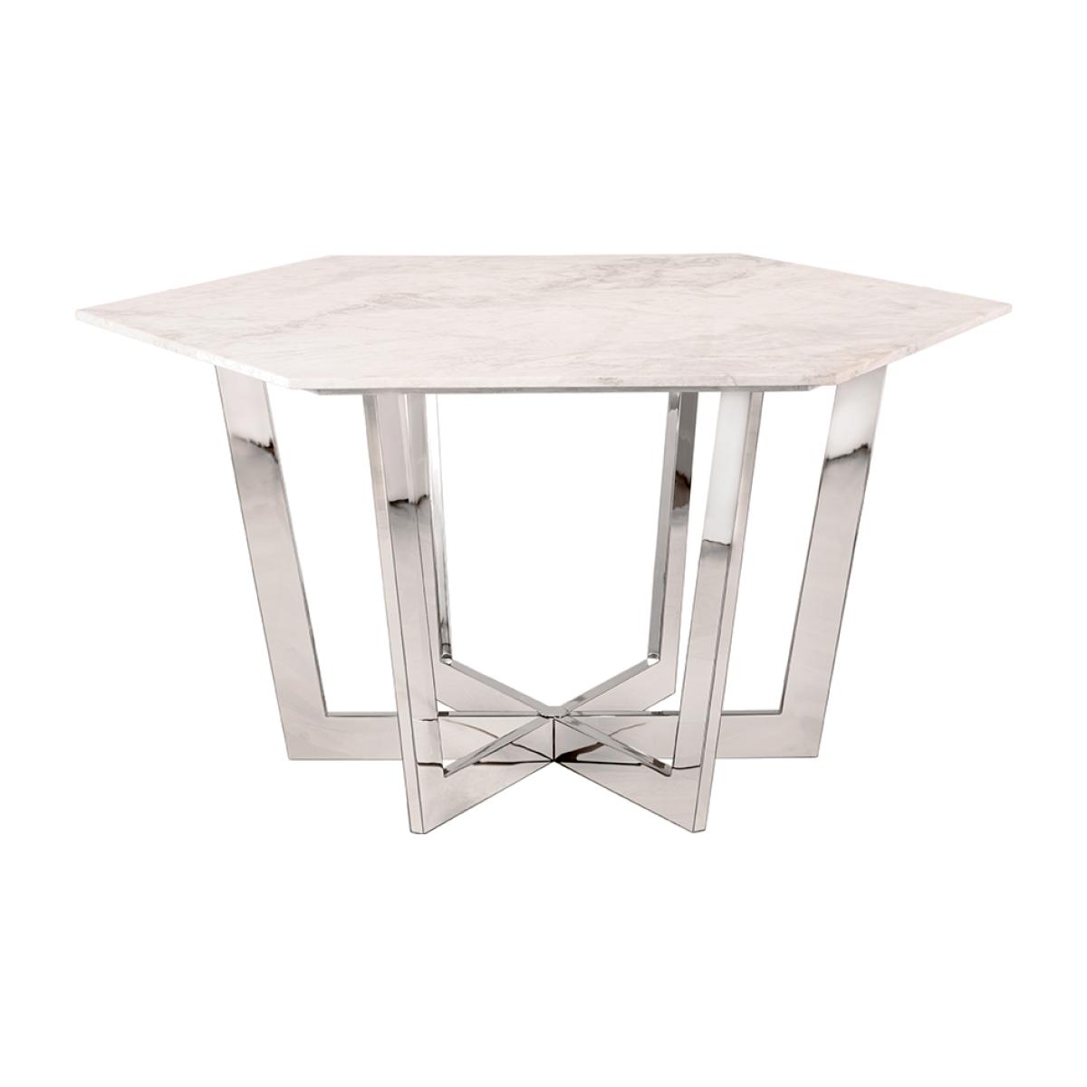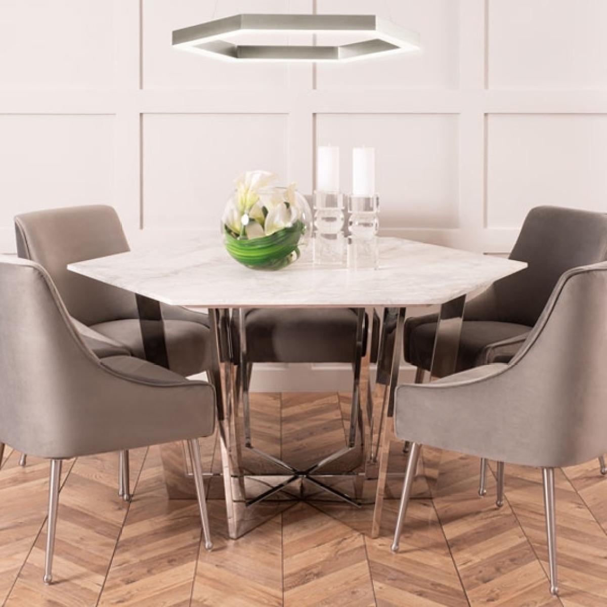 Unusual hexagonal shape dining table whichwill fit up to six people. Solid marble top with painted wood reinforcement to underside. Chrome plated steel base. Assembly required, approximately 10 minutes. Due to its natural formation every piece of marble is unique. There may be subtle differences in colour, tone and composition from the image shown. On occasions fissures may be present, these are natural characteristics and do not compromise the marble’s structural integrity. Wipe with a soft, dry cloth. Avoid using chemical based cleaners as these could damage the finish.