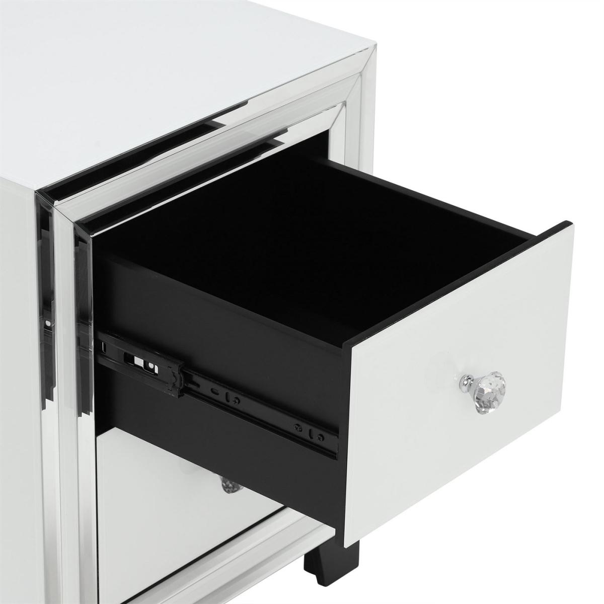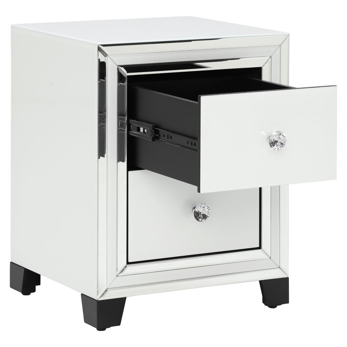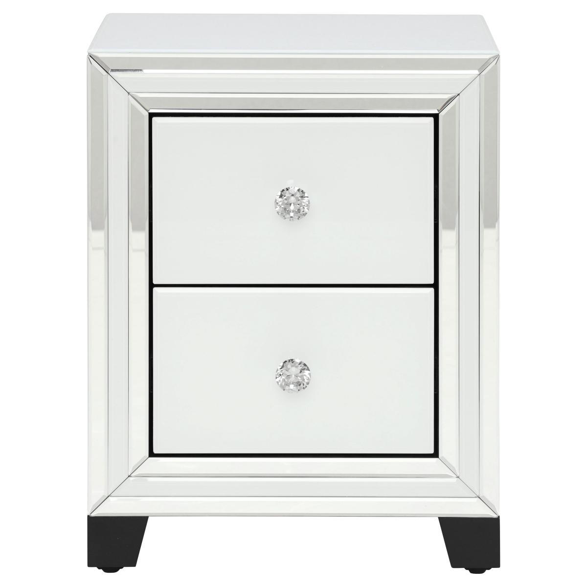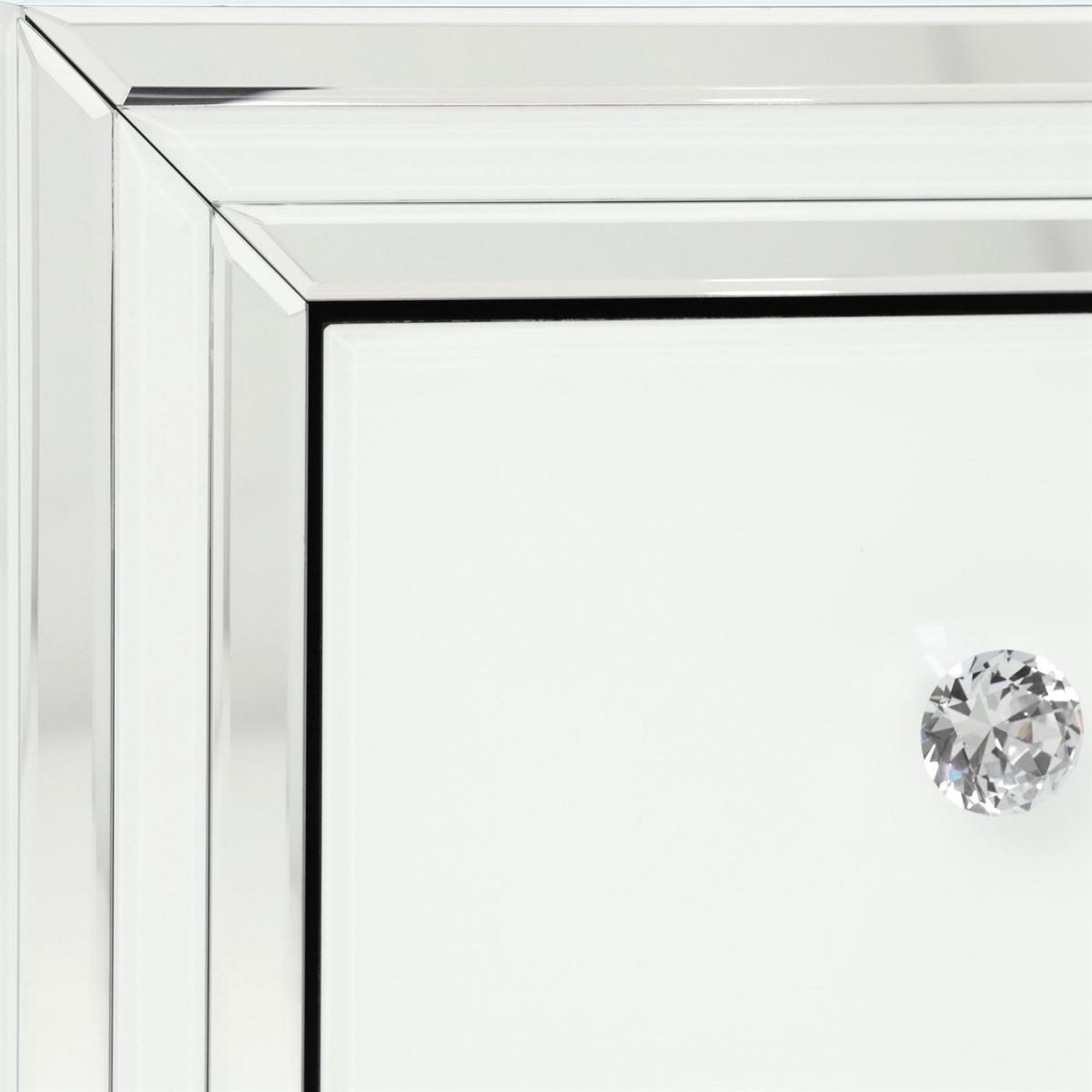 Design. Inspired by Art Deco styling the Krystal two drawer bedside cabinet is an elegant addition to the stunning Krystal collection, featuring white glass surfaces with mirrored glass details which have been perfectly bevelled creating crisp and defined edges. Steel runners provide a smooth glide when opening and closing the drawers adding to the premium feel of this piece. A timeless classic that will look effortless for years to come.