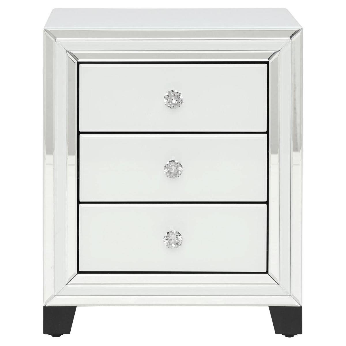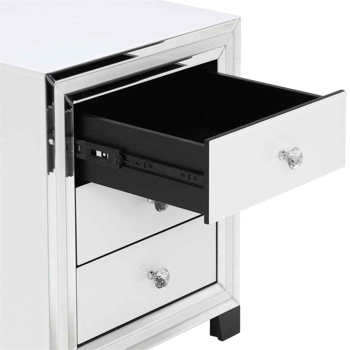Design. This striking 3 drawer bedside in beautiful white and mirrored glass comes from the stunning Krystal bedroom collection. Offering elegance and glamour, this practical unit has wonderful bevelled features creating a crisp and clean look while its diamante handles and dark feet help provide a wonderful boutique feel. Steel runners provide a smooth glide when opening and closing the drawers adding to the overall premium feel of this entire collection. With 3 handy drawers this bedside ensures all your night time essentials can be in ease of reach.