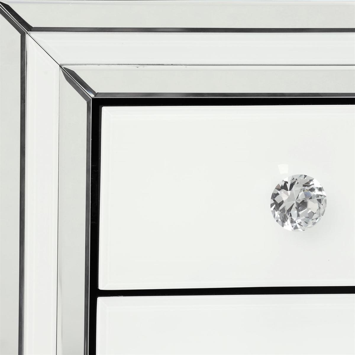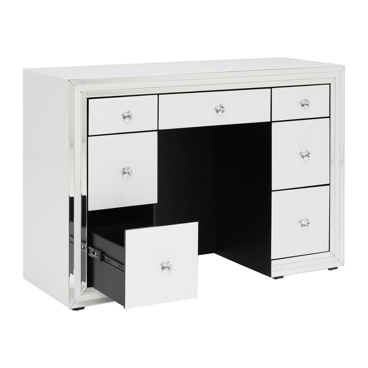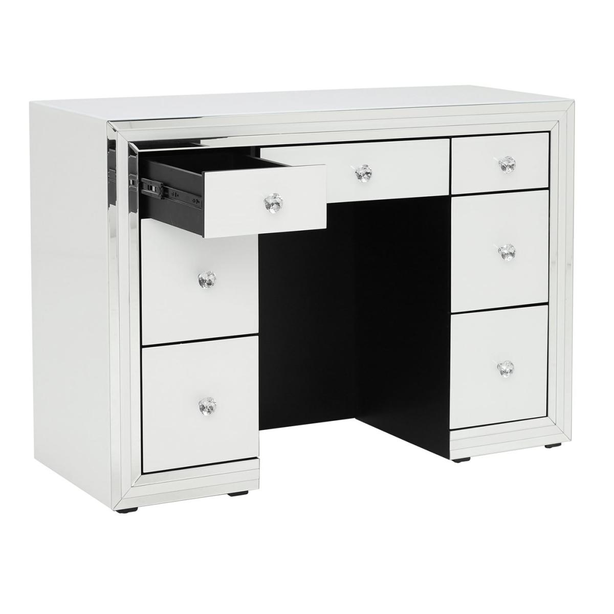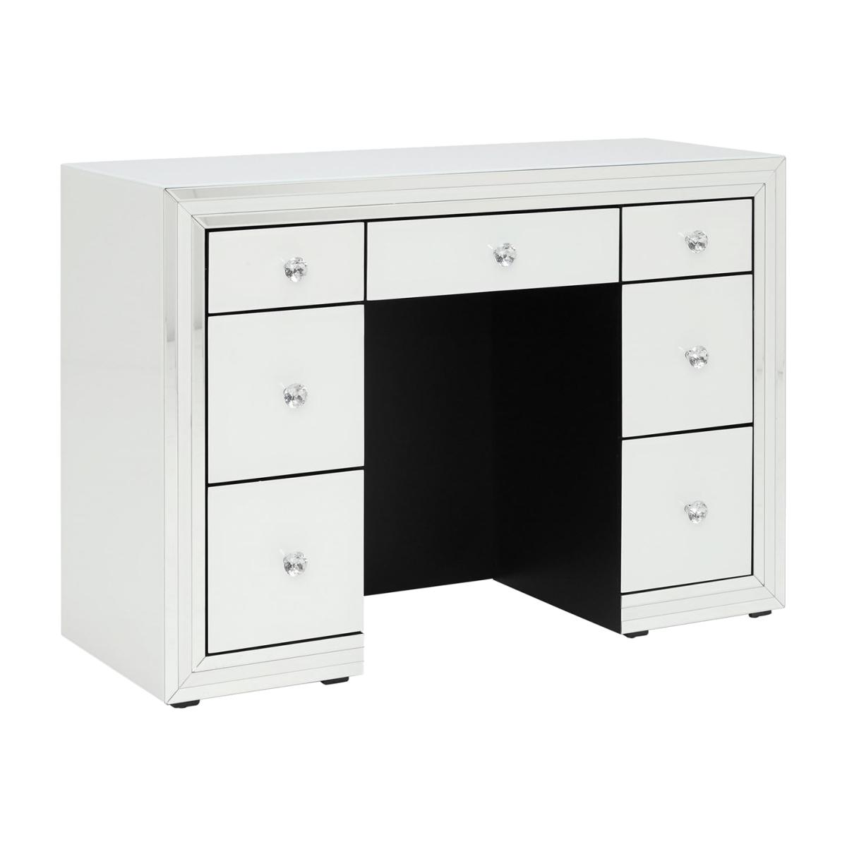 Design. Getting ready will never feel like a chore with the stunning Krystal seven drawer dressing table. Featuring crisp bevelled edges, glamorous crystal handles and white glass mirrored surfaces the Krystal collection creates an opulent and luxurious feel. The bold design of the seven drawer dressing table boasts Art Deco influences and offers ample storage thanks to the combination of shallow and deep drawers. Pair with the vanity mirror and stool to create a stunning focal point in your dressing room or bedroom.