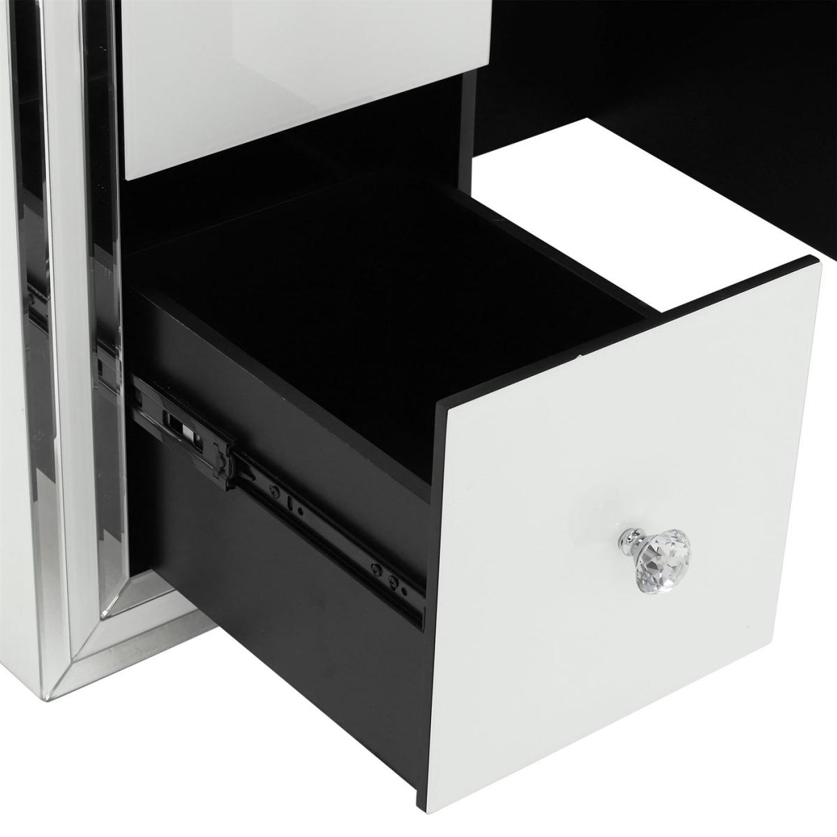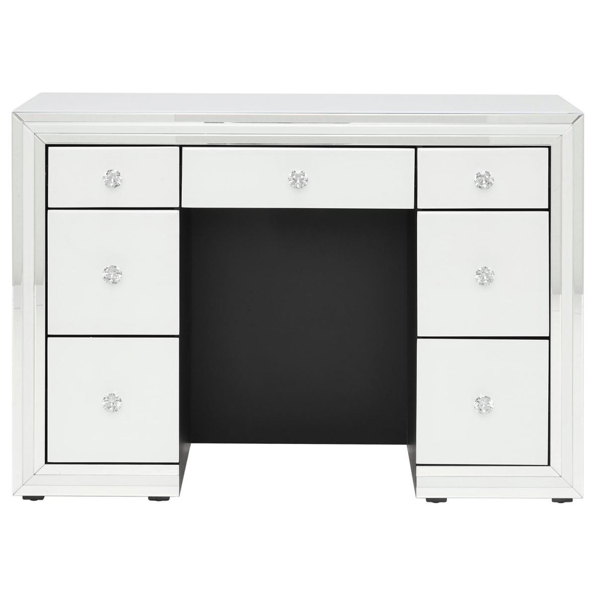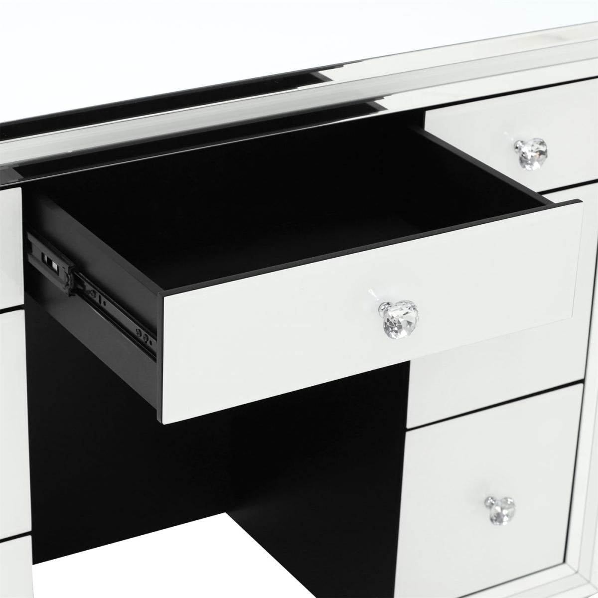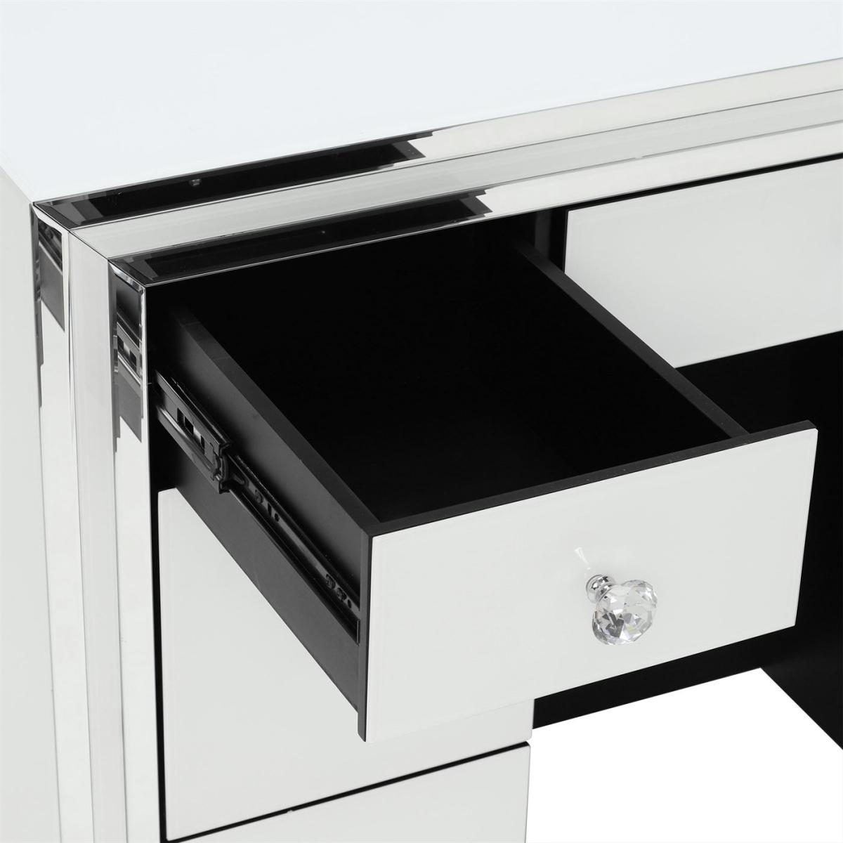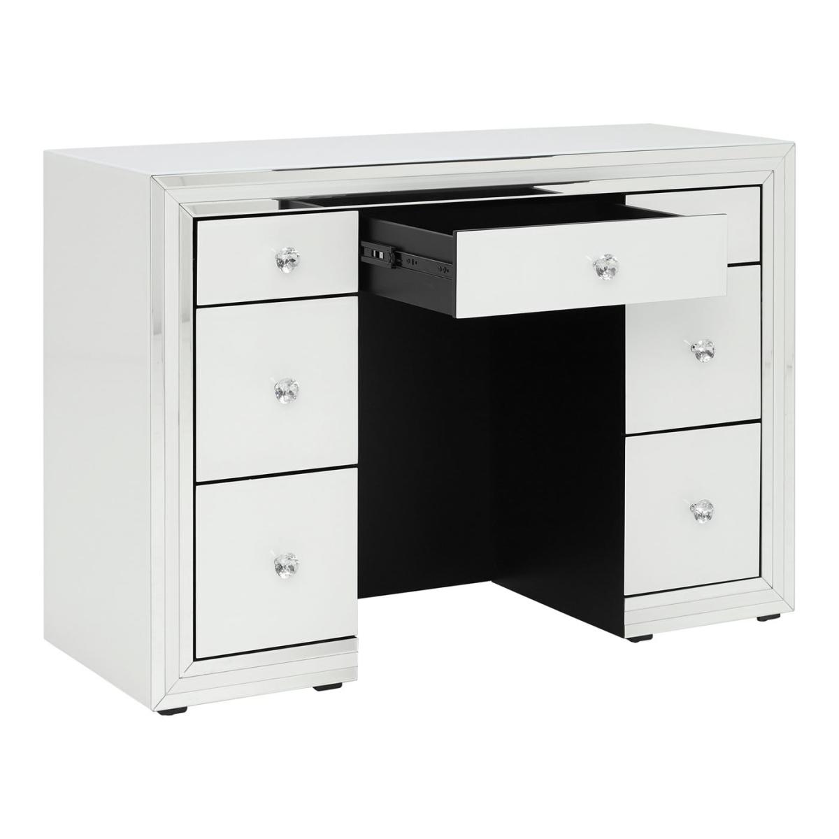 Design. Getting ready will never feel like a chore with the stunning Krystal seven drawer dressing table. Featuring crisp bevelled edges, glamorous crystal handles and white glass mirrored surfaces the Krystal collection creates an opulent and luxurious feel. The bold design of the seven drawer dressing table boasts Art Deco influences and offers ample storage thanks to the combination of shallow and deep drawers. Pair with the vanity mirror and stool to create a stunning focal point in your dressing room or bedroom.