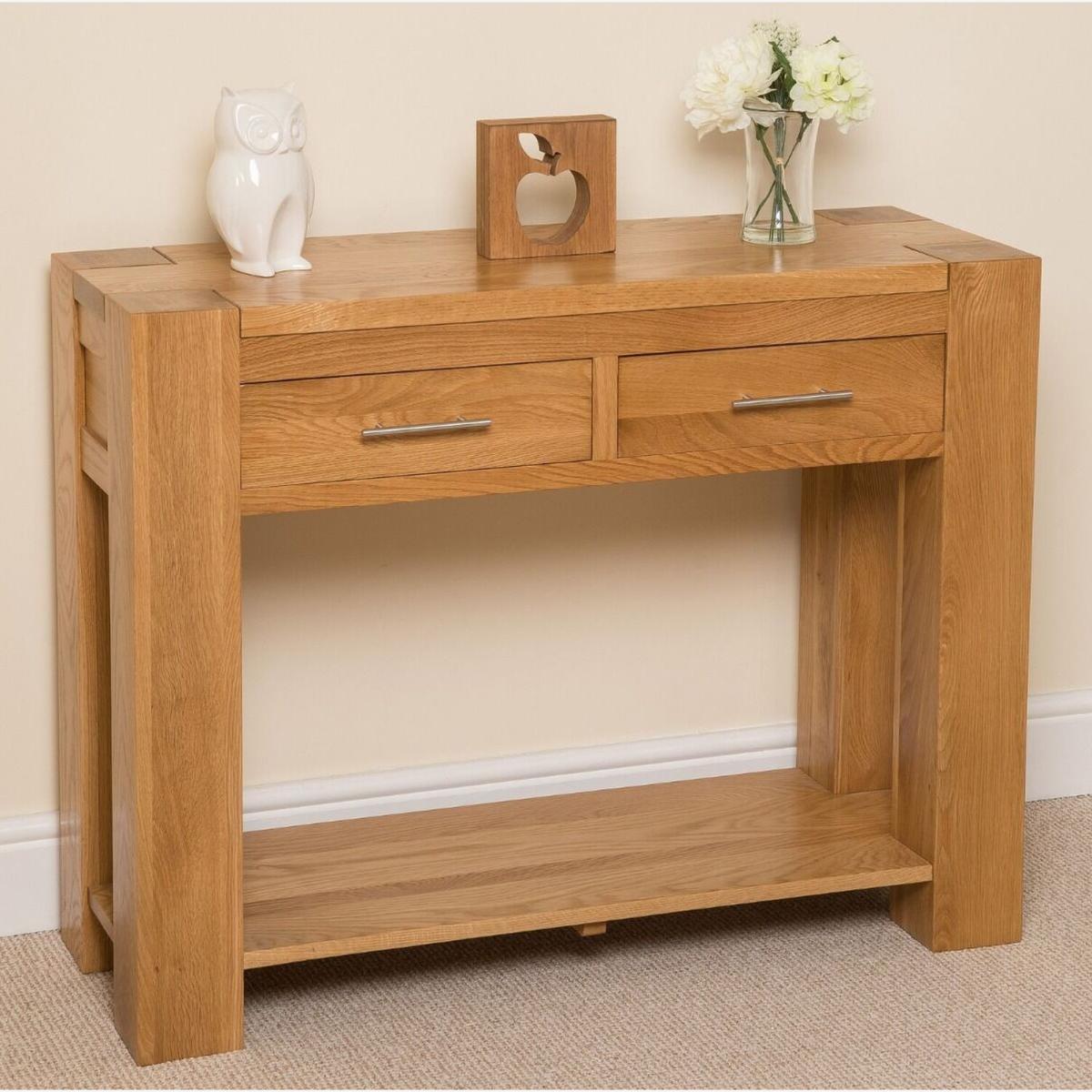 pOne of our most popular oak console tables, the Kuba 2 drawer storage unit ushers a sense of robustness to any hallway, living room or dining room setting. Made using only 100 solid oak timber the Kuba console table is not part veneer - part solid oak furniture as seen in many high street outlets and online stores, this is 100 solid oak at its finest. Even the drawer backs and bases are solid oak.pp. Handcrafted from nothing but solid oak wood, including drawer backs and bases, no veneer, chipboard or MDF are used anywhere in the construction of this console table. Each piece of wood goes through a process of seasoning and kiln drying until its ready to be crafted. Made using time honoured woodworking techniques, featuring tongue and groove construction and dovetail joints on every drawer with solid oak backs and bases.pp. Measuring 110 x 40 cm, the wooden storage unit will easily accommodate a key bowl, a telephone or your daily post. The soft rounded corners and solid wood construction make the Kuba console table a worthwhile investment, designed and built to last you a lifetime.pp. All our console tables for living room come with a 12 month manufacturers warranty and no quibble 30 day money back guarantee, so you can buy with confidence.p
