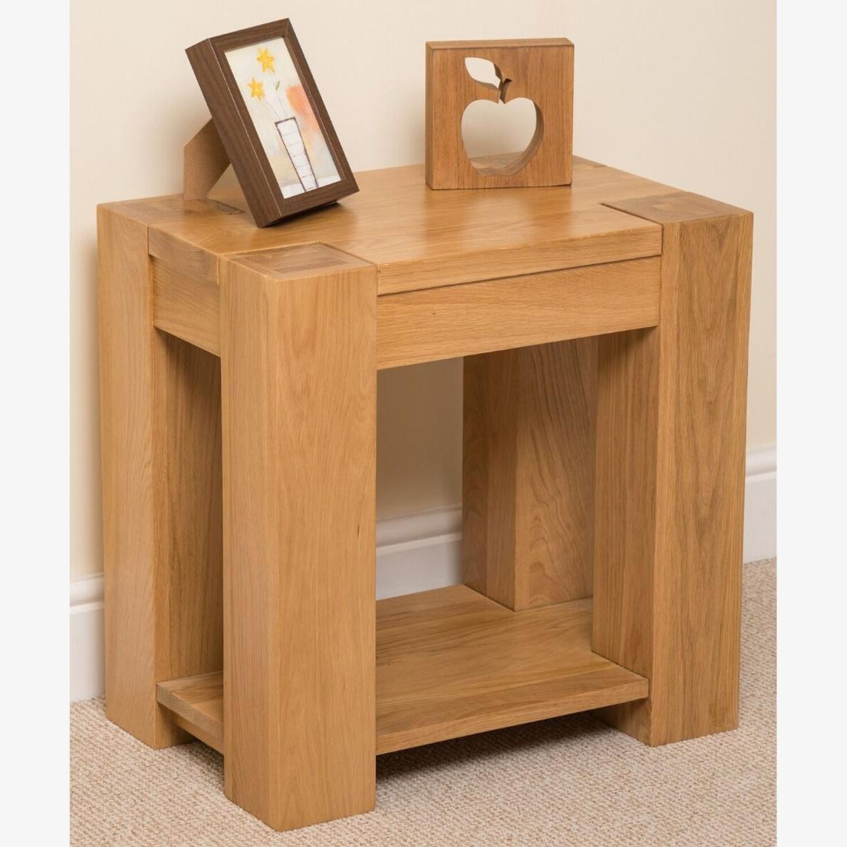 pWith its clean straight lines, thick cut table top with clean straight lines and chunky robust square set legs, the Kuba oak lamp side table will happily be the centerpiece in any living room. The minimalist design is very much in keeping with the look of today but will work in perfect harmony with both modern and traditional homes.pp. Perfectly proportioned, measuring 60 x 40 cm, the Kuba oak lamp table, provides the perfect perch for snacks and drinks, magazines and other living room essentials. Versatile and practical, the Kuba lamp table can even be used as a bedside table or oak side table. Featuring a handy shelf, the Kuba lamp table not only looks great but it's packed full of handy storage space for those newspapers and TV remotes.pp. Handcrafted from 100 solid oak wood and built to last, using time honoured woodworking techniques, no veneer, chipboard or MDF is used anywhere in the construction of this living room oak side table. Each piece of wood goes through a process of seasoning and kiln drying until its ready to be crafted. A light lacquered finish enhances the natural wood grain and ensures all year round protection.pp. All our living room tables come with a 12 month manufacturers warranty and no quibble 30 day money back guarantee, so you can buy with confidence.p