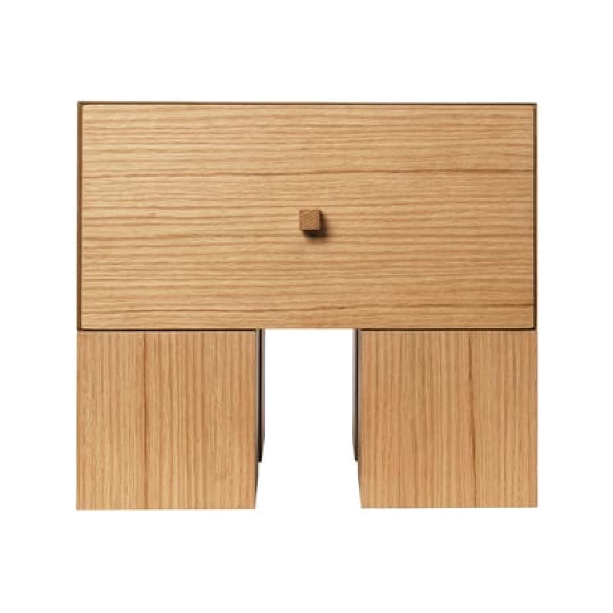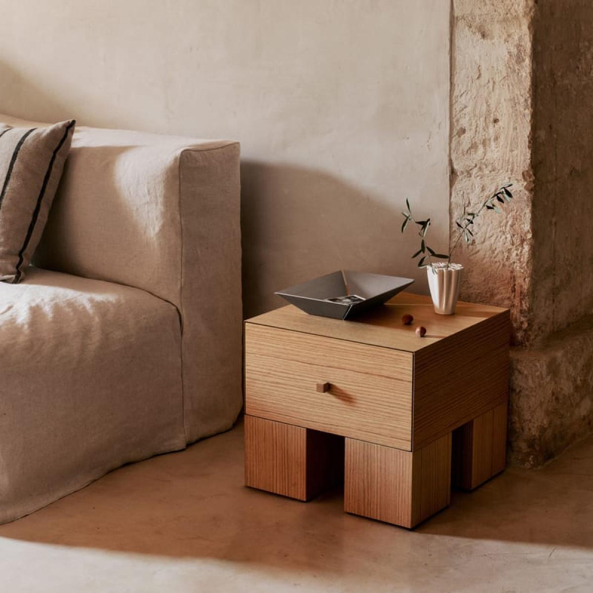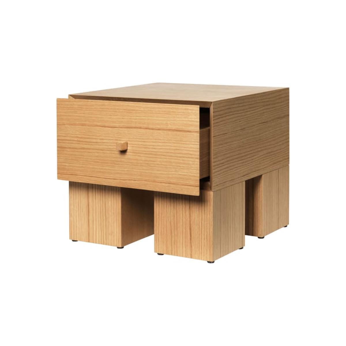 Minimalist cubic designThe Kuben Bedside table seduces with its rigorous geometric aesthetic. Designed in FSC®-certified Natural oak veneer, it combines eco-responsibility with exacting craftsmanship. Its mitered assembly, with no visible joints, accentuates its monolithic appearance, while its oversized cubic legs give it a bold visual presence. Sculptural geometry and assertive minimalismEvery detail of Kuben reveals precision craftsmanship. Its cubic silhouette, punctuated by a discreet square Handle, plays with volumes and proportions. The spacious Drawer offers practical storage while preserving the purity of its lines. Perfectly at home in a bedroom with a minimalist, brutalist or Japandi style, Kuben embodies a certain idea of discreet luxury. Why choose the Kuben Bedside table? - Assertive geometric design, inspired by minimalist architecture - Made from FSC®-certified wood: sustainable and responsible - Meticulous finish with invisible mitering - Large Storage Drawer with refined Handle - Ideal for modern, sleek or contemporary interiors Enhance your Night space with a piece that combines formal radicalism and Natural sophistication. In detail: Variation : Oak Brand :Ferm Living Type : Bedside table Colour : Oak Material : Ashwood veneered with FSC®-certified Natural oak, with MDP core. Dimensions : W 45 x D 45 cm x H 40 cm Weight : 46.2 lb Characteristics : 1 Drawer - FSC wood Show less