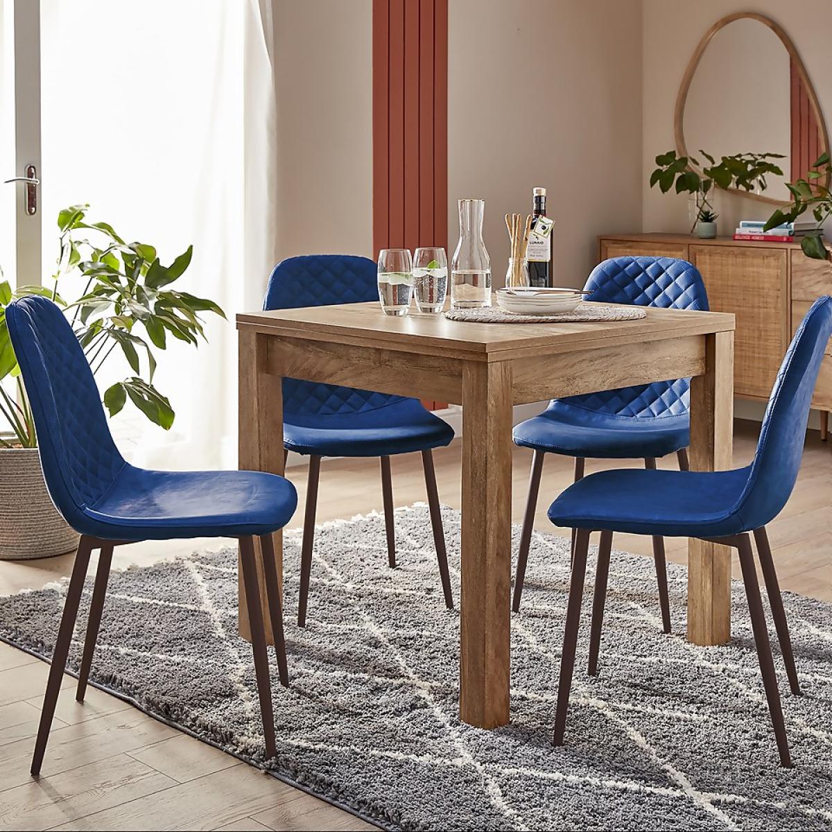 With its charming aesthetic, Kubu extending dining table paired with 4 navy Perth upholstered dining chairs is a bohemian beauty. Savour meals, play board games and enjoy conversations at this elegant dining table. You can double your dining space in an instance by flipping the top over; taking this table from a 4 to a 6-seater. Scale down for cosier dinners and extend out for that big Sunday lunch. The laidback appeal of the boho look is great for the dining room, giving the space a relaxing vibe.