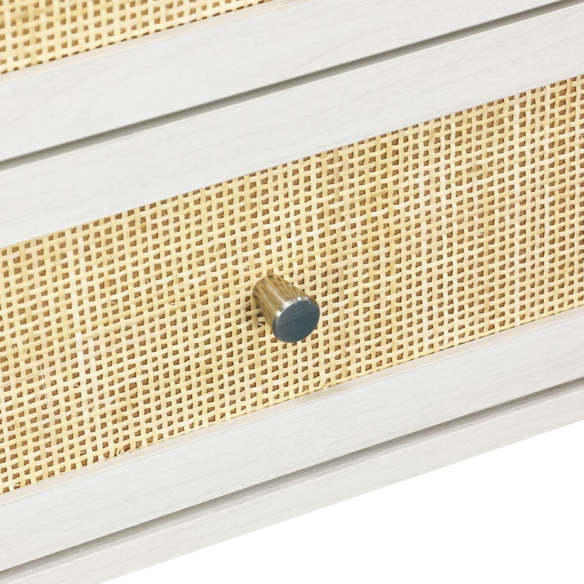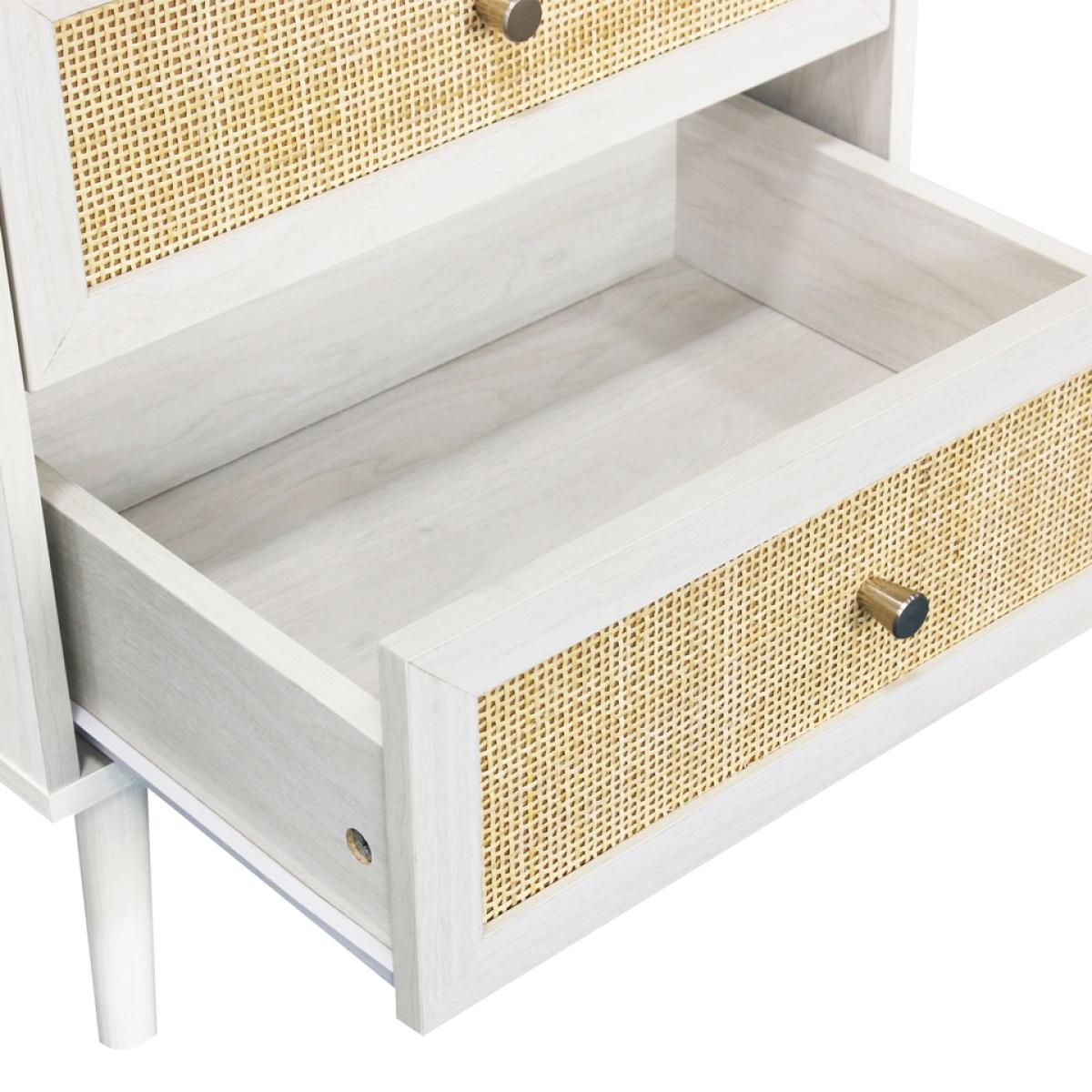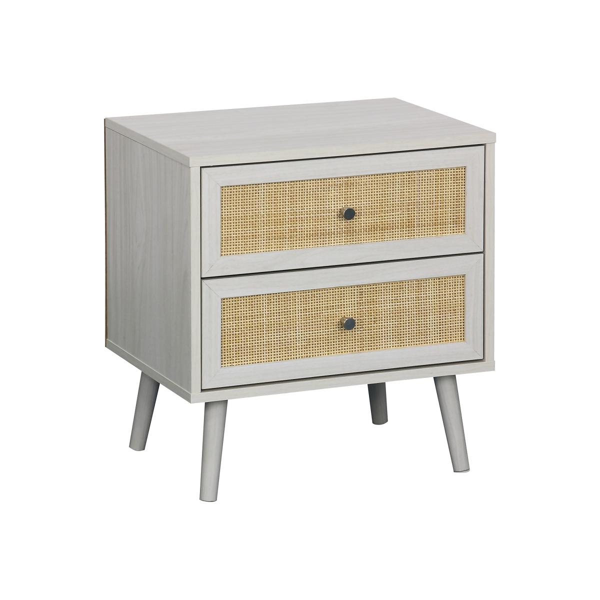 With its charming aesthetic, Kubu is a bohemian beauty. Retro woven cane panels meet hardwearing textured whitewashed effect oak, making this range a visual treat. Our Kubu bedside table has 2 drawers for your bedside belongings. It makes the perfect perch for a reading lamp or to pop your phone of an evening. It's raised from the ground on solid tapered legs. The laidback appeal of the boho look is ideal for the bedroom, creating relaxing vibes that are perfect for your snooze space.