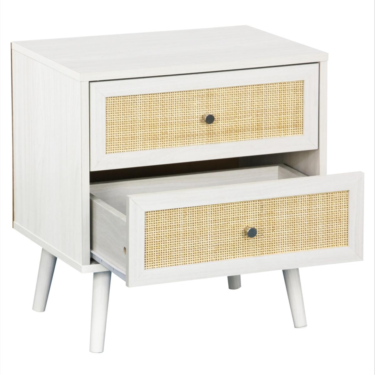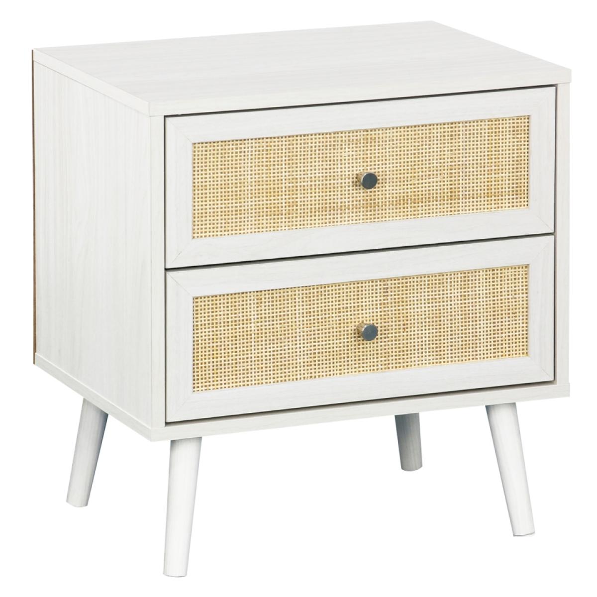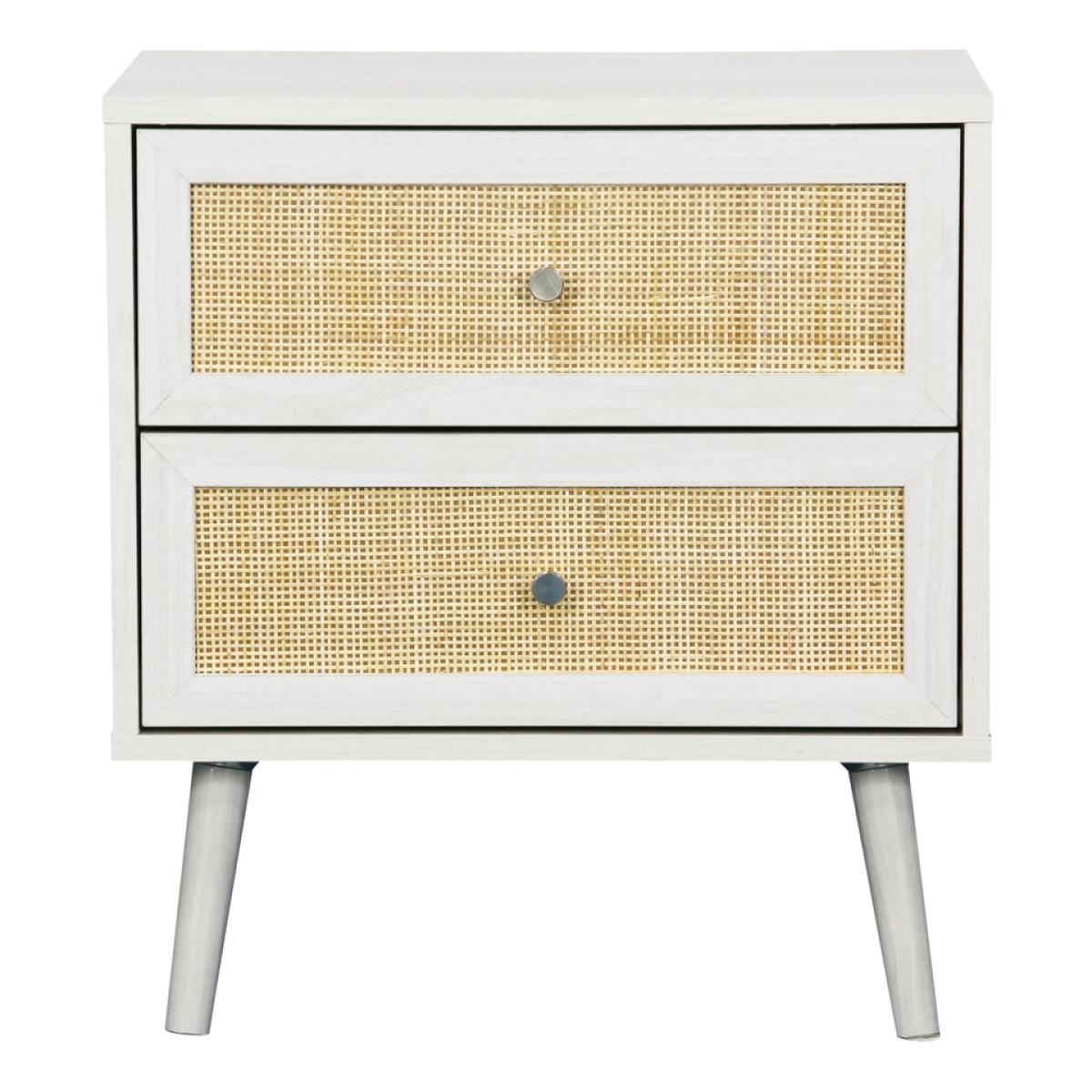 With its charming aesthetic, Kubu is a bohemian beauty. Retro woven cane panels meet hardwearing textured whitewashed effect oak, making this range a visual treat. Our Kubu bedside table has 2 drawers for your bedside belongings. It makes the perfect perch for a reading lamp or to pop your phone of an evening. It's raised from the ground on solid tapered legs. The laidback appeal of the boho look is ideal for the bedroom, creating relaxing vibes that are perfect for your snooze space.