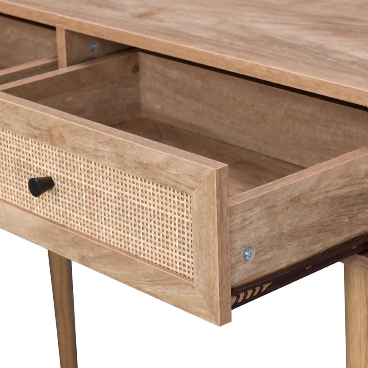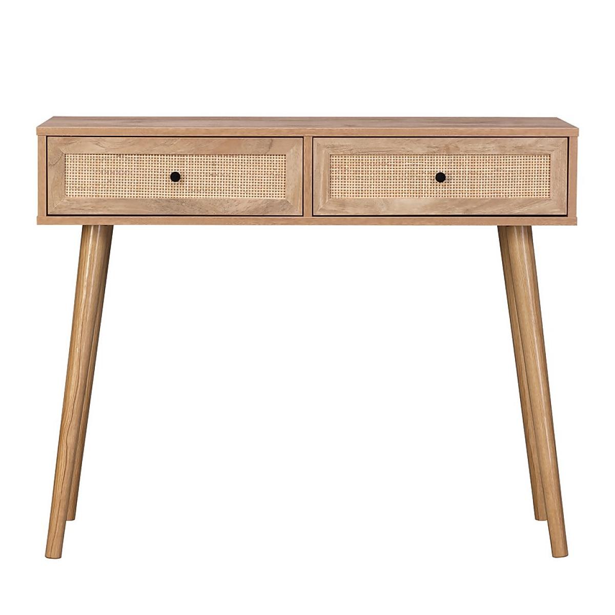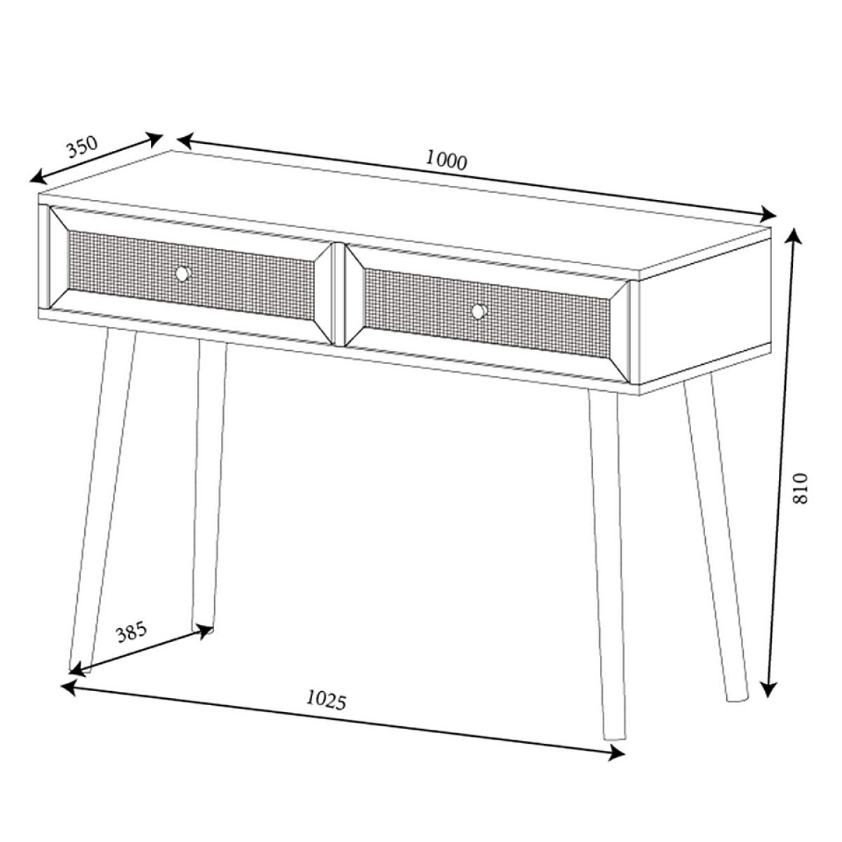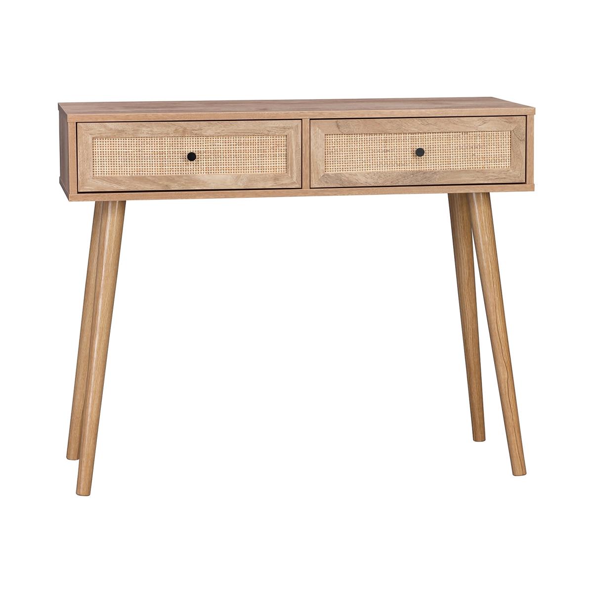With its charming aesthetic, Kubu is a bohemian beauty. Retro woven cane panels meet hardwearing textured effect oak, making this range a visual treat. With a slimline design, Kubu can be used as a charming console or a delightful dressing table, making it a versatile piece. Make-up, hair accessories, or paperwork and mail can all be hidden away behind the 2 drawers. It's raised from the ground on solid tapered legs. If you choose to style it as a dressing table, the laidback appeal of the boho look is great for the bedroom, creating relaxing vibes that are perfect for your snooze space.