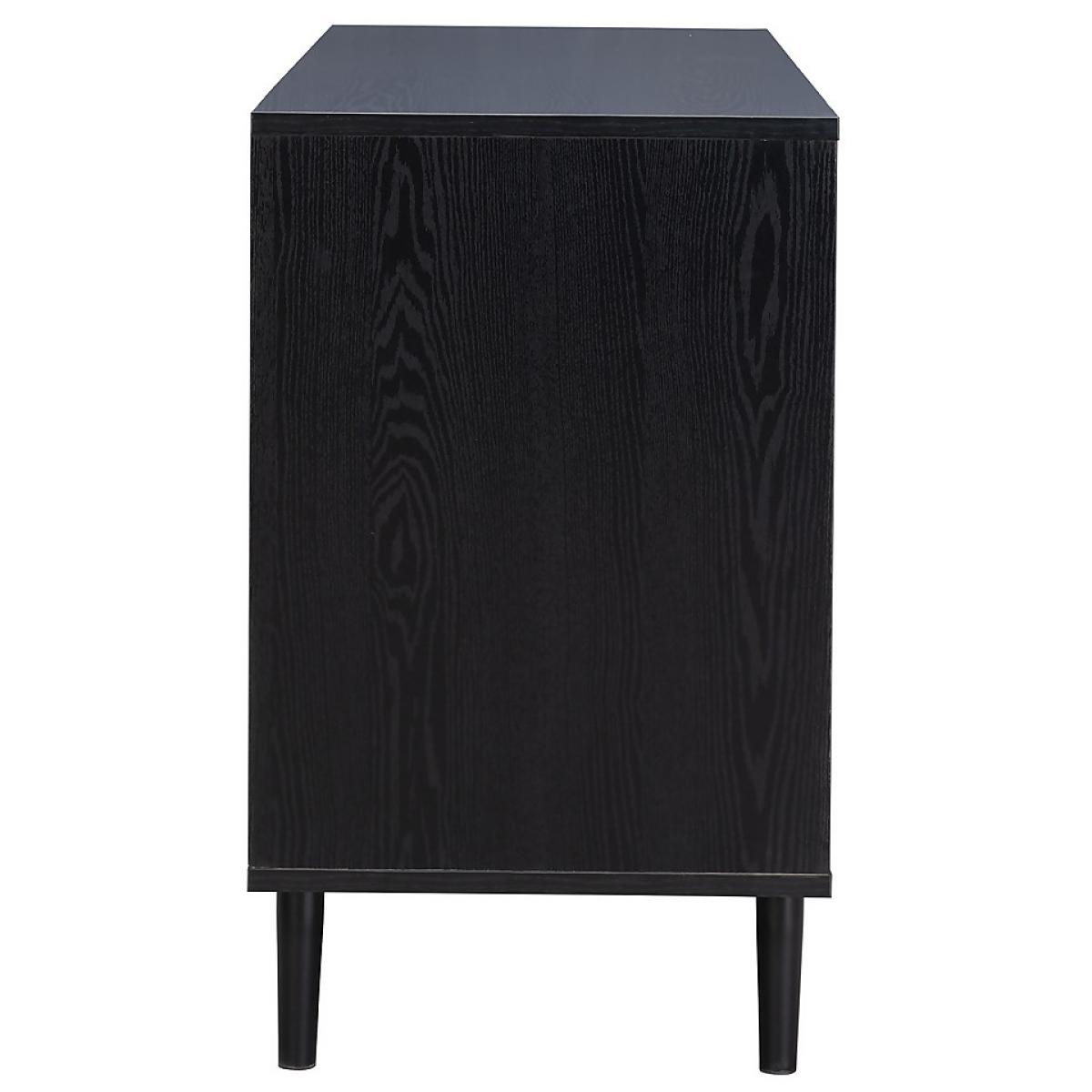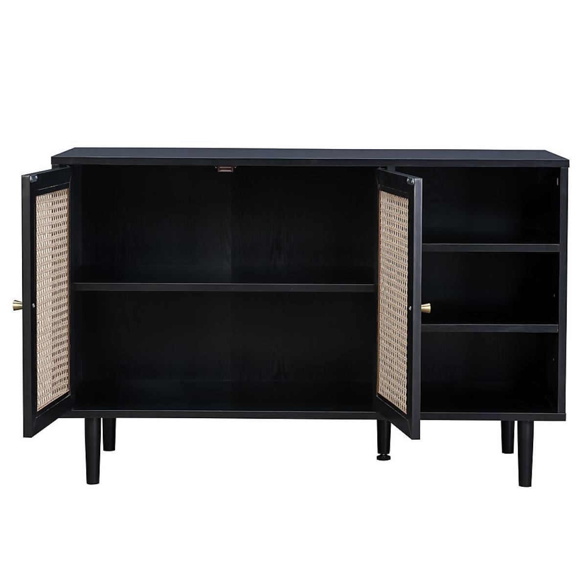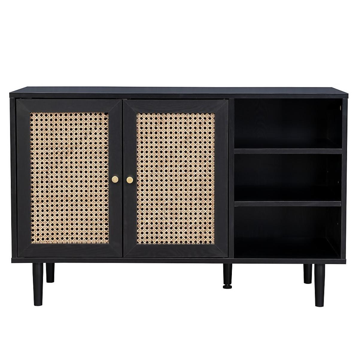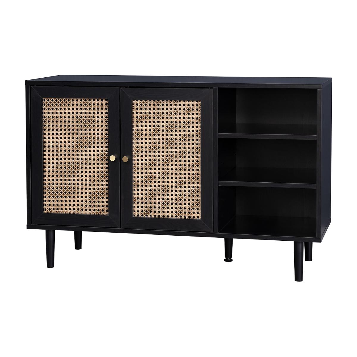 With its charming aesthetic, Kubu is a bohemian beauty. Retro woven cane panels meet hardwearing black textured wood effect finish, making this range a visual treat. Our Kubu sideboard is the perfect storage all-rounder. Books, board games and blankets can all be hidden away behind the 2 cupboards and 3 shelves. It's raised from the ground on solid tapered legs. Decorate the top with a choice plant or some family photos. The laidback appeal of the boho look is great for the lounge or dining room, creating relaxing vibes that are perfect for your chill-out area.