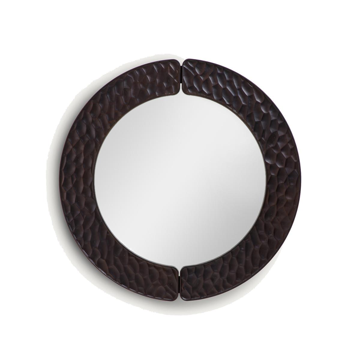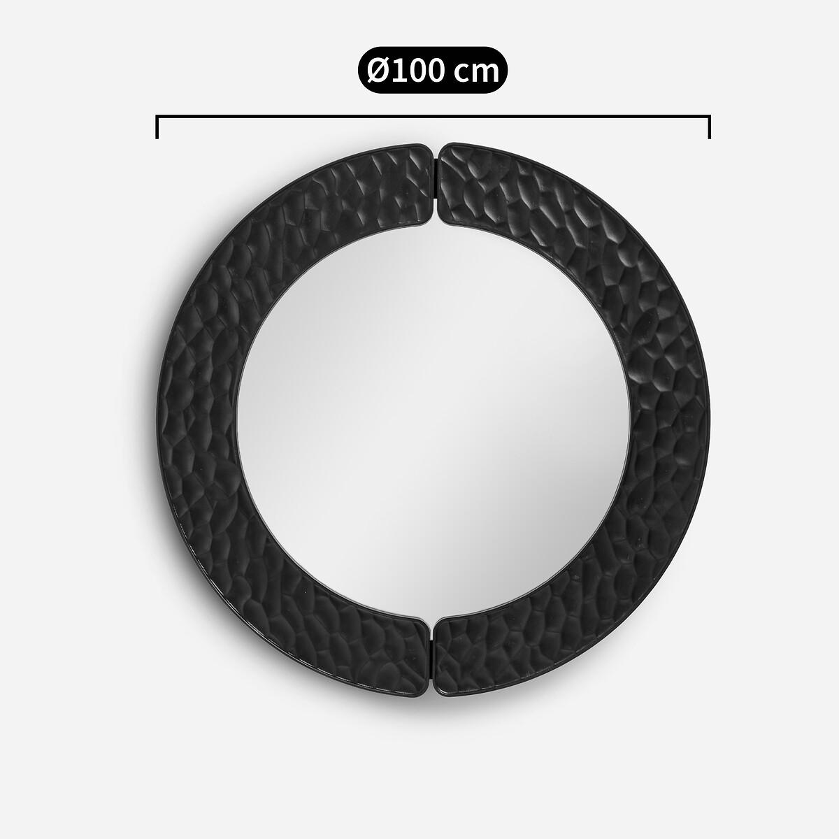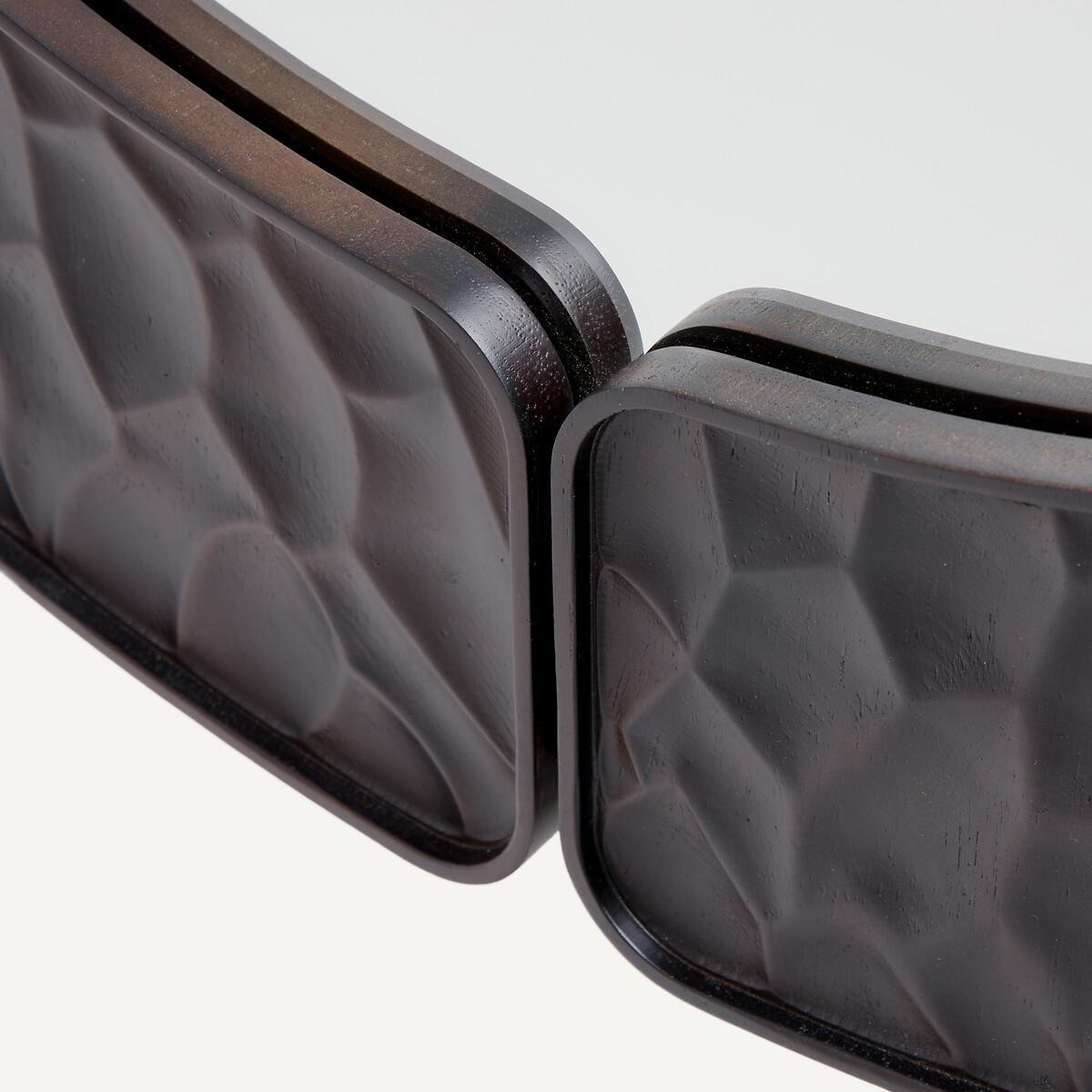 A tribute to the ancestral work of craftsmen, the raised wooden frame of this mirror has been carved with a chisel, a tool with a curved blade originally used by cabinet-makers to shape concave surfaces. A contemporary interpretation of authentic tribal style. Product Details • Structure and frame in roasted coffee-coloured rubberwood, nitrocellulose finish • Back in black-painted MDF, FSC®-certified wood • Fixing bars (screws and dowels not supplied)Dimensions • Diameter: 100cm • Thickness: 3cm • Sold pre-assembled. • WOOD FROM SUSTAINABLY MANAGED FORESTS. FSC® certified wood comes from forests that are environmentally, socially and economically well managed. Parcel Dimensions 1 parcel • W111.5 x H12.5 x D111.5cm. 17kg
