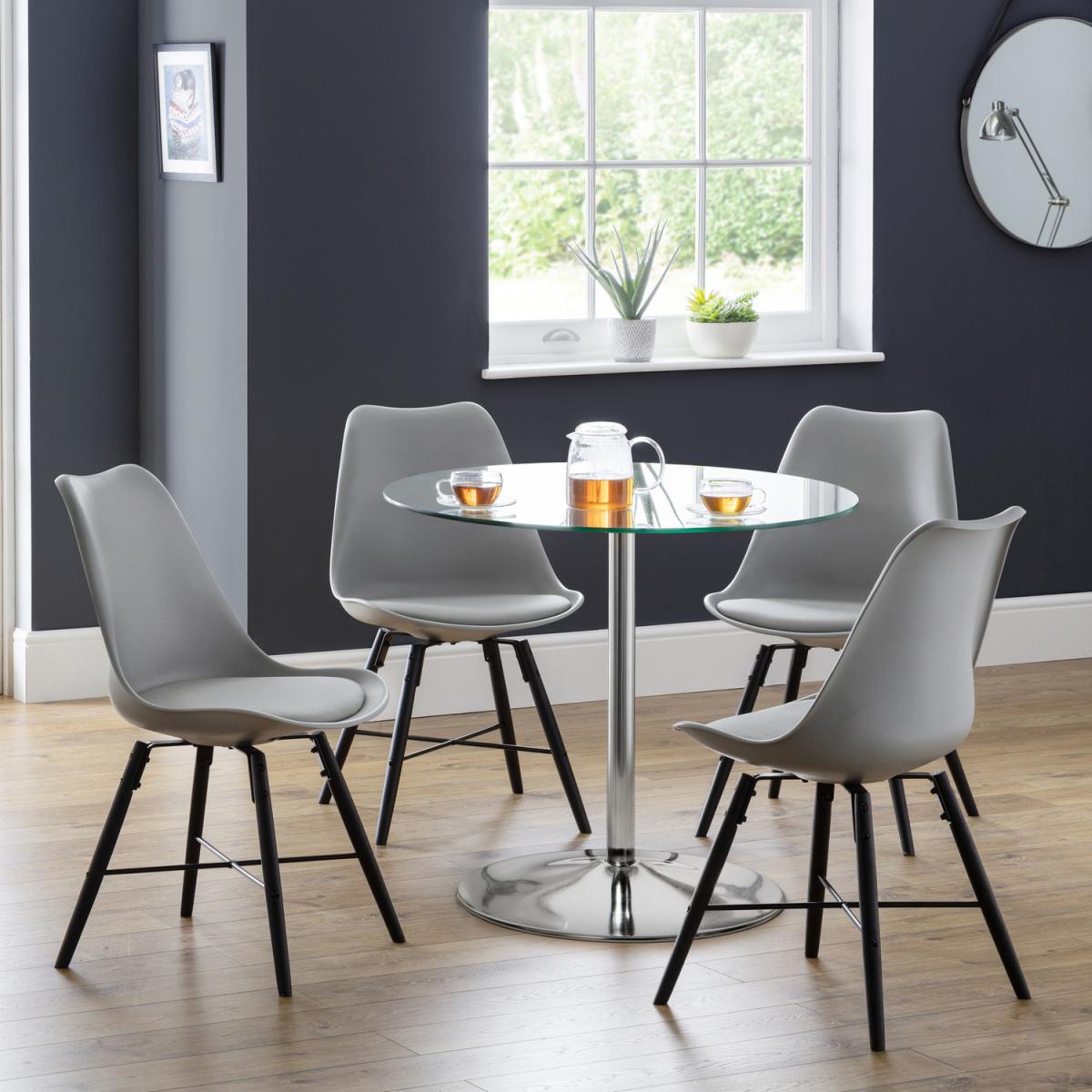 I love this set for its sleek, modern look that pairs well with a variety of interiors, from minimalist to Scandi-inspired spaces. The round table design encourages conviviality and makes small kitchens or dining areas feel more inviting. The Kari chairs in grey are versatile, neutral enough to work with both bold and muted colour schemes, and their simple form adds a touch of contemporary elegance. To style it effectively, consider layering with textured tableware or adding a cosy runner to soften the glass surface. It’s perfect for casual family meals or for luxe, understated dining setups in open-plan living areas. Keep the surrounding decor simple to let the clean lines of the set stand out, or add colourful accessories for a pop of contrast.
