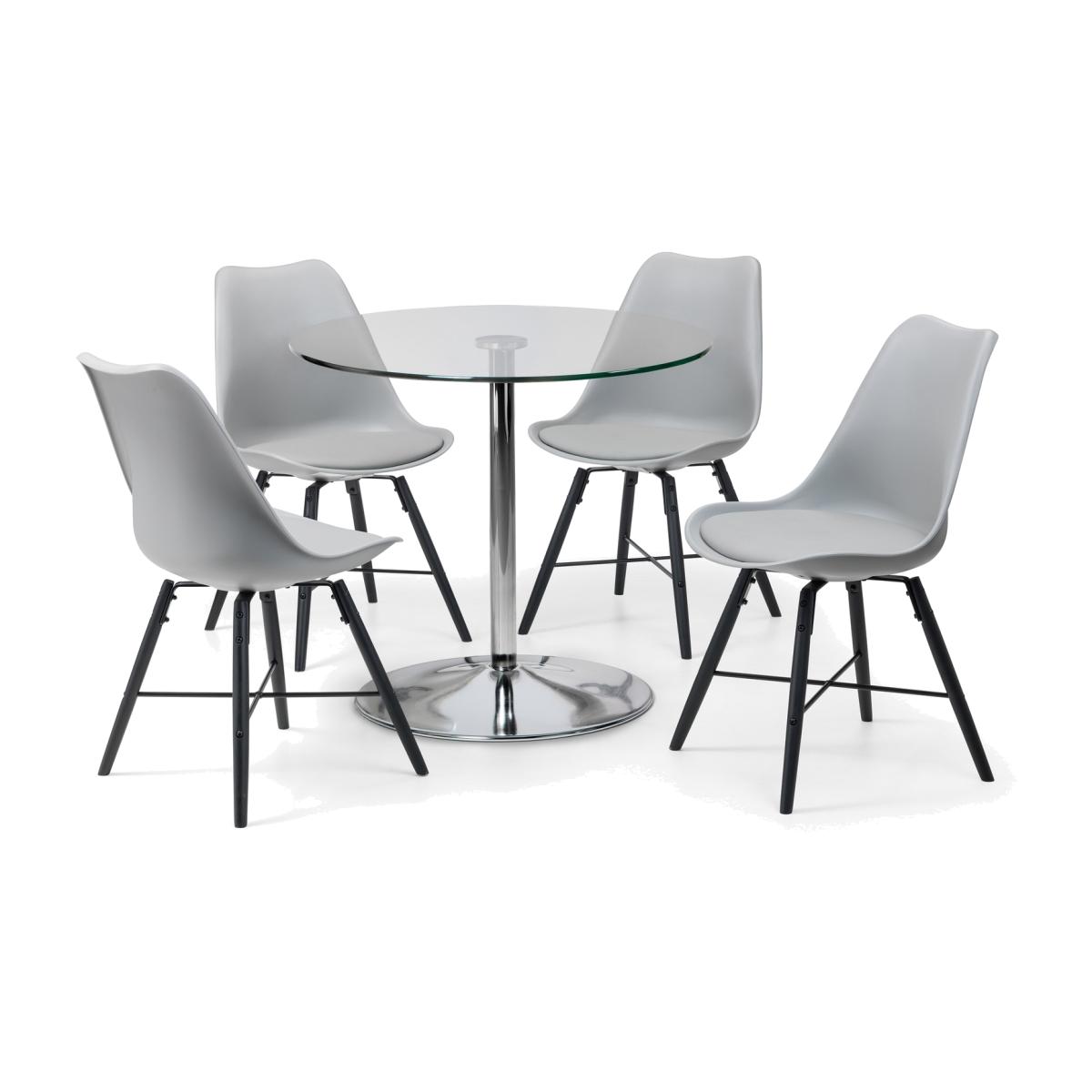 This Kudos Glass Pedestal Table has a contemporary chrome and glass finish that is perfect for your dining room or as a modern kitchen diner. The pedestal table is easy to pick up and move around the room and it can comfortably seat 4 people. Perfect for a cosy and casual dinner with friends. Matched with Kari Chairs.