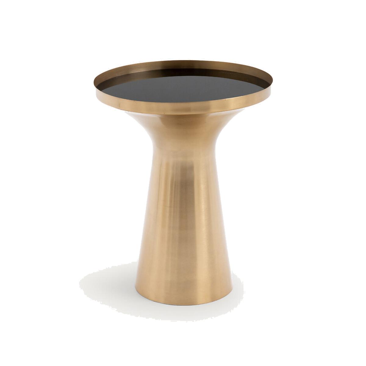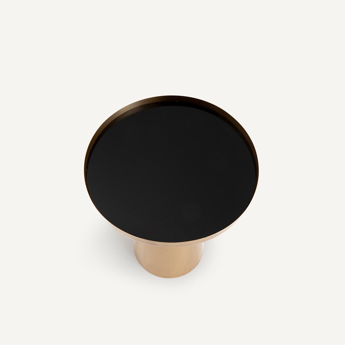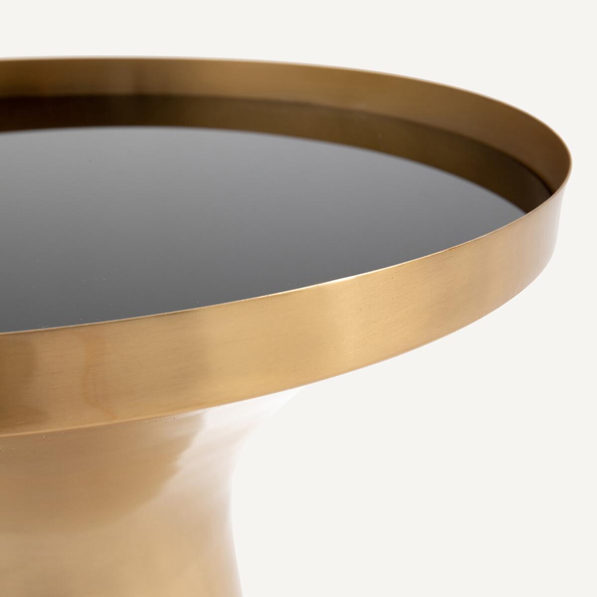 You'll be charmed by the sleek shape of the Kumar end table. An elegant combination of brass and tinted glass. Product Details • Structure in aged brass • Table top in black tinted glass. Dimensions • Diameter: 40cm • Height: 50cmDelivery:. Sold pre-assembled. Available for home delivery. Note! Please check that all access points are large enough to accommodate your delivery (doors, stairs, lifts). Dimensions and weight of parcel • L48 x H60 x D48 cm. 7kg