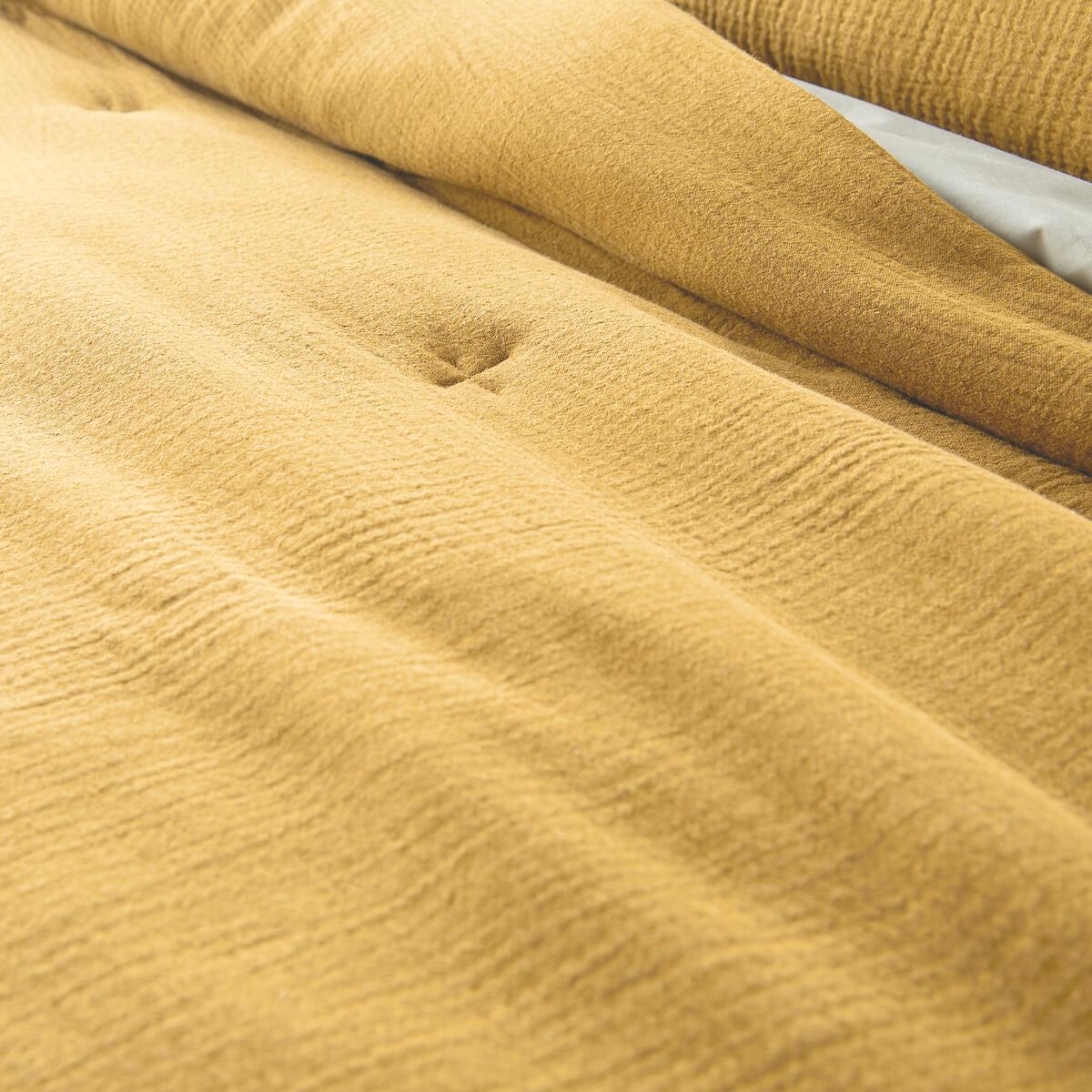 I really like this quilt because of its simple, natural aesthetic and the quality of the cotton muslin - it’s perfect for adding a touch of understated luxury. It works well in both modern and bohemian interiors, especially when layered with textured cushions or throws in complementary tones. I recommend draping it loosely for a relaxed look or folding it neatly at the foot of the bed for a tidy finish. Its neutral, warm hue also makes it versatile for various colour schemes, helping to create a calm and inviting bedroom environment. Practical styling tip: pair it with crisp white sheets and a few accent cushions for a fresh, pared-back scheme, or mix with patterned textiles for added visual interest.