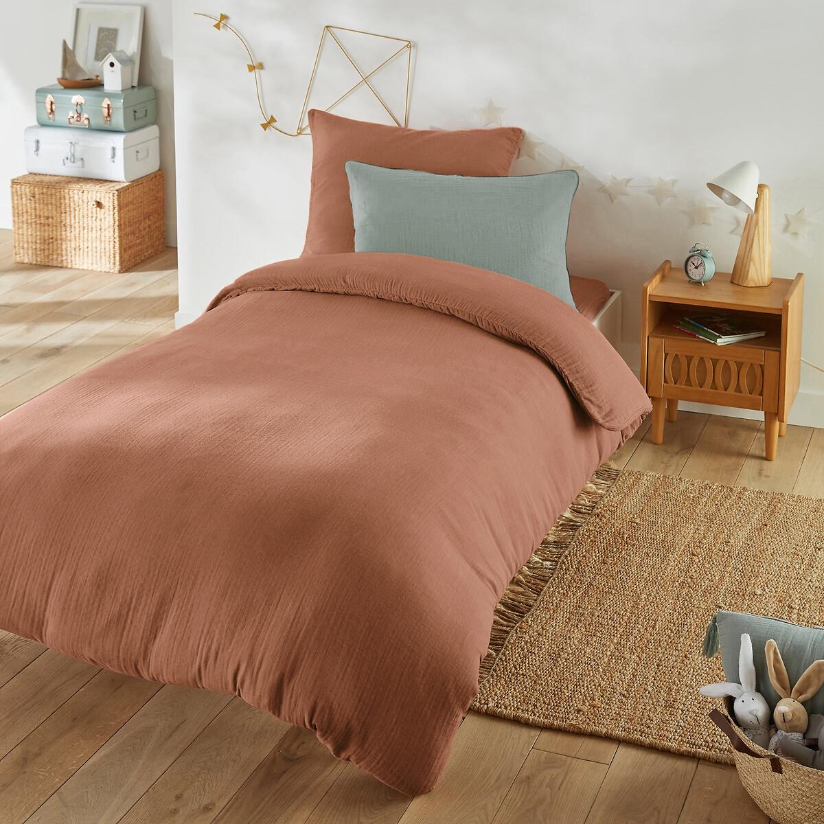 Available in very contemporary colours, the Kumla cotton gauze duvet cover gives a cosy and warm atmosphere to your child's room. Cotton muslin is light, supple and super soft. Delicately embossed, it does not require ironing. Product Details • 100% cotton • 140 x 150cm: Envelope-style opening • Straight buttoned hem Care Advice • Machine washable at 60°C • By washing your laundry at 40°C instead of 60°C, you limit energy consumption • Product will regain its texture after tumble drying • The cotton muslin may show slight marks due to packaging creases. We recommend that you wash the product as soon as you receive it, and then tumble dry it to restore its look and the beautiful waffle effect. Dimensions • 140 x 150cm: Adjustable bed • 140 x 200cm: Single • 200 x 200cm: Double • MADE IN PORTUGAL. • OEKO-TEX® Standard 100. Standard 100 certification by OEKO-TEX® tests textile products for harmful substances via an independent, international label.