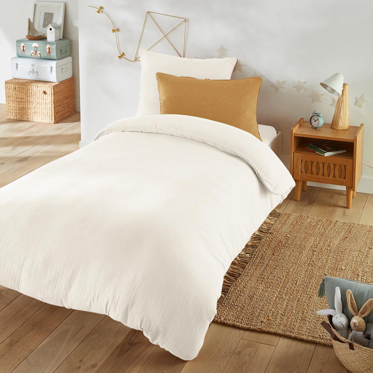 Available in very contemporary colours, the Kumla cotton gauze duvet cover gives a cosy and warm atmosphere to your child's room. Cotton muslin is light, supple and super soft. Delicately embossed, it does not require ironing. Product Details • 100% cotton • 140 x 150cm: Envelope-style opening • Straight buttoned hem Care Advice • Machine washable at 60°C • By washing your laundry at 40°C instead of 60°C, you limit energy consumption • Product will regain its texture after tumble drying • The cotton muslin may show slight marks due to packaging creases. We recommend that you wash the product as soon as you receive it, and then tumble dry it to restore its look and the beautiful waffle effect. Dimensions • 140 x 150cm: Adjustable bed • 140 x 200cm: Single • 200 x 200cm: Double • MADE IN PORTUGAL. • OEKO-TEX® Standard 100. Standard 100 certification by OEKO-TEX® tests textile products for harmful substances via an independent, international label.