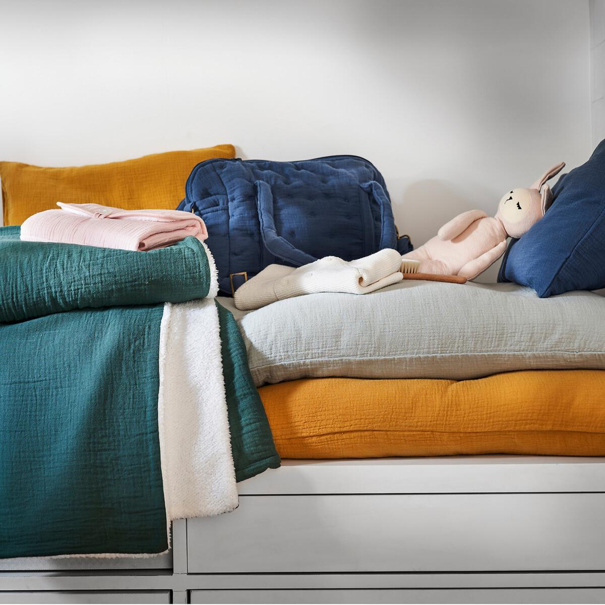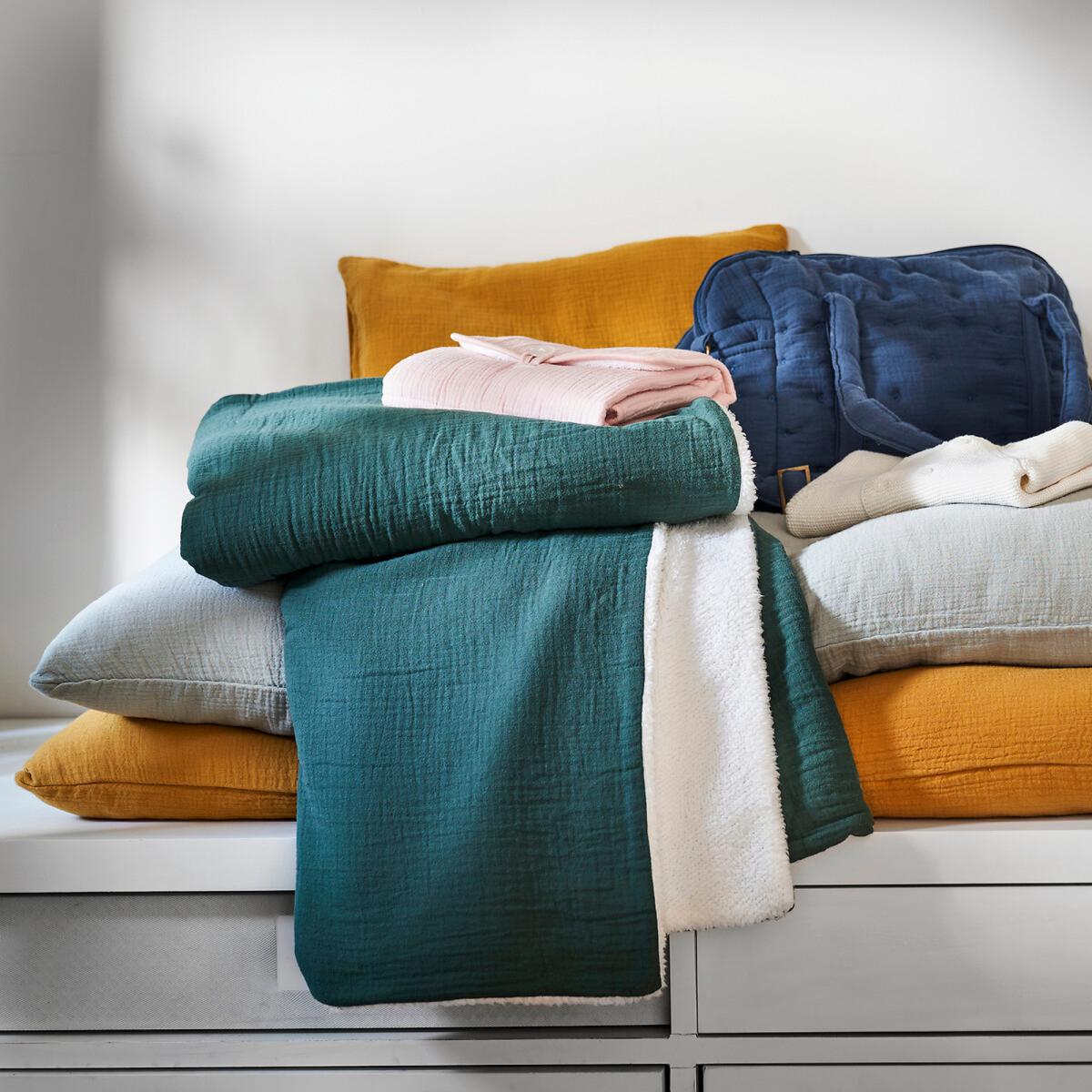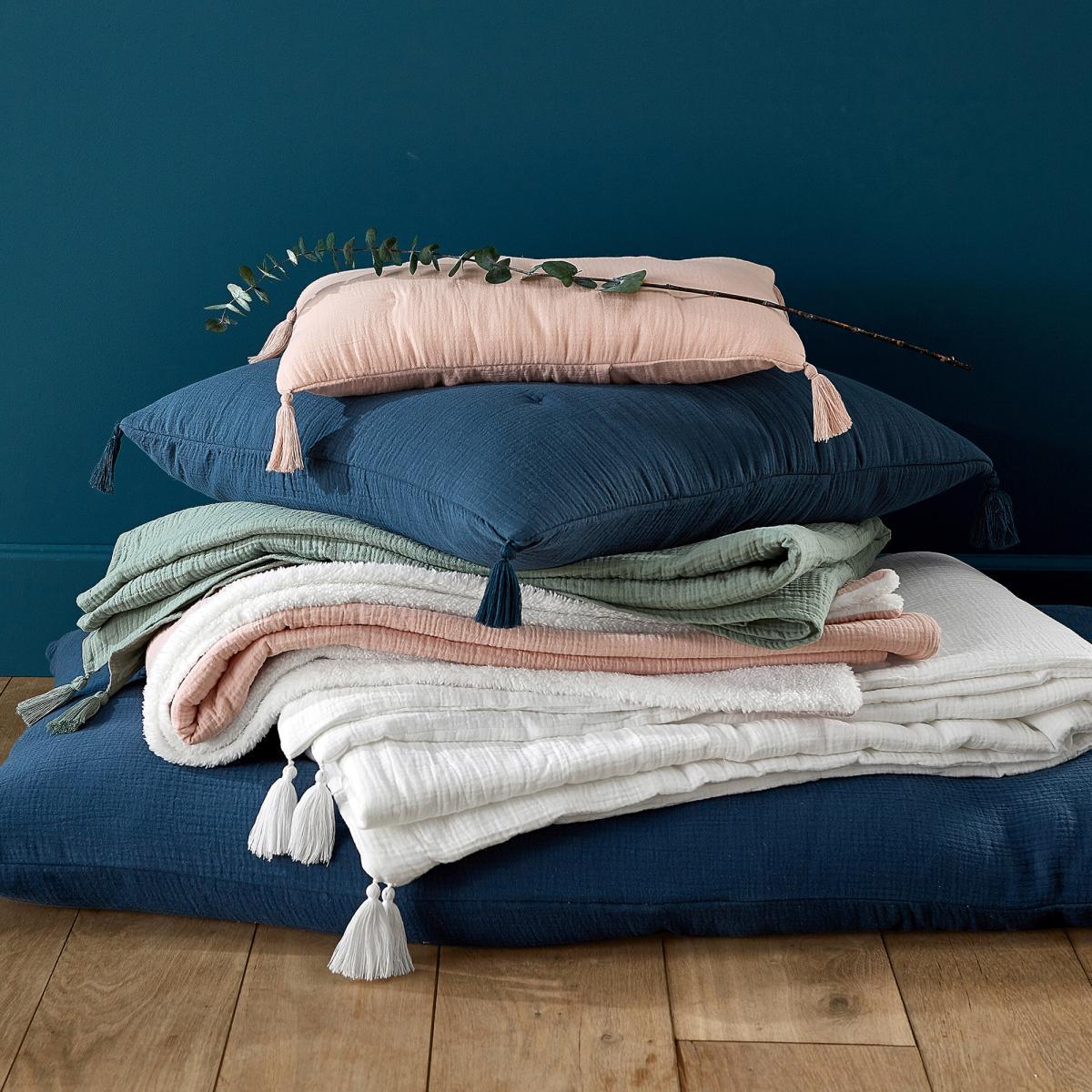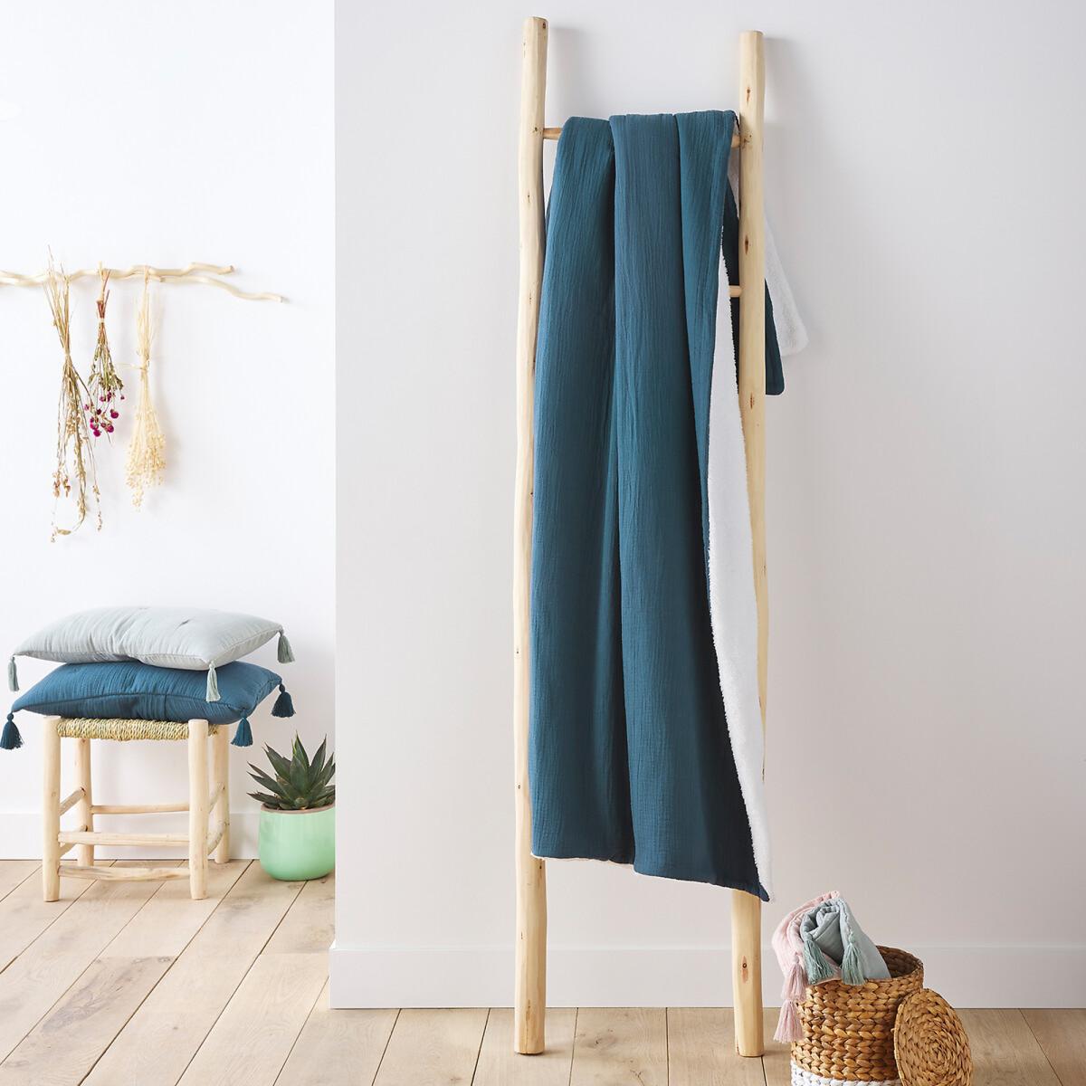 I love this throw for its cosy yet versatile appeal-it pairs well with both contemporary and rustic interiors. The cotton muslin and fleece blend makes it perfect for adding warmth without heaviness, making it ideal for layering on sofas or beds. A great styling tip is to drape it over the arm of a sofa or neatly fold it on a bed to introduce colour and texture effortlessly. Its deep blue shade adds richness to neutral palettes, and it works particularly well in casual or boho spaces, where natural textures and relaxed accents are key. Practical and stylish, this throw is perfect for bringing a touch of comfort and colour to any living room or bedroom.
