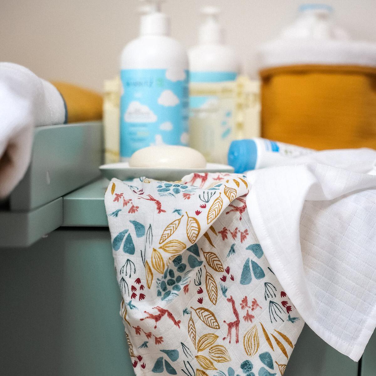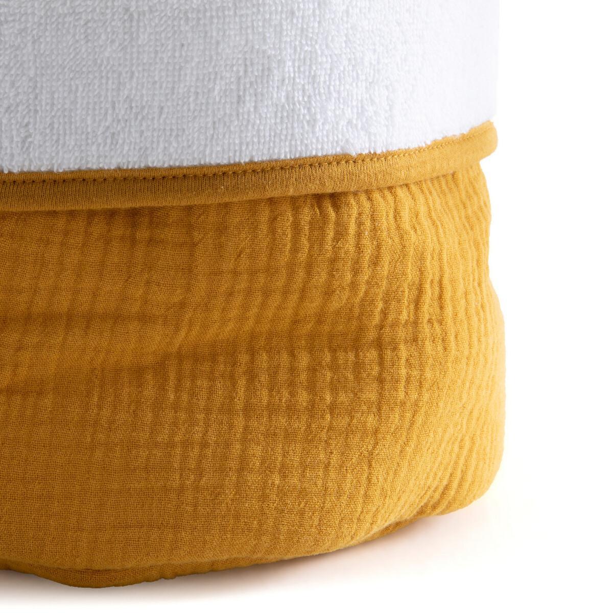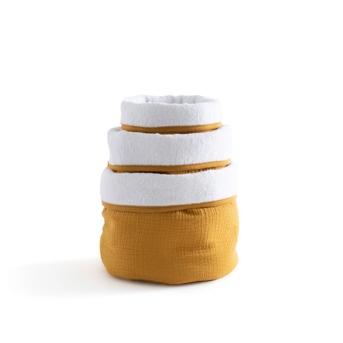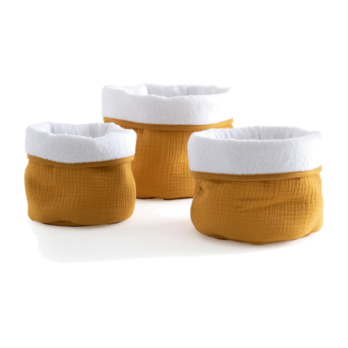 Pretty and practical. Made of cotton muslin with a terrycloth interior, these 3 light baskets offer great storage for a baby's room. They can be suitable as storage next to your changing table or in the bathroom for