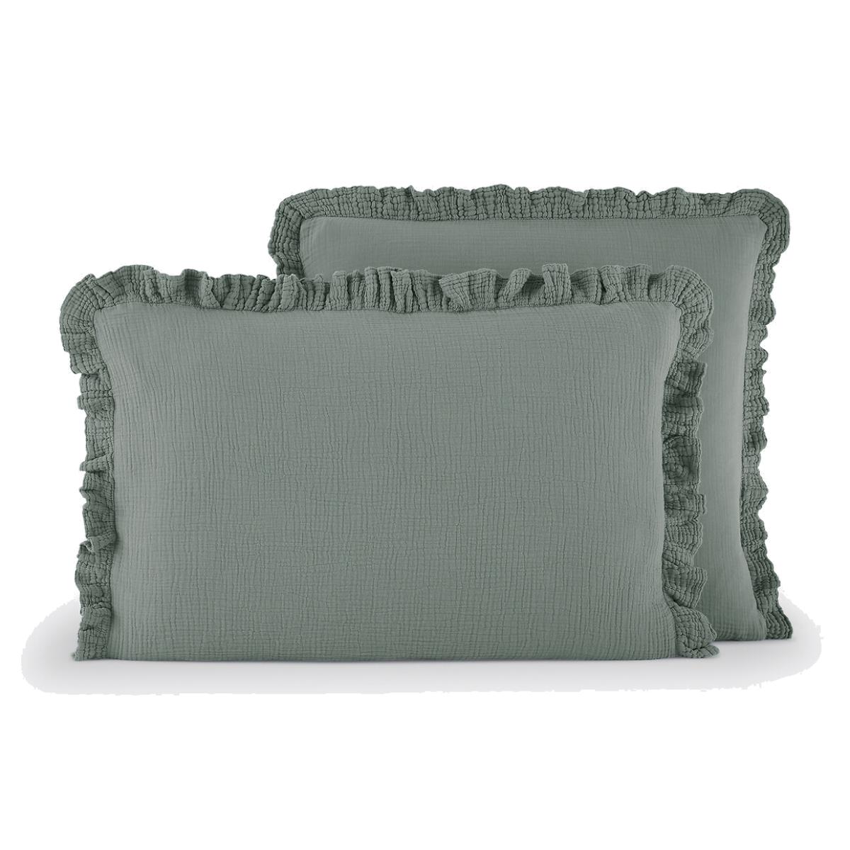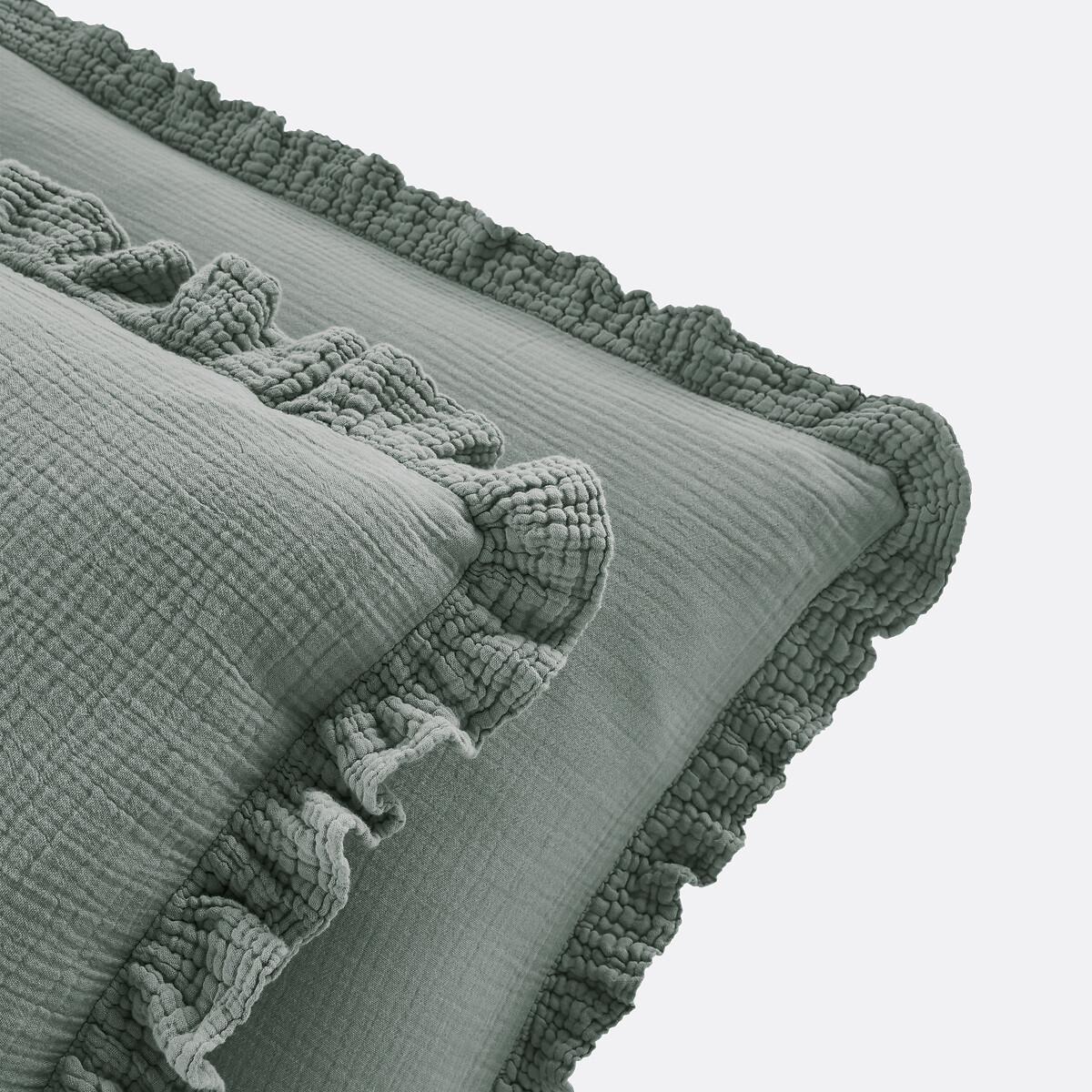 Available in very contemporary colours, the Kumla cotton gauze pillowcase with frill gives a cosy and warm atmosphere to your child's bedroom.. Cotton muslin is light, supple and super soft. Delicately embossed, it does not require ironing. Product Details • 100% cotton • Cotton muslin • 5cm ruffle. Care Advice • Machine washable at 60°C • By washing your laundry at 40°C instead of 60°C, you limit energy consumption • Product will regain its texture after tumble drying • The cotton muslin may show slight marks due to packaging creases. We recommend that you wash the product as soon as you receive it, and then tumble dry it to restore its look and the beautiful waffle effect. Dimensions • 50 x 70cm: Rectangular pillowcase • 63 x 63cm: Square pillowcase • MADE IN PORTUGAL. • OEKO-TEX® Standard 100. Standard 100 certification by OEKO-TEX® tests textile products for harmful substances via an independent, international label.