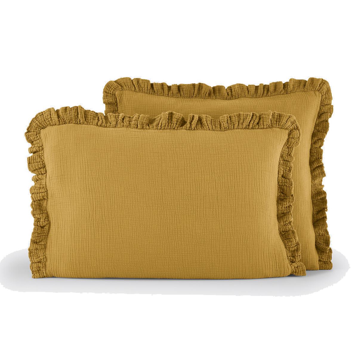 Available in very contemporary colours, the Kumla cotton gauze pillowcase with frill gives a cosy and warm atmosphere to your child's bedroom.. Cotton muslin is light, supple and super soft. Delicately embossed, it does not require ironing. Product Details • 100% cotton • Cotton muslin • 5cm ruffle. Care Advice • Machine washable at 60°C • By washing your laundry at 40°C instead of 60°C, you limit energy consumption • Product will regain its texture after tumble drying • The cotton muslin may show slight marks due to packaging creases. We recommend that you wash the product as soon as you receive it, and then tumble dry it to restore its look and the beautiful waffle effect. Dimensions • 50 x 70cm: Rectangular pillowcase • 63 x 63cm: Square pillowcase • MADE IN PORTUGAL. • OEKO-TEX® Standard 100. Standard 100 certification by OEKO-TEX® tests textile products for harmful substances via an independent, international label.