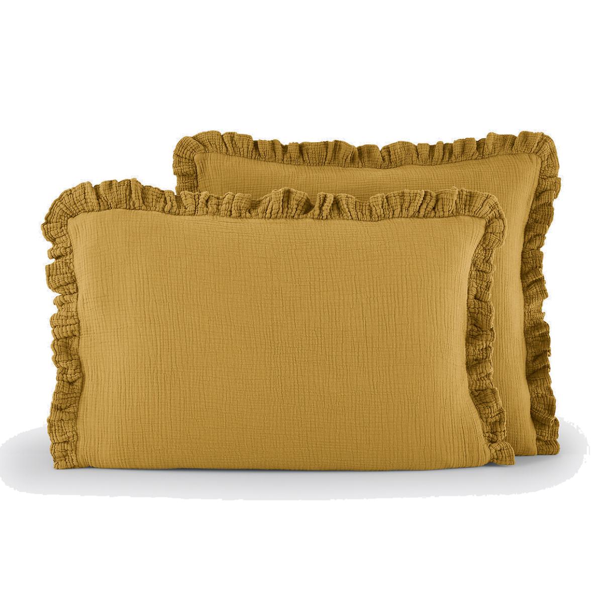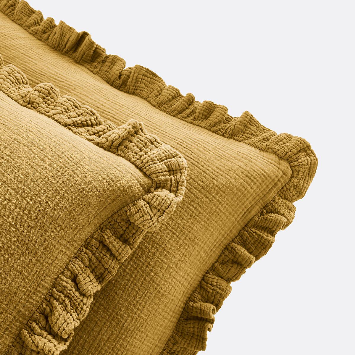 Available in very contemporary colours, the Kumla ruffled pillowcase in cotton muslin gives a cosy and warm atmosphere to the bedroom.. Cotton muslin is light, supple and super soft. Delicately embossed, it does not require ironing. Product Details • 100% cotton • Cotton muslin • 5cm ruffle. Care Advice • Machine washable at 60°C • By washing your laundry at 40°C instead of 60°C, you limit energy consumption • Product will regain its texture after tumble drying • The cotton muslin may show slight marks due to packaging creases. We recommend that you wash the product as soon as you receive it, and then tumble dry it to restore its look and the beautiful waffle effect. Dimensions • 50 x 70cm: Rectangular pillowcase • Square pillowcase (63 x 63cm) :Square pillowcase • MADE IN PORTUGAL. • OEKO-TEX® Standard 100. Standard 100 certification by OEKO-TEX® tests textile products for harmful substances via an independent, international label.