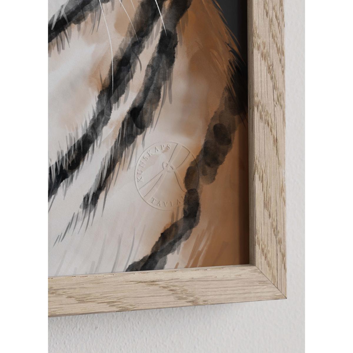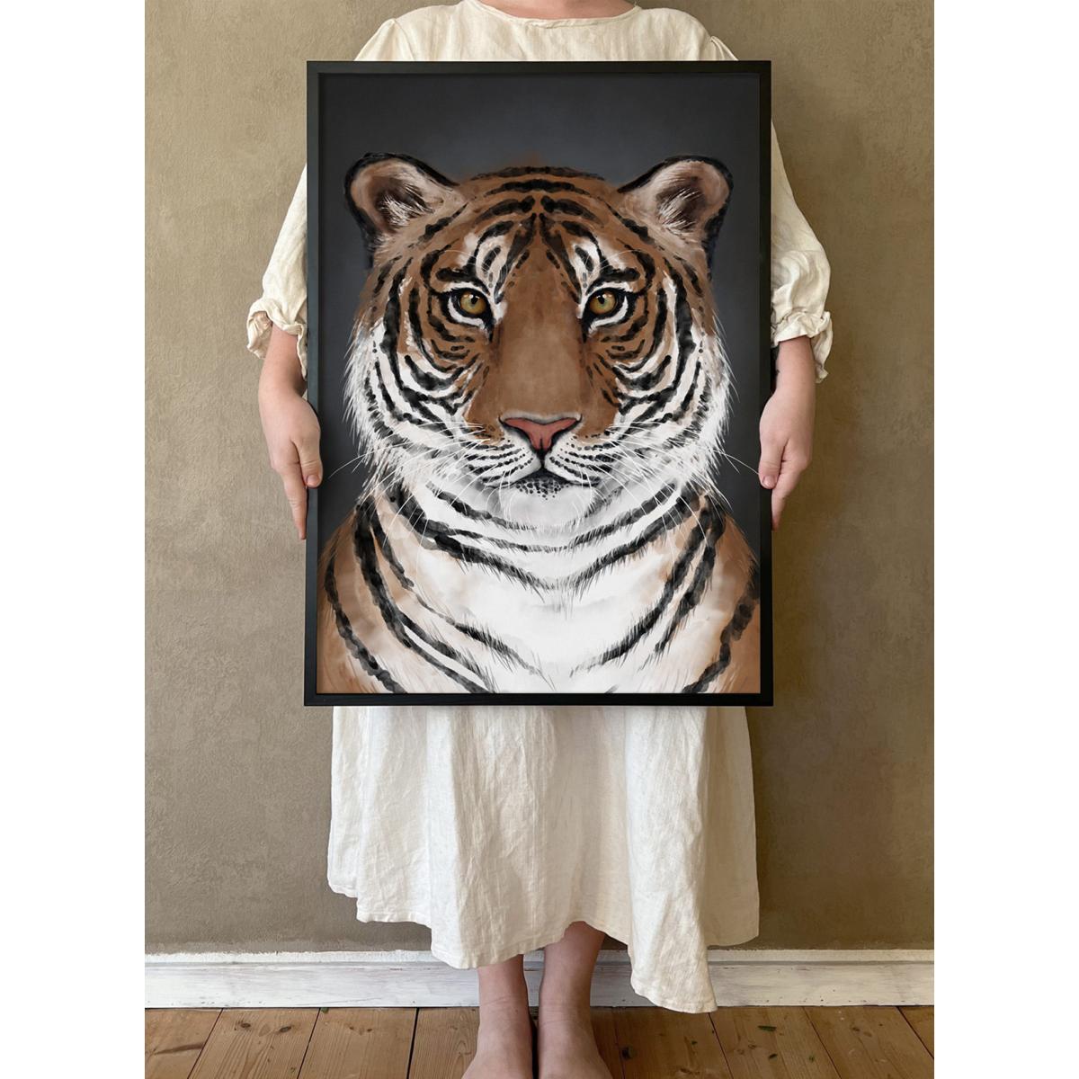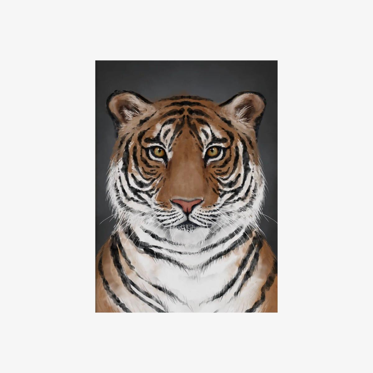 I love this tiger print for adding a bold, striking focal point to any room. Its realistic yet vibrant depiction makes it versatile, working well in contemporary, minimalist spaces or more eclectic, adventurous interiors. It’s particularly effective when paired with neutral tones or natural textures like wood and woven accents, as it provides a powerful visual anchor without overwhelming the space. For practical styling, consider framing it in a simple, understated frame to keep the focus on the artwork, and hang it at eye level for maximum impact. This piece is great in living rooms, bedrooms, or even hallways where it can be appreciated up close.