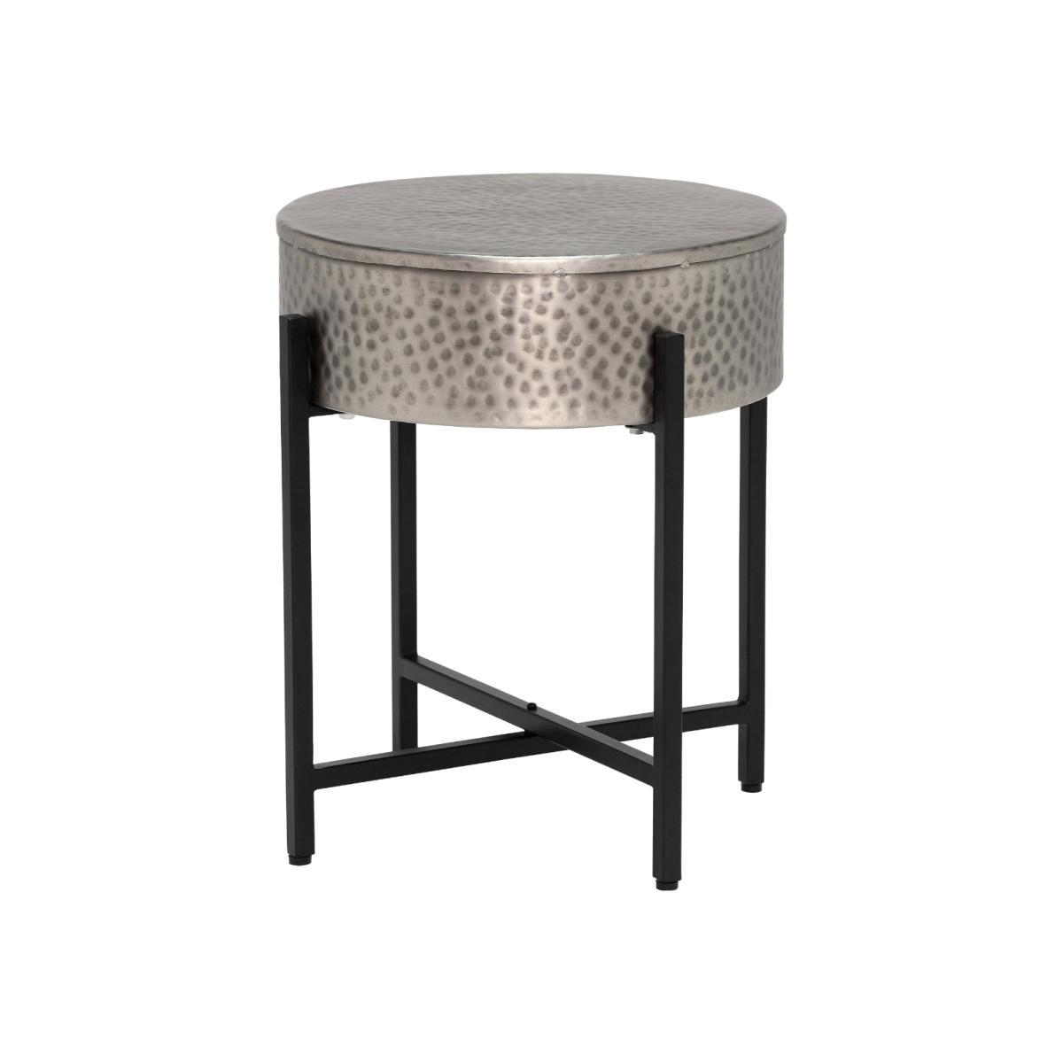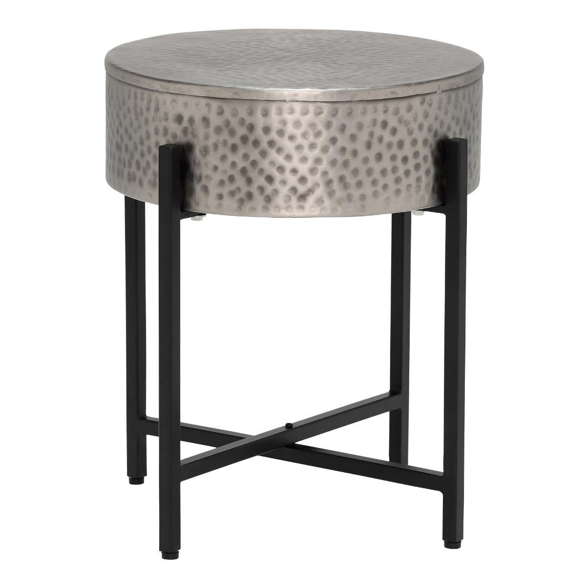 Design. For a unique look in your home, opt for the Kushma Side Table. A lovely piece with an urban feel, Kushma displays an eclectic tabletop with hammered metal detailing and is supported by a black metal frame.