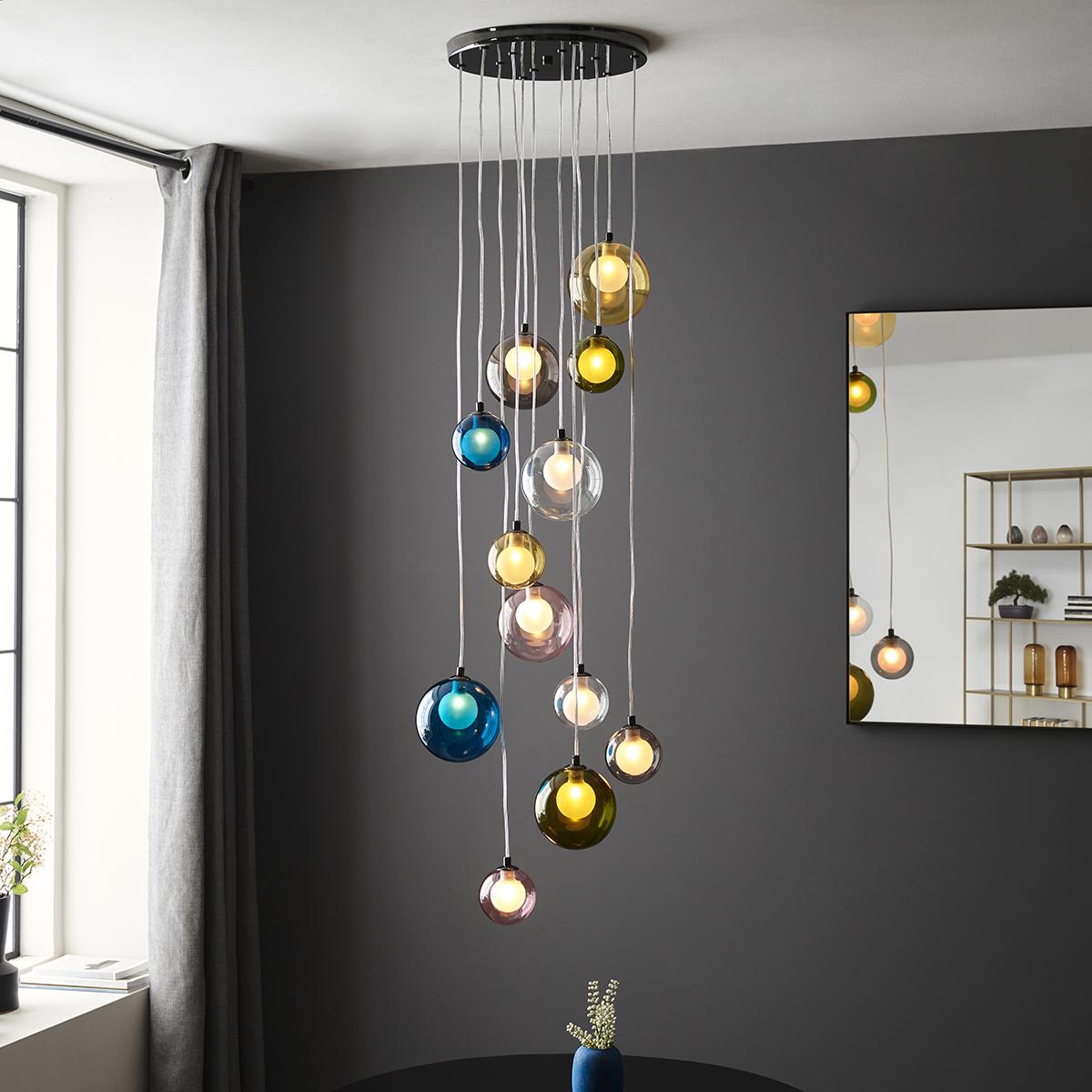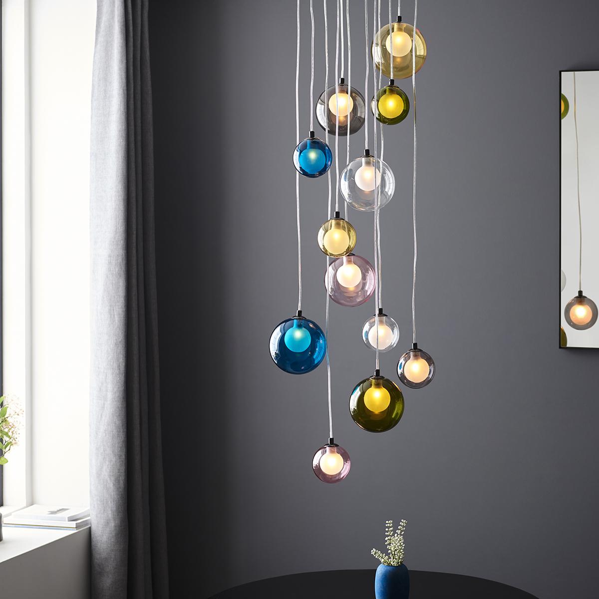 I love the Kwan 12 Light Cluster Pendant for its playful yet modern aesthetic, making it a versatile choice for various interiors. It works particularly well in contemporary and eclectic spaces, adding colour and visual interest without overwhelming the surroundings. Practical styling tips include pairing it with neutral wall colours to let the multi-coloured glass pop, or using it as a statement feature in a minimalist kitchen or living area. Make sure to hang it at a height that showcases its full cluster effect, and consider using warm LED bulbs to enhance the soft glow of the coloured glass for a cosy, inviting atmosphere.