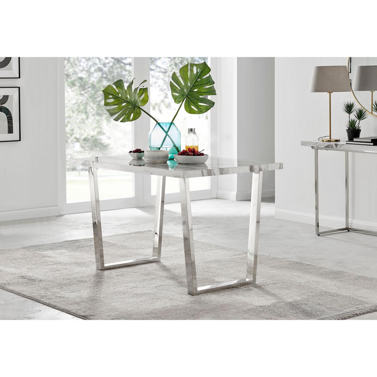 The Kylo collection features a large rectangular table top which has plenty of space for laying our an impressive spread for friends and family. This 120cm 4 seat version is ideal if you love hosting guests for dinner. Our favourite part of the Kylo dining table is the u-shaped metal legs which are beautifully finished here in a silver chrome finish for an ultra modern look. The white marble effect high gloss table top is not only beautiful but also practical and easy to clean thanks to its smooth surface which wipes clean. The subtle grey marbling gives you the aesthetic of marble without the price tag! This is a wow factor dining table for your dining room.