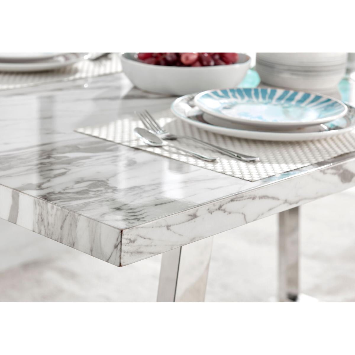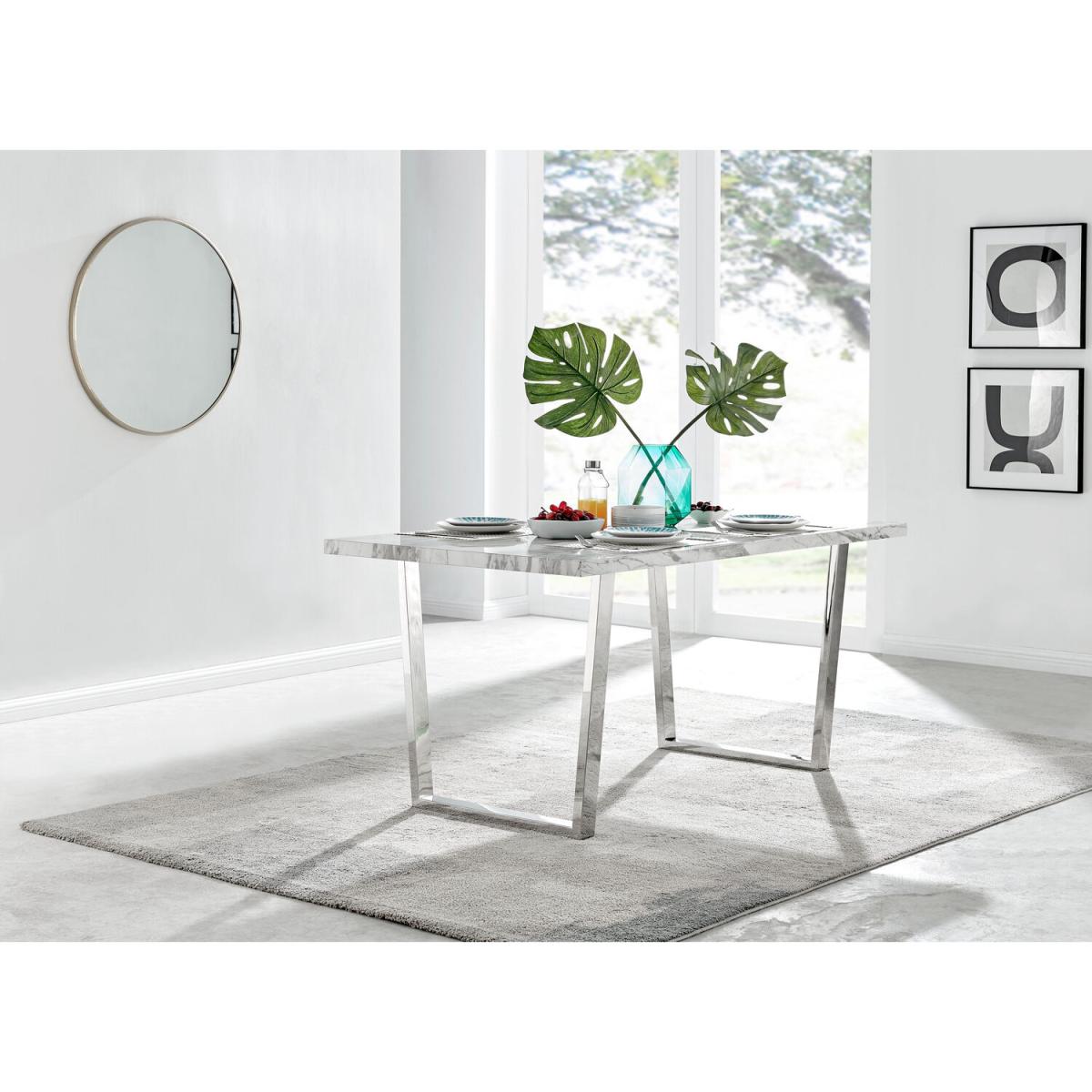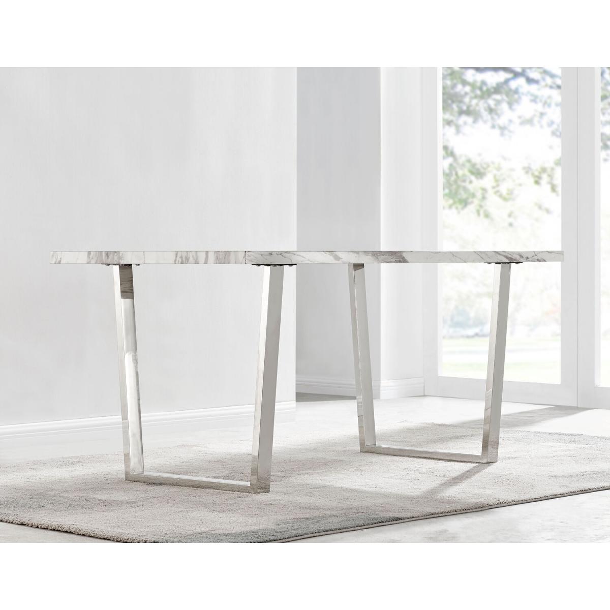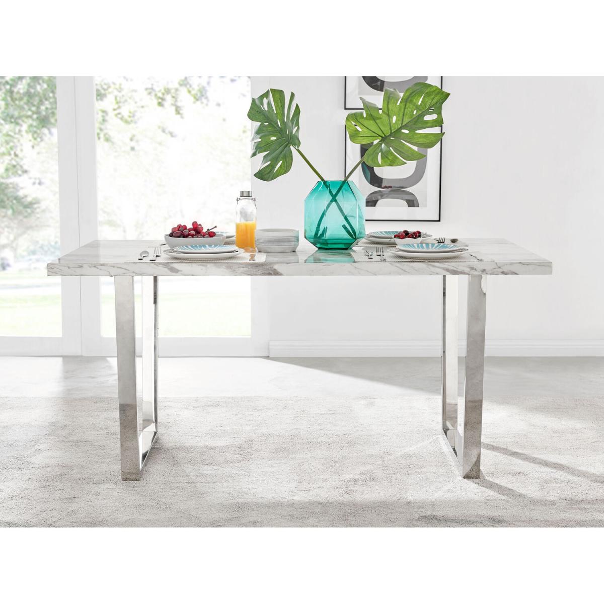 The Kylo collection features a large rectangular table top which has plenty of space for laying our an impressive spread for friends and family. This 160cm 6 seat version is ideal if you love hosting guests for dinner. Our favourite part of the Kylo dining table is the u-shaped metal legs which are beautifully finished here in a silver chrome finish for an ultra modern look. The white marble effect high gloss table top is not only beautiful but also practical and easy to clean thanks to its smooth surface which wipes clean. The subtle grey marbling gives you the aesthetic of marble without the price tag! This is a wow factor dining table for your dining room.