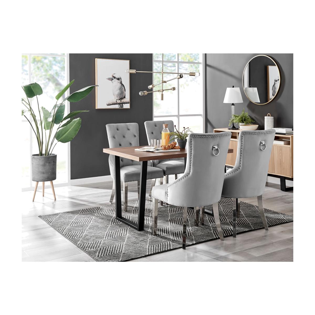 The Kylo collection features a large rectangular table top which has plenty of space for laying our an impressive spread for friends and family. This 120cm 4 seat version is ideal if you love hosting guests for dinner. Our favourite part of the Kylo dining table is the u-shaped black metal legs which provide an industrial dining set look. The brown wood veneer effect table top is not only beautiful but also practical and easy to clean thanks to its smooth surface which wipes clean. This is a wow factor dining table for your dining room. The Belgravia knocker chair is the ultimate in dining chair opulence with its scoop back design that allows you and your guests to lean back and feel supported by the wrap-around arms. Stylish Chesterfield-inspired button tufting and diamond stitching add to the modern chic look. The design gives us straight lines and soft padded curves contemporary and comfortable. The thick filled seat cushion is supportive and comfortable and is complemented by the velvet fabric. These ultra-modern chairs have subtle chrome button detailing along the trim of the seat and around the back of the chair which compliments beautifully with the legs and knocker. The highlight of the Belgravia chair is the chrome knocker on the back of the chair which is a popular feature for both modern and traditional dining rooms. Anyone for a lovely dinner party or some cocktails sat in one of these! We're in love! The Kylo collection features a large rectangular table top which has plenty of space for laying our an impressive spread for friends and family. This 120cm 4 seat version is ideal if you love hosting guests for dinner. Our favourite part of the Kylo dining table is the u-shaped black metal legs which provide an industrial dining set look. The brown wood veneer effect table top is not only beautiful but also practical and easy to clean thanks to its smooth surface which wipes clean. This is a wow factor dining table for your dining room. The opulent Belgravia chairs provide a touch of luxury, with thickly padded velvet upholstery, and a striking knockerback detail. Anyone for a lovely dinner party or some cocktails