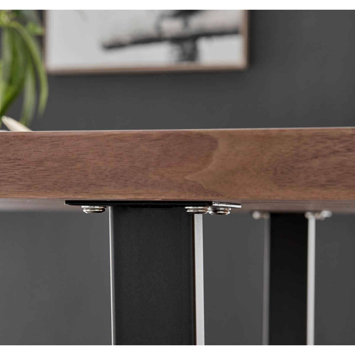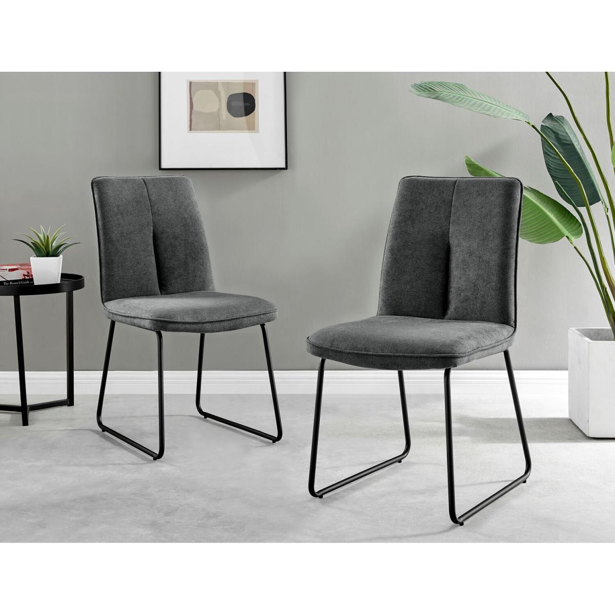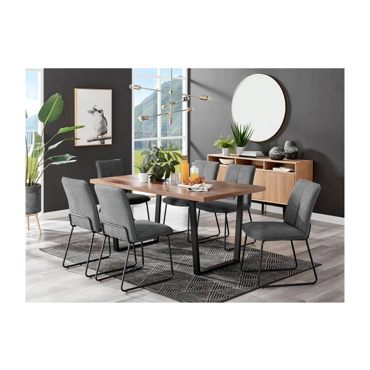 The Kylo collection features a large rectangular table top which has plenty of space for laying our an impressive spread for friends and family. This 160cm 6 seat version is ideal if you love hosting guests for dinner. Our favourite part of the Kylo dining table is the u-shaped black metal legs which provide an industrial dining set look. The brown wood veneer effect table top is not only beautiful but also practical and easy to clean thanks to its smooth surface which wipes clean. This is a wow factor dining table for your dining room. The Halle chair is a super-stylish design with nods to postmodern mid-century classic elements. The clean lines of the deep-padded seat and on-trend industrial metal legs connected front and back with open diamond spaces will keep your dining or living room looking chic and classy. The soft fabric of these dining chairs will add warm tones to your dining room. The black powder coated metal legs have a matte effect which adds an industrial design to these contemporary dining chairs.