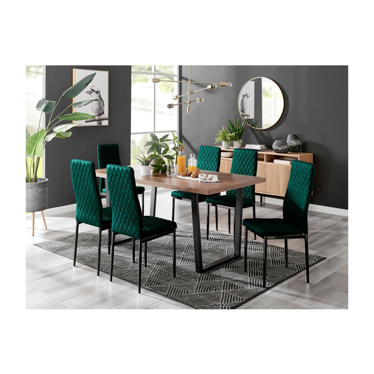 The Kylo collection features a large rectangular table top which has plenty of space for laying our an impressive spread for friends and family. This 160cm 6 seat version is ideal if you love hosting guests for dinner. Our favourite part of the Kylo dining table is the u-shaped black metal legs which provide an industrial dining set look. The brown wood veneer effect table top is not only beautiful but also practical and easy to clean thanks to its smooth surface which wipes clean. This is a wow factor dining table for your dining room. Upholstered in soft touch green velvet and finished with diamond pattern stitching the Milan dining chairs would seamlessly fit in with most dining spaces, whilst not compromising on either style or comfort. The stylish black powder coated metal leg and hatched velvet combination gives this chair a contemporary edge, whilst it's simple design allows for practical everyday usage. The chairs are made from high quality durable velvet that's easy to keep clean and are ergonomically designed for maximum comfort and support. They feature a deep foam seat cushion and plastic feet to protect the floor from any damage! At an unbeatable price you cannot go wrong with these chairs!