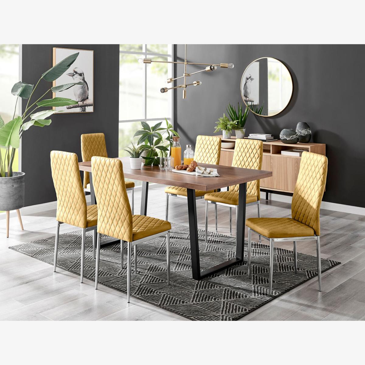 The Kylo collection features a large rectangular table top which has plenty of space for laying our an impressive spread for friends and family. This 160cm 6 seat version is ideal if you love hosting guests for dinner. Our favourite part of the Kylo dining table is the u-shaped black metal legs which provide an industrial dining set look. The brown wood veneer effect table top is not only beautiful but also practical and easy to clean thanks to its smooth surface which wipes clean. This is a wow factor dining table for your dining room. Upholstered in soft touch mustard yellow velvet and finished with diamond pattern stitching the Milan dining chairs would seamlessly fit in with most dining spaces, whilst not compromising on either style or comfort. The stylish shiny chrome silver leg and hatched velvet combination gives this chair a contemporary edge, whilst it's simple design allows for practical everyday usage. The chairs are made from high quality durable velvet that's easy to keep clean and are ergonomically designed for maximum comfort and support. They feature a deep foam seat cushion and plastic feet to protect the floor from any damage! At an unbeatable price you cannot go wrong with these chairs!