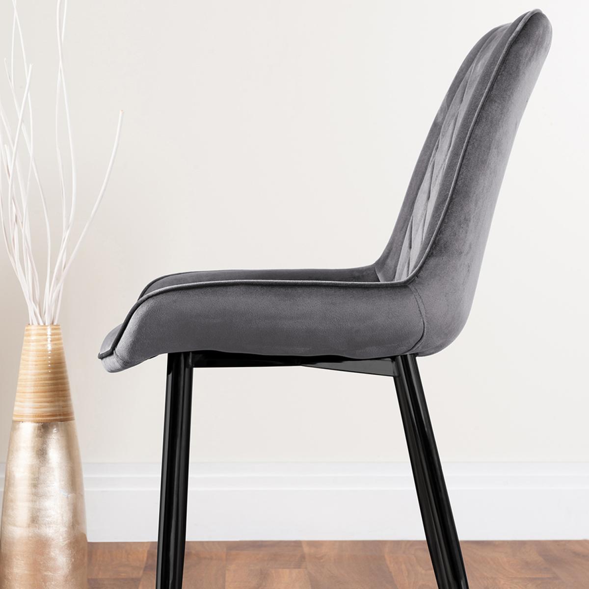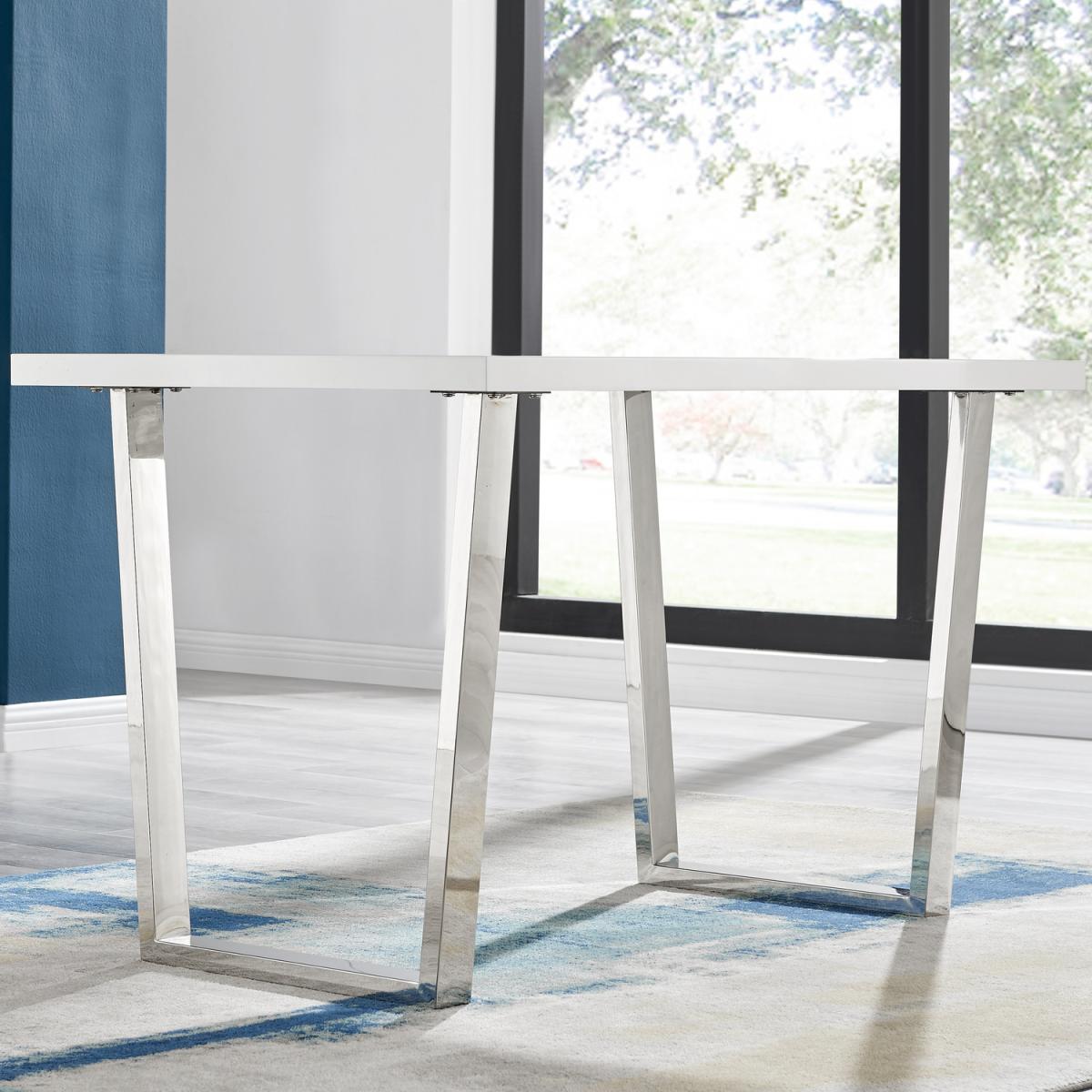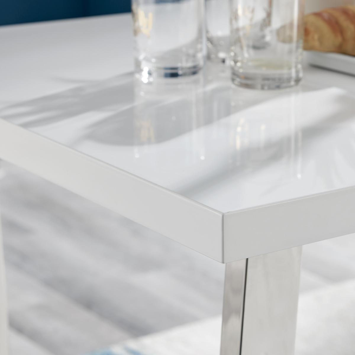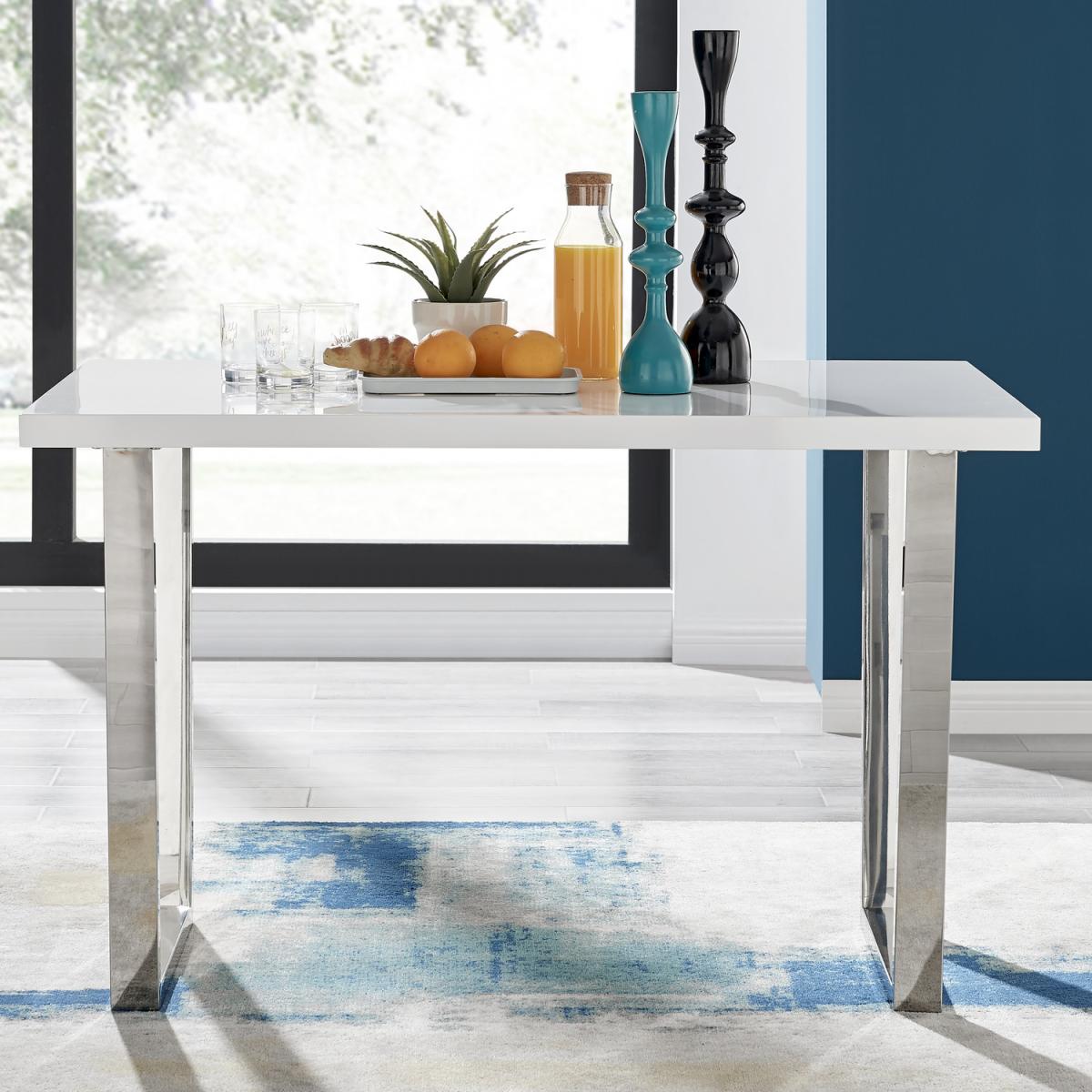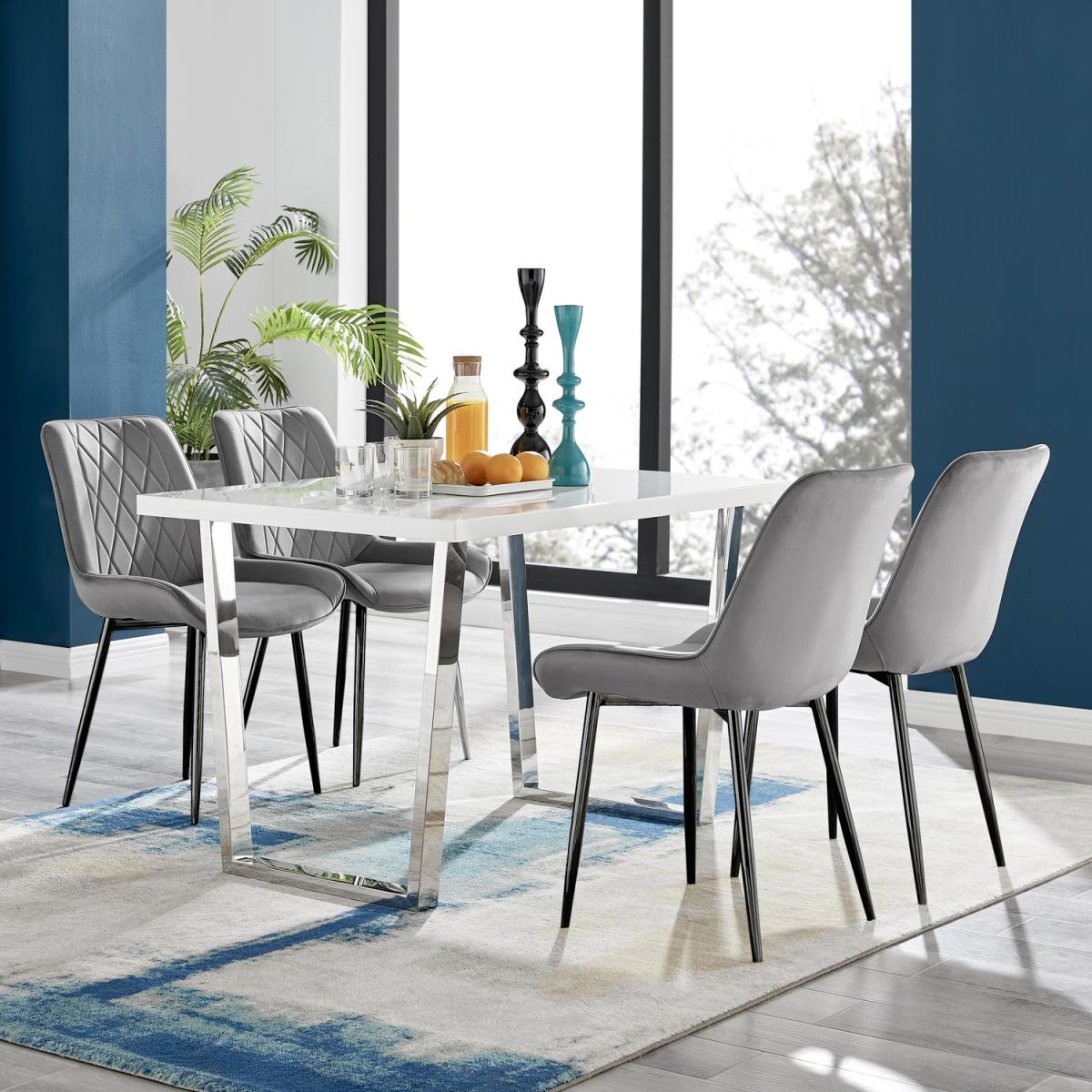 The Kylo collection features a large rectangular tabletop which has plenty of space for laying out an impressive spread for friends and family. This 120cm 4 seat version is ideal if you love hosting guests for dinner. Our favourite part of the Kylo dining table is the u-shaped metal legs which are beautifully finished here in a silver chrome finish for an ultra-modern look. The white high gloss table top is not only beautiful but also practical and easy to clean thanks to its smooth surface which wipes clean. Modernise your dining area with our luxurious velvet upholstered Pesaro Dining Chairs. With a nod to the Mid-century modern design era, the Pesaro features gorgeous textured diamond stitching with an ergonomically designed curved seat pad blending seamlessly to the supporting medium-high backrest. Sat atop elegant slightly tapered legs in black, chrome or gold effect. The Pesaro is a perfect match for any dining table or used as a luxe vanity seat in the bedroom, as an occasional chair for the living area or to add a bit of luxury to your home office. PLEASE NOTE - two of the Pesaro chairs will not be able to fully tuck in between the table legs if placed side-by-side (on the long end of the table)